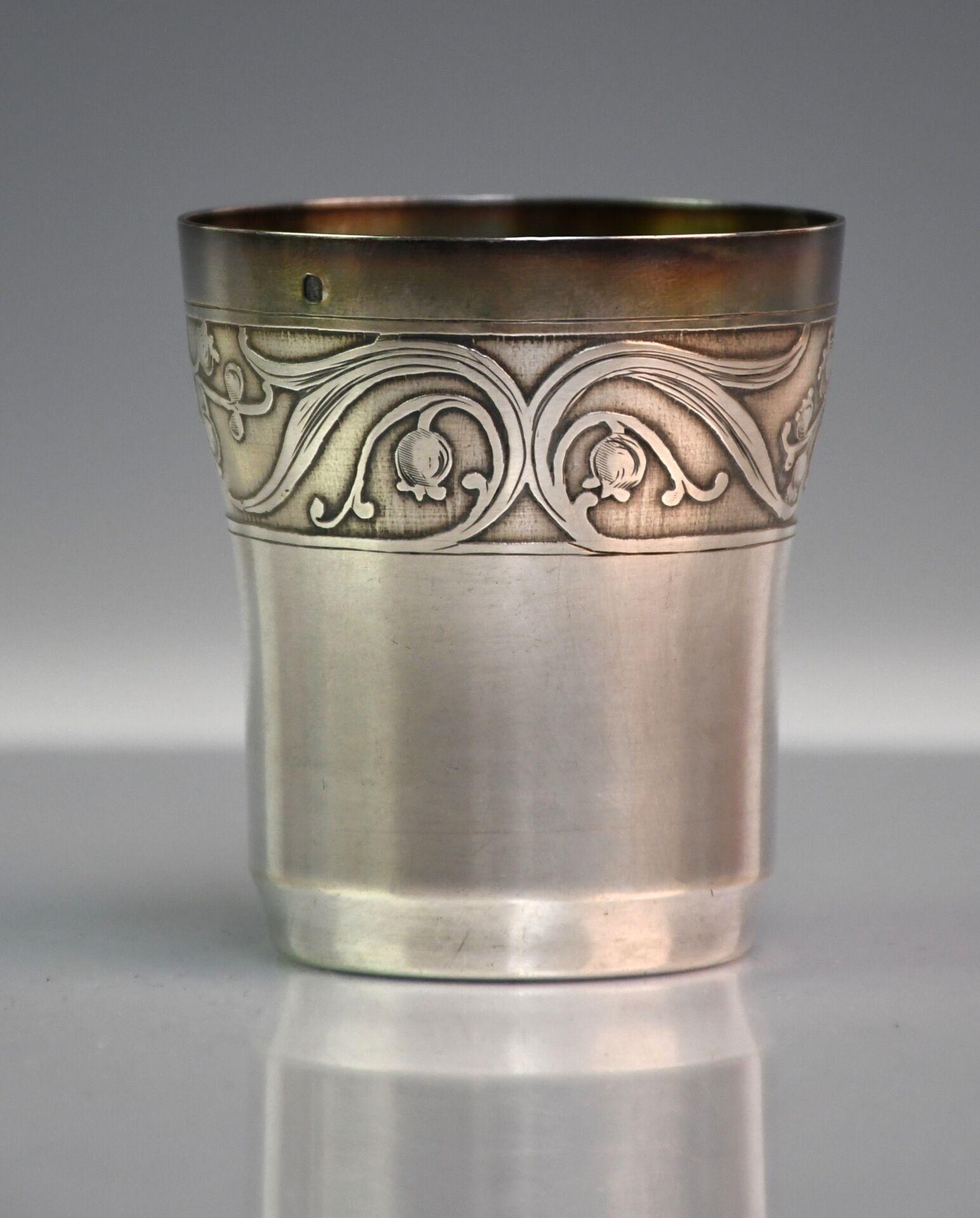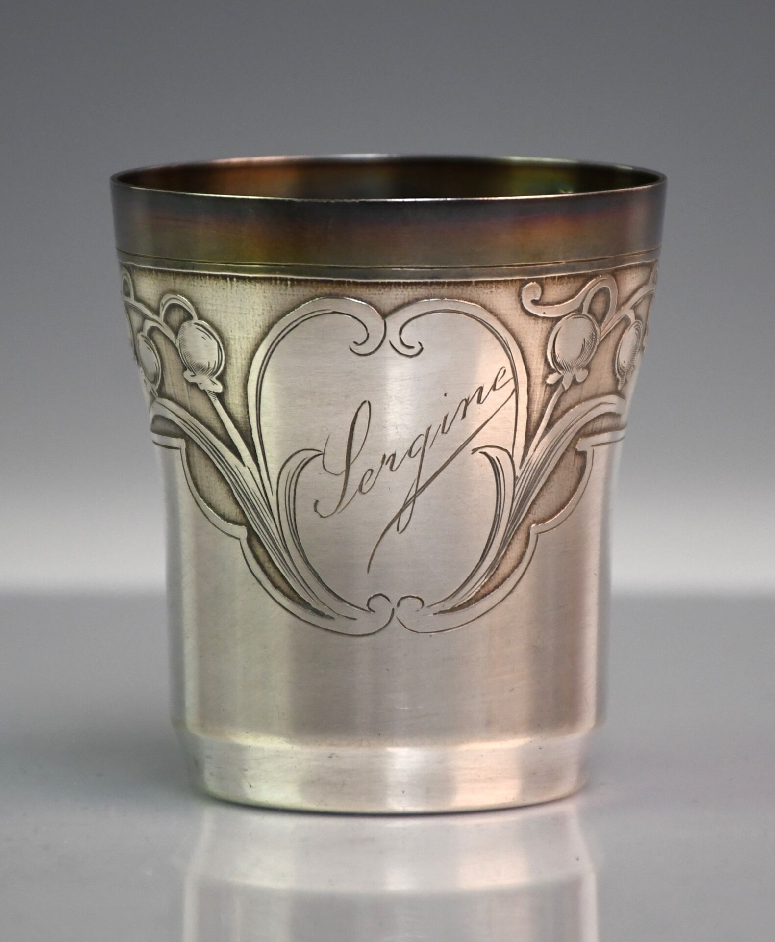Cartouche silver tumbler marked "Sergine" with Art Nouveau decoration