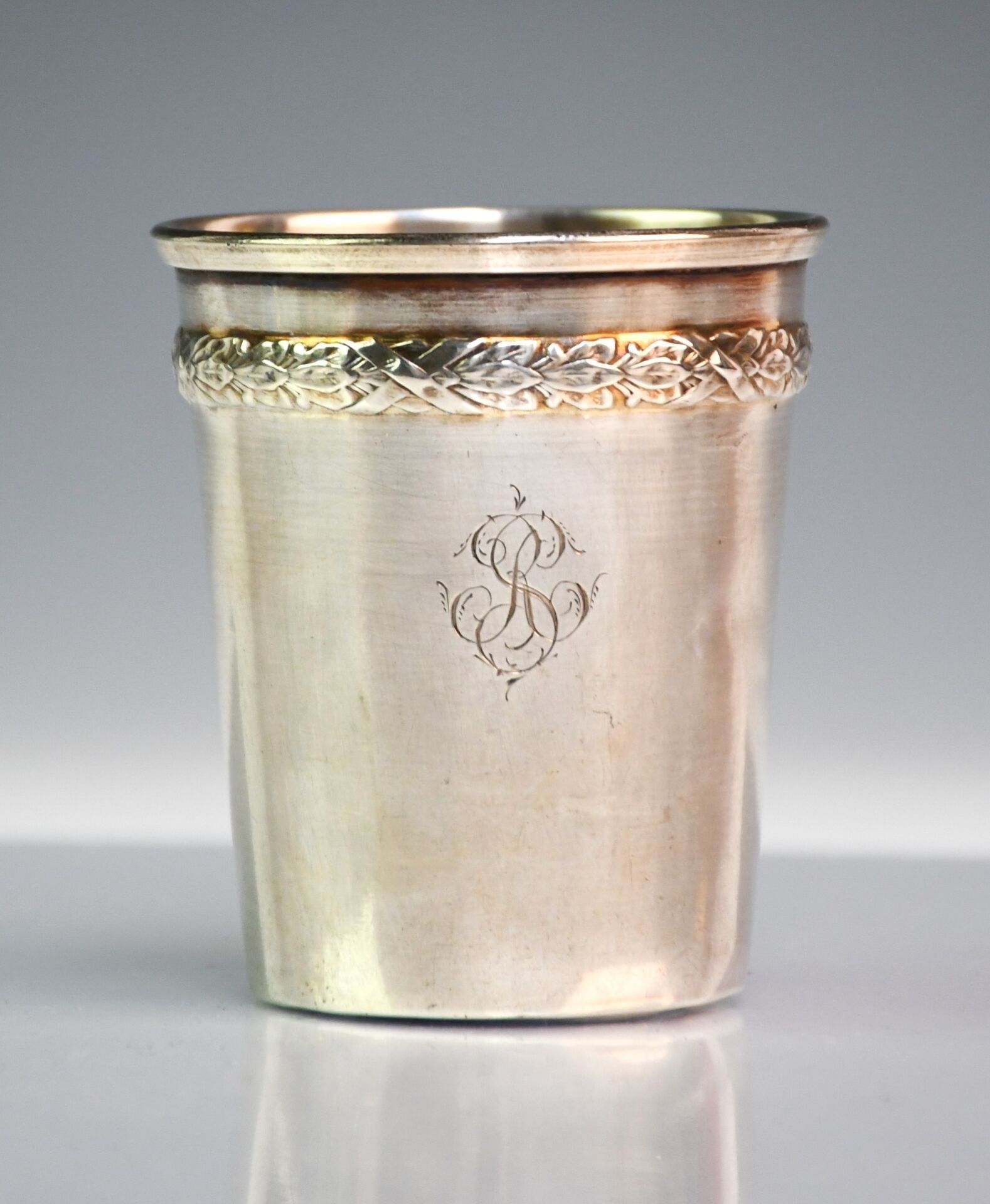 Straight silver tumbler with a neck decorated with a frieze of laurel leaves (small dents)