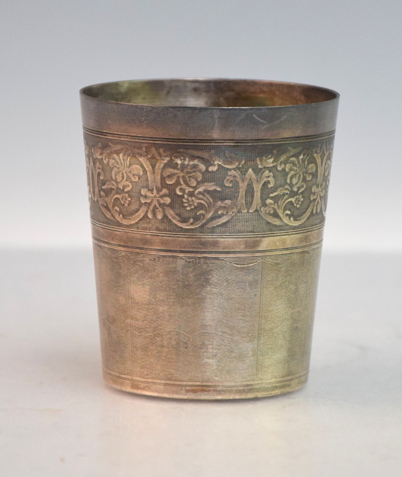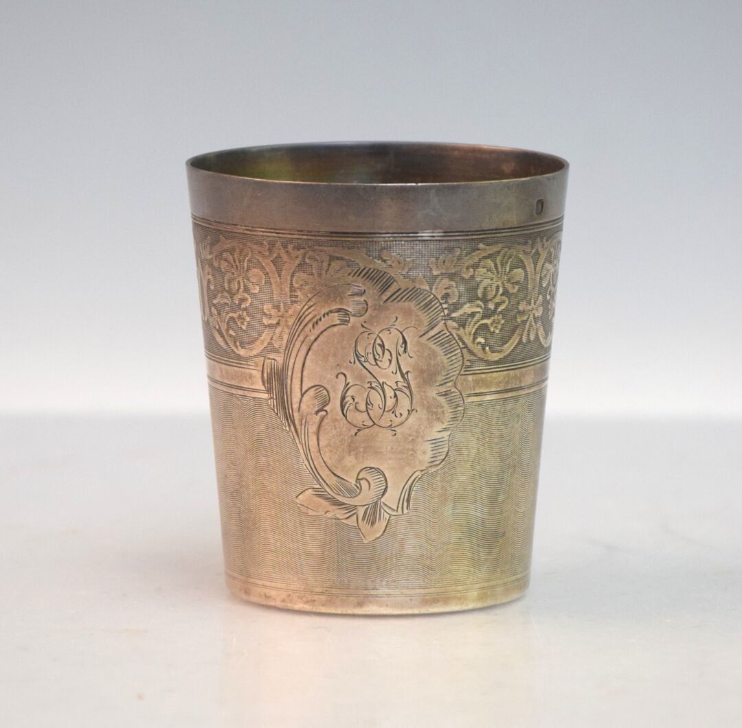 A 950/1000 silver tumbler decorated with a frieze of foliage on a guilloche ground and figured in a rocaille cartouche.