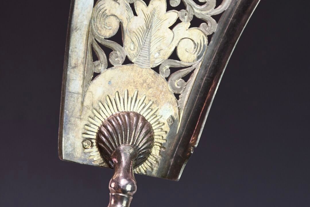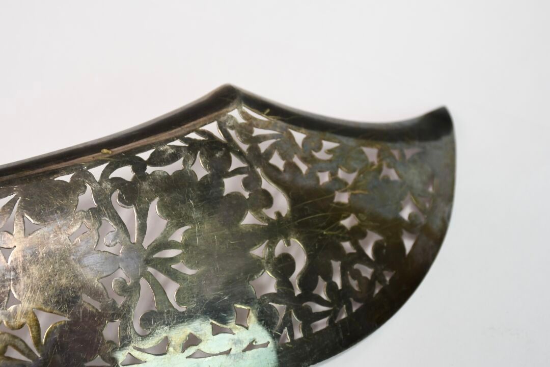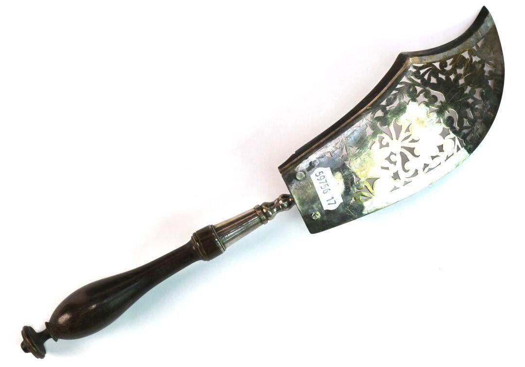 Chased silver fish scoop with openwork foliage and foliate motifs. Turned and blackened wooden handle