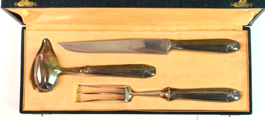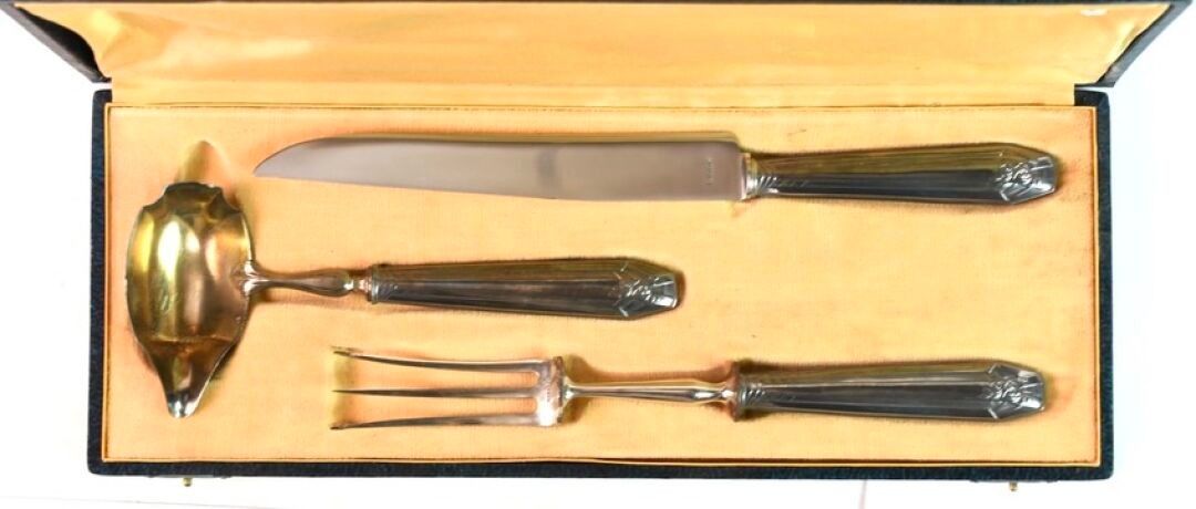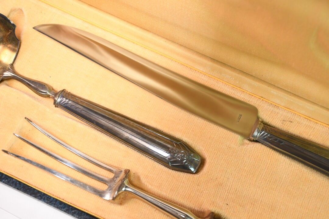 Set of a leg of lamb cutlery and a cream ladle in filled silver and chromed metal.