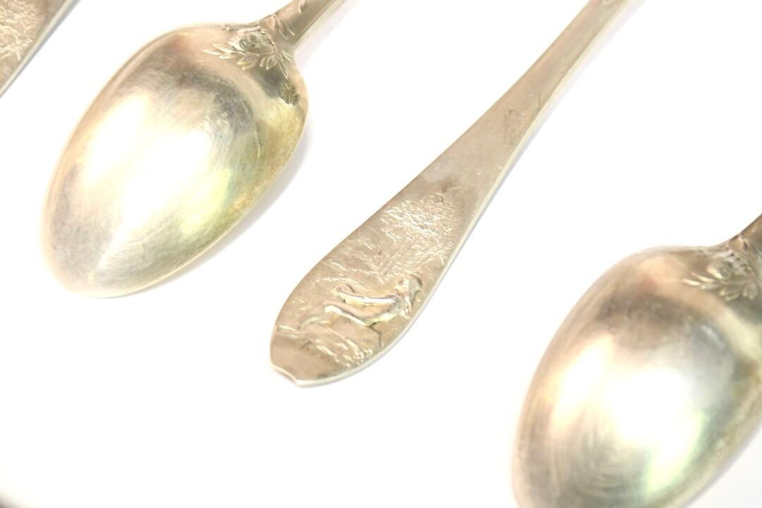 Set of six small 90/1000 silver spoons with vermeil spatula decorated on both sides in light relief with a nude woman seated in a landscape and a view of the Parthenon.