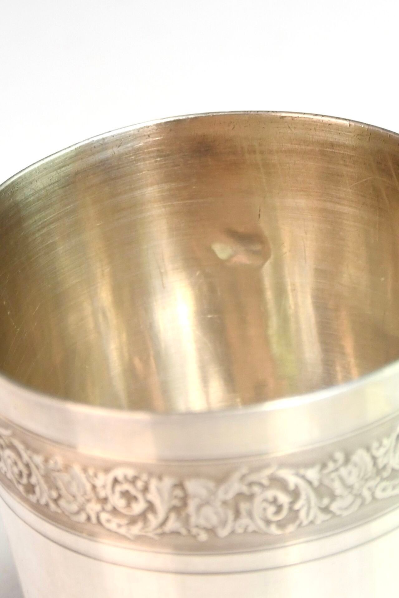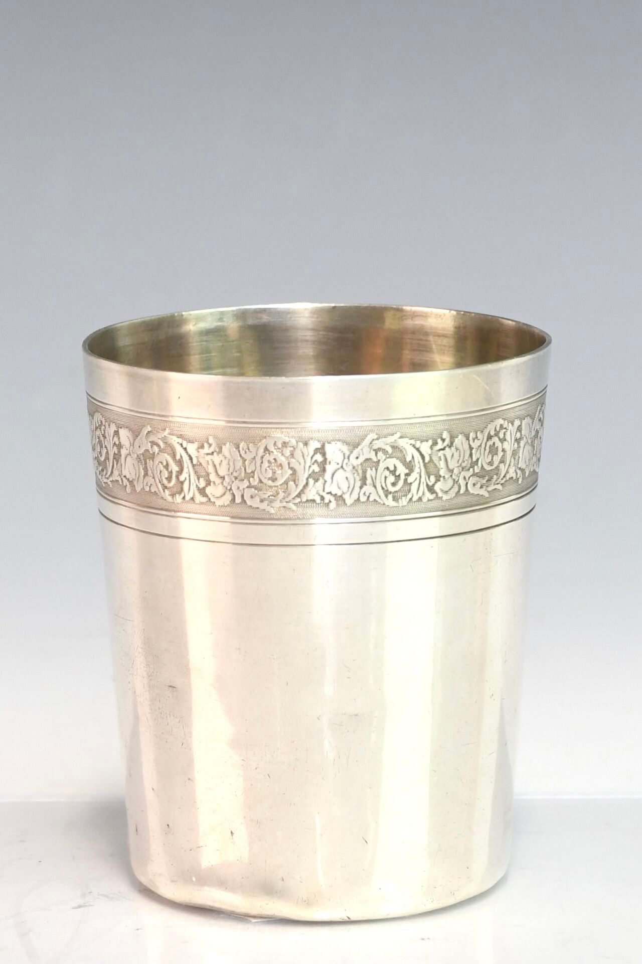 A 950/1000 silver tumbler with guilloché decoration of a frieze of foliage and a blind rocaille cartouche.