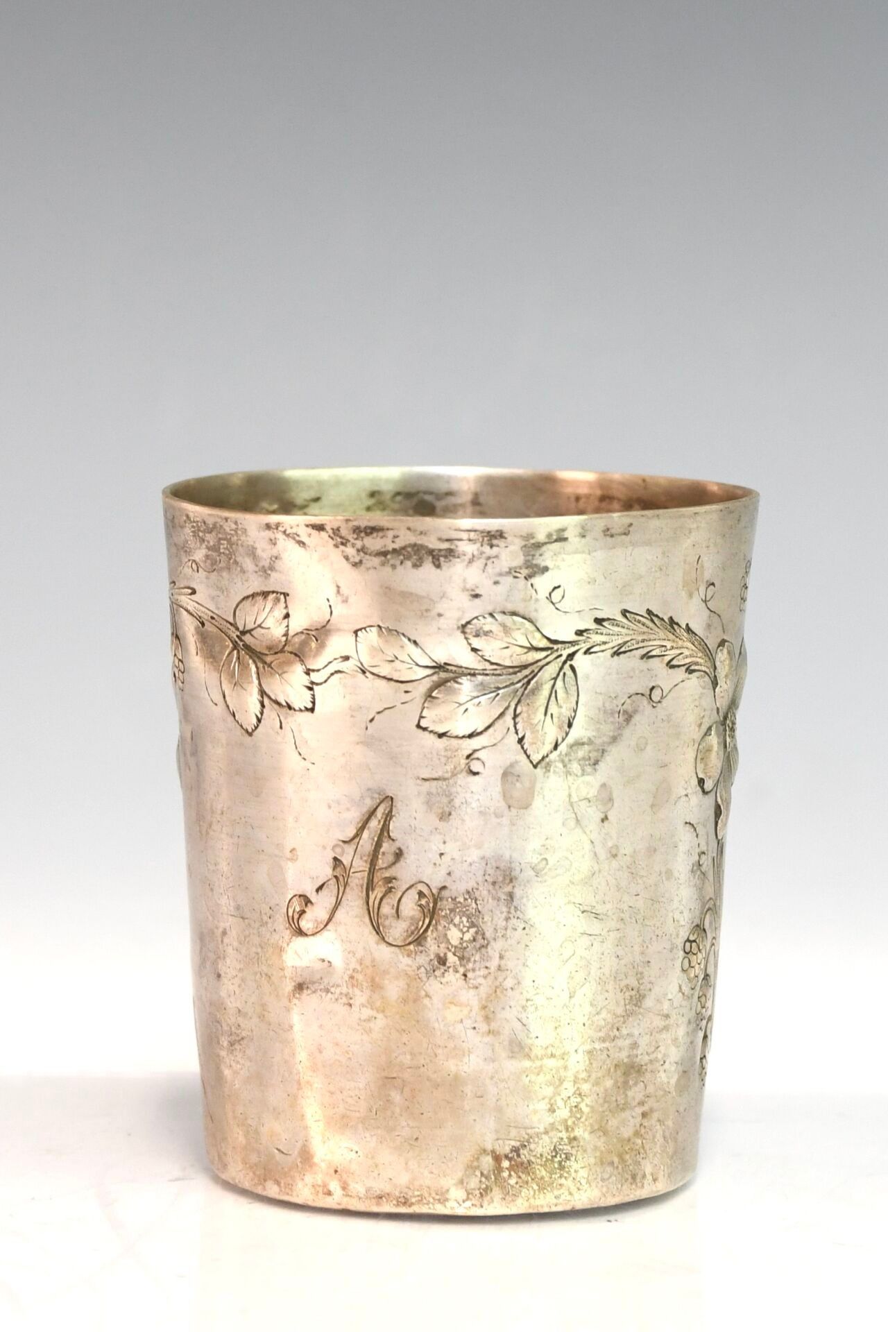 950/1000 silver tumbler with repoussé decoration of flowers, engraved A.