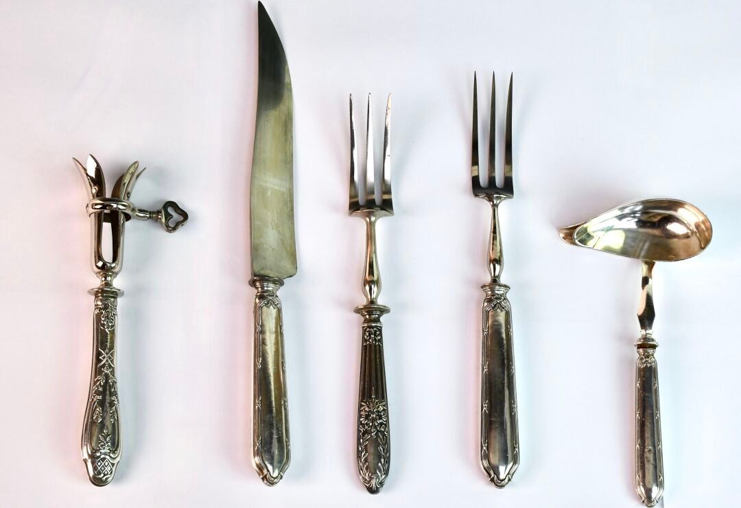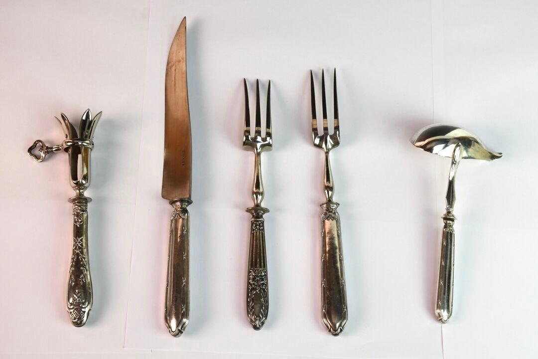 A carving fork and a pair of leg of lamb tongs of different designs in 950/1000 forged silver are included.