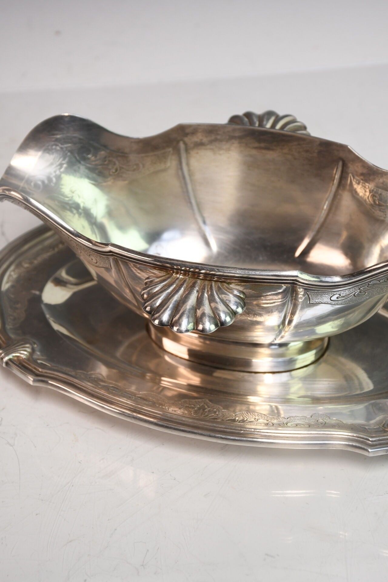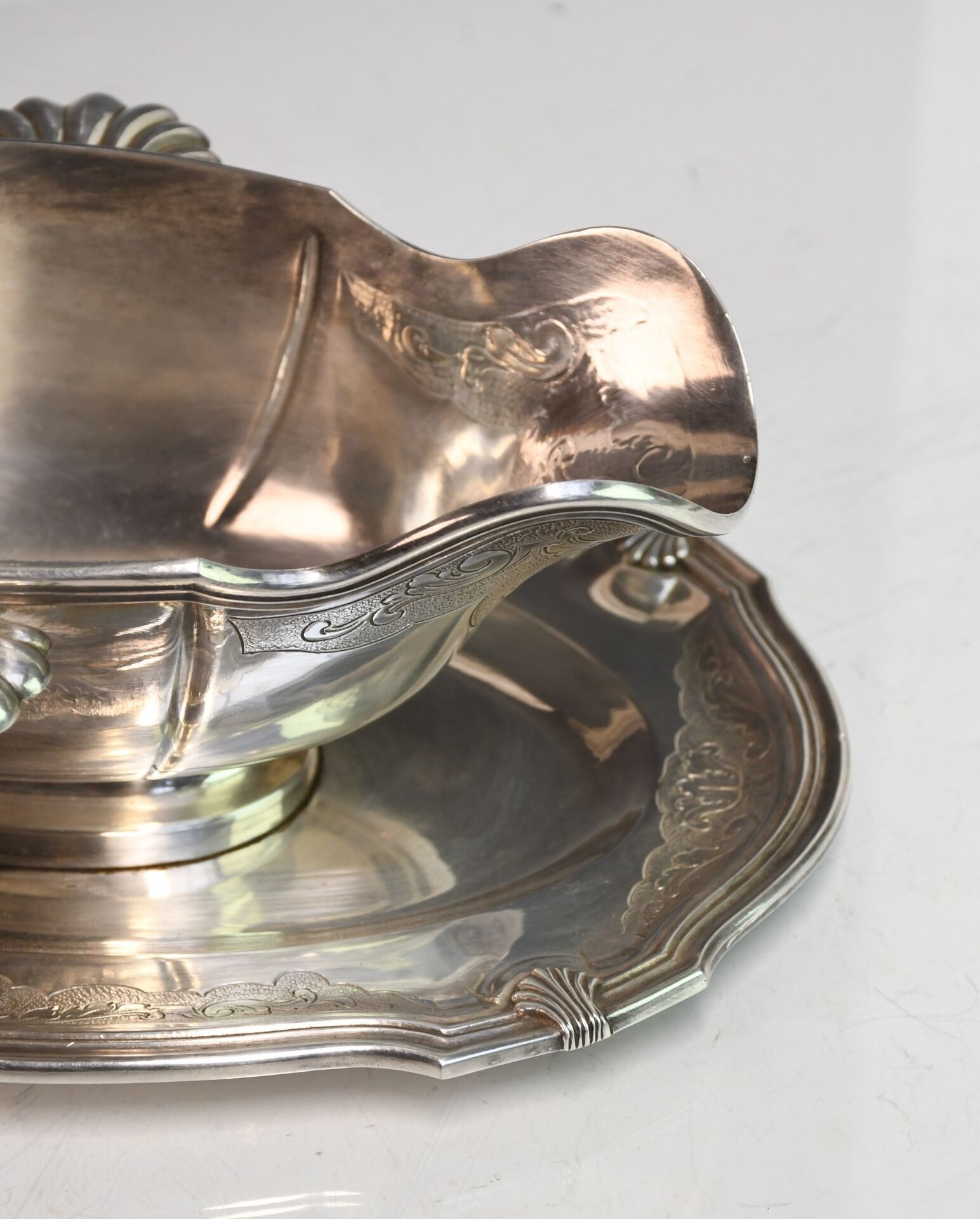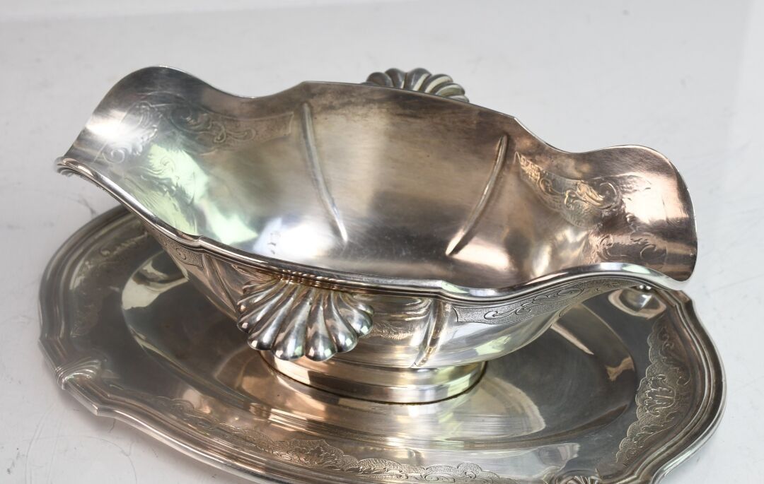A pair of double saucers in silver 800/1000 with hammered foliage decoration.