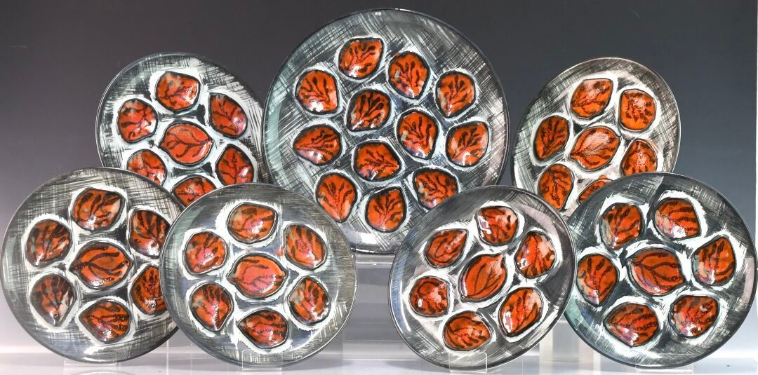Oyster service in glazed earthenware comprising a dish and six plates.