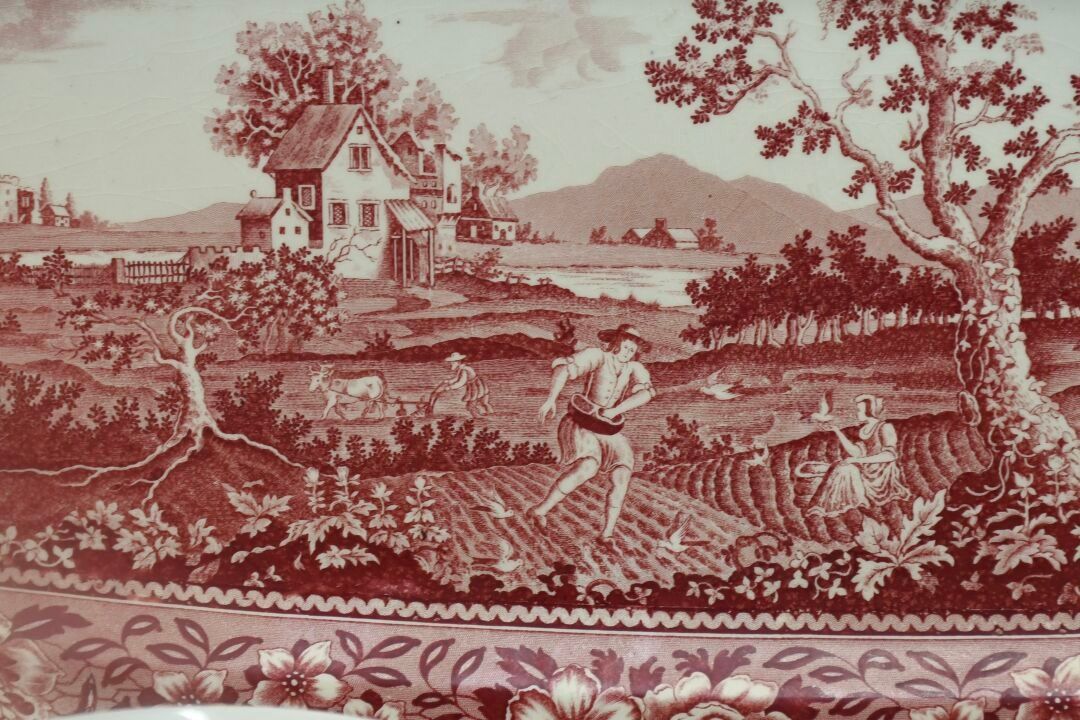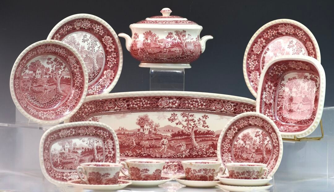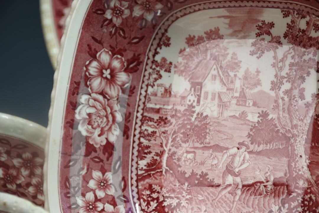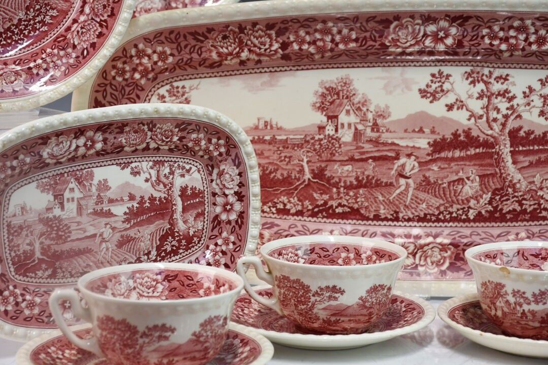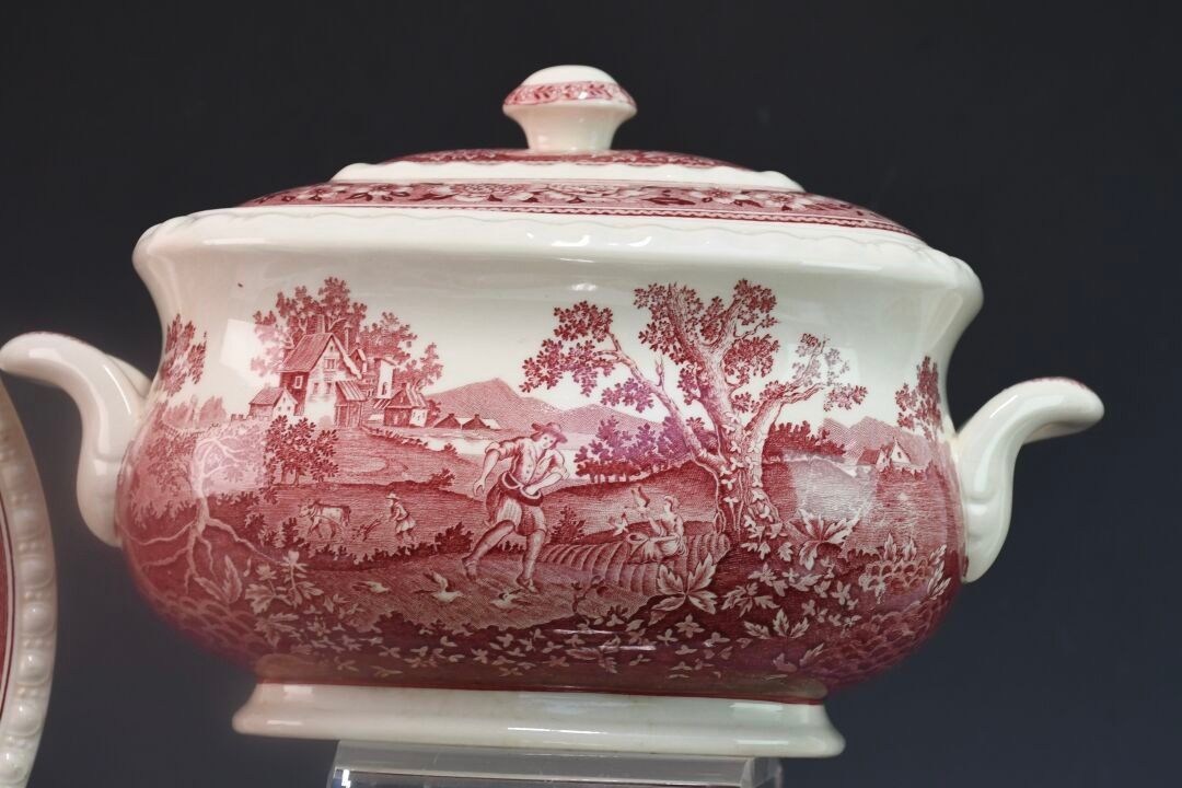 Fine earthenware dinner service decorated with an animated landscape in printed monochrome, comprising four tea cups (chips and cracks) and two saucers, a small tureen, a dessert plate, a soup plate, two dinner plates, a vegetable dish, two coffee saucers, a ravier and a fish dish.