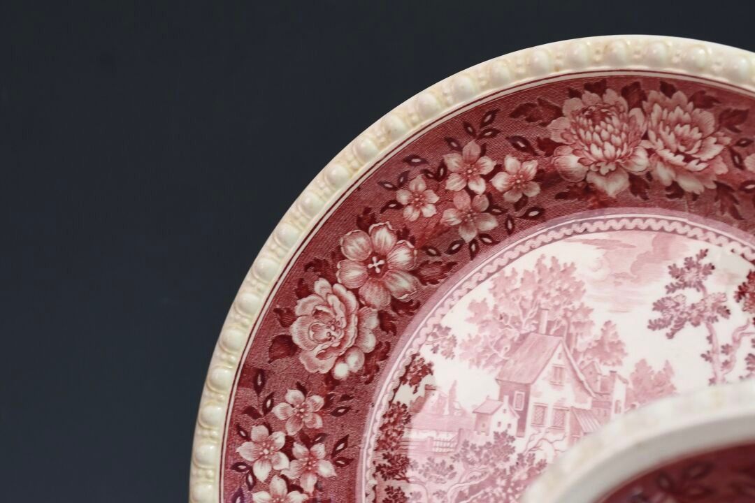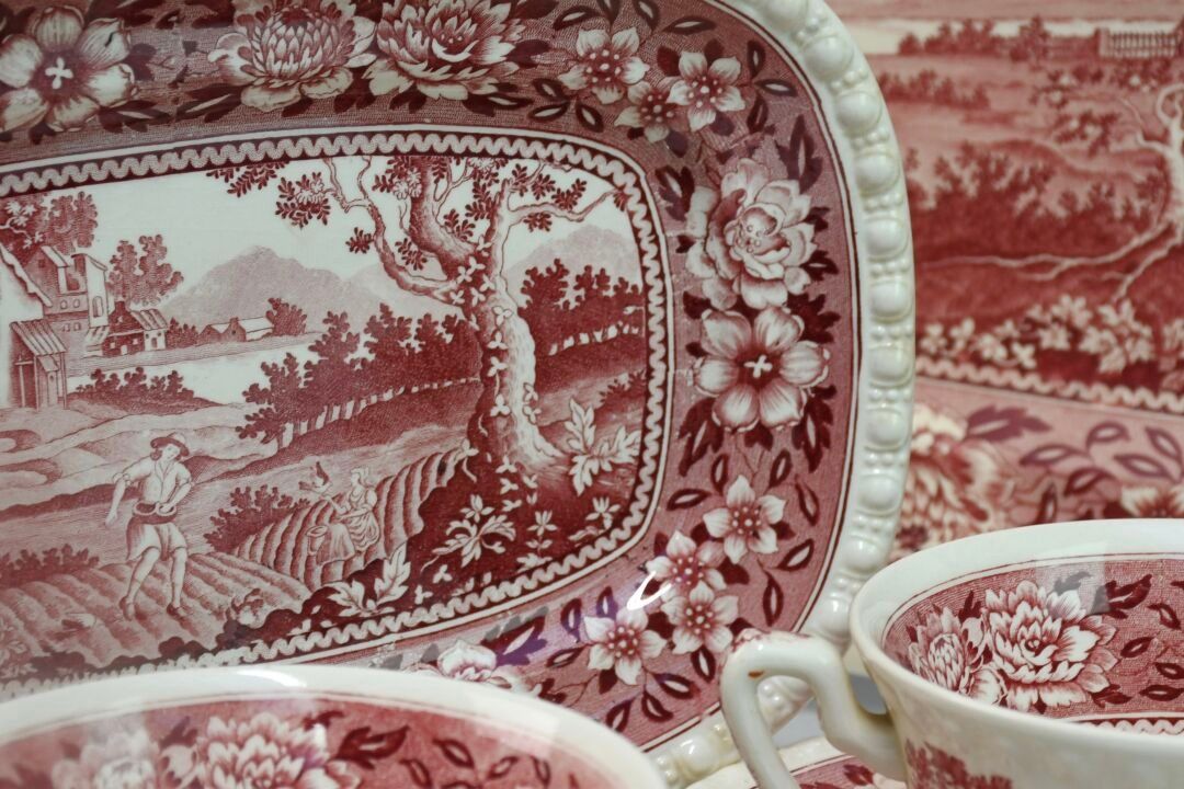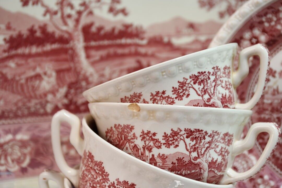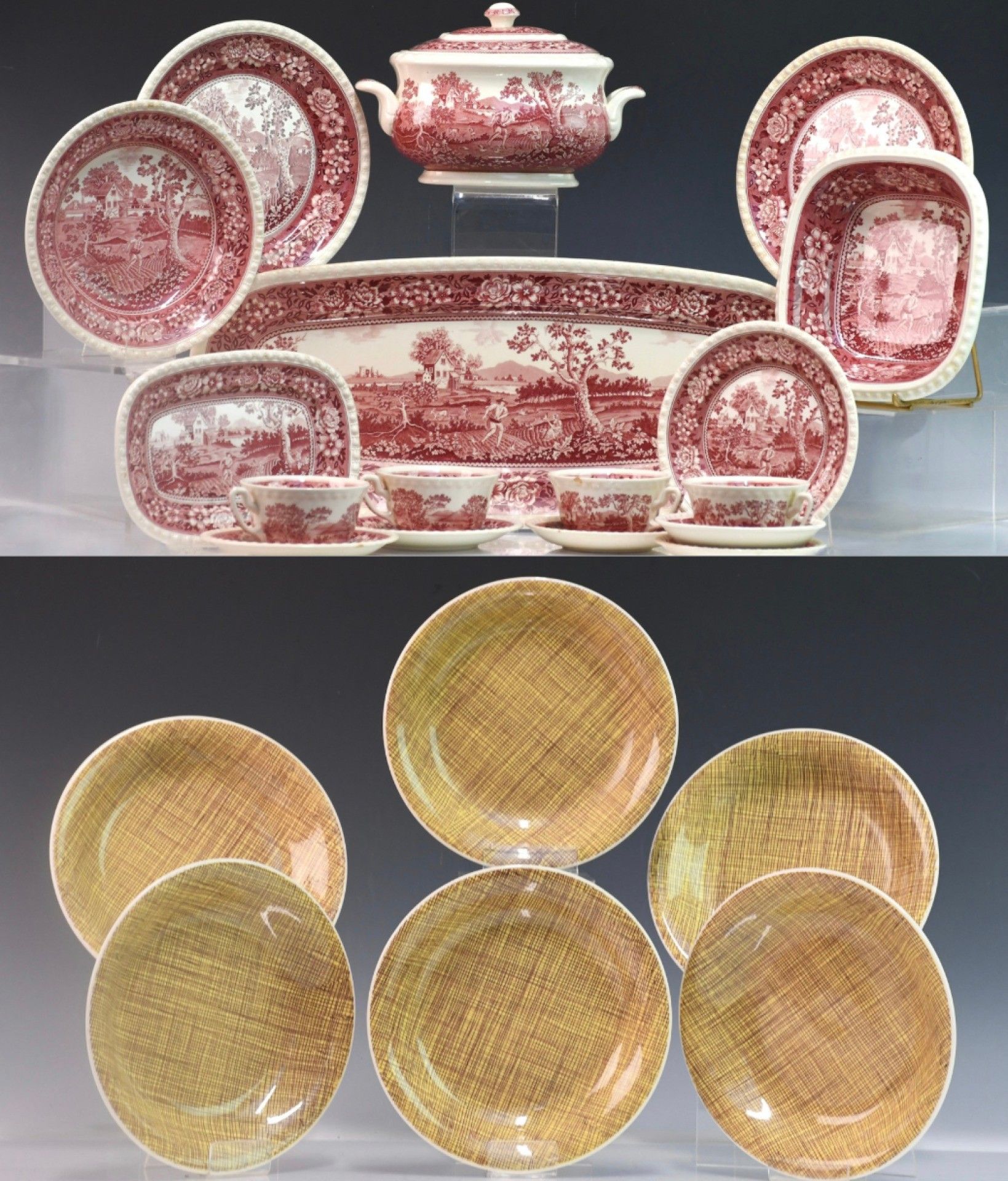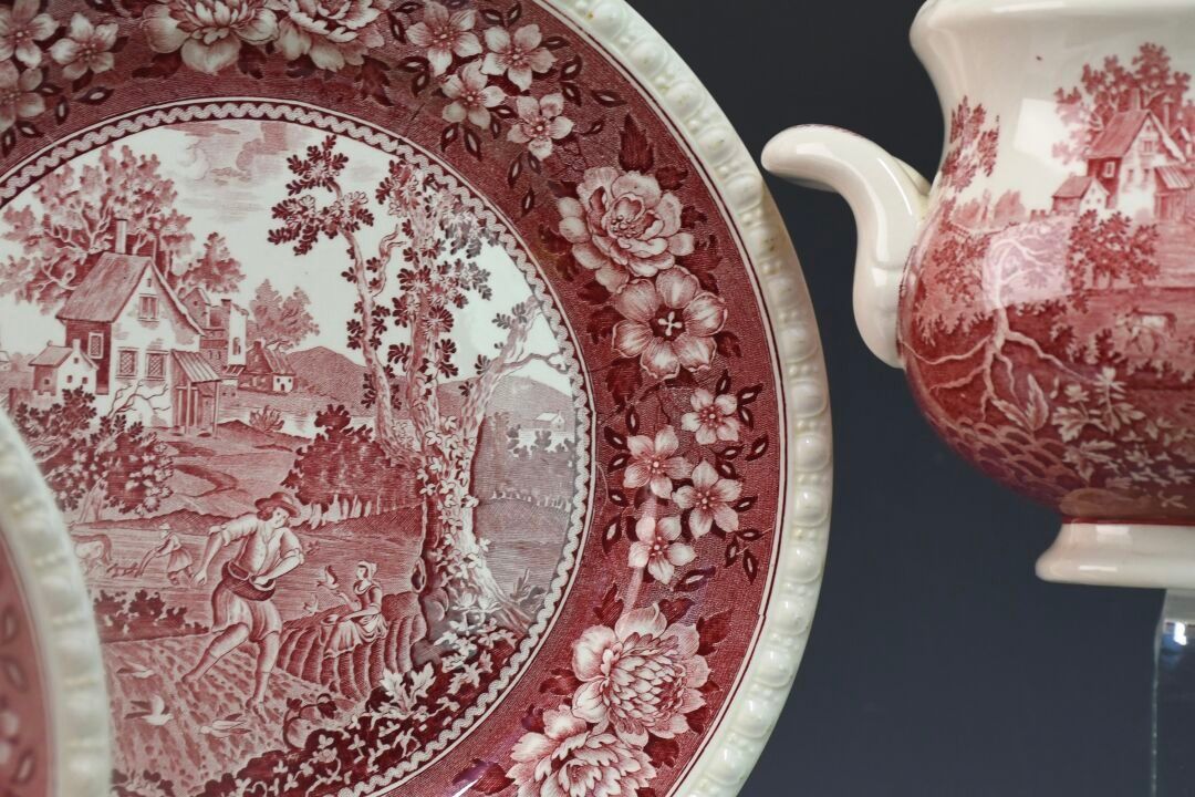 Fine earthenware dinner service decorated with an animated landscape in printed monochrome, comprising four tea cups (chips and cracks) and two saucers, a small tureen, a dessert plate, a soup plate, two dinner plates, a vegetable dish, two coffee saucers, a ravier and a fish dish.