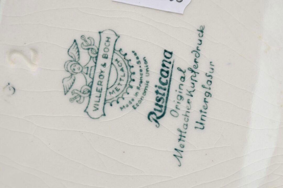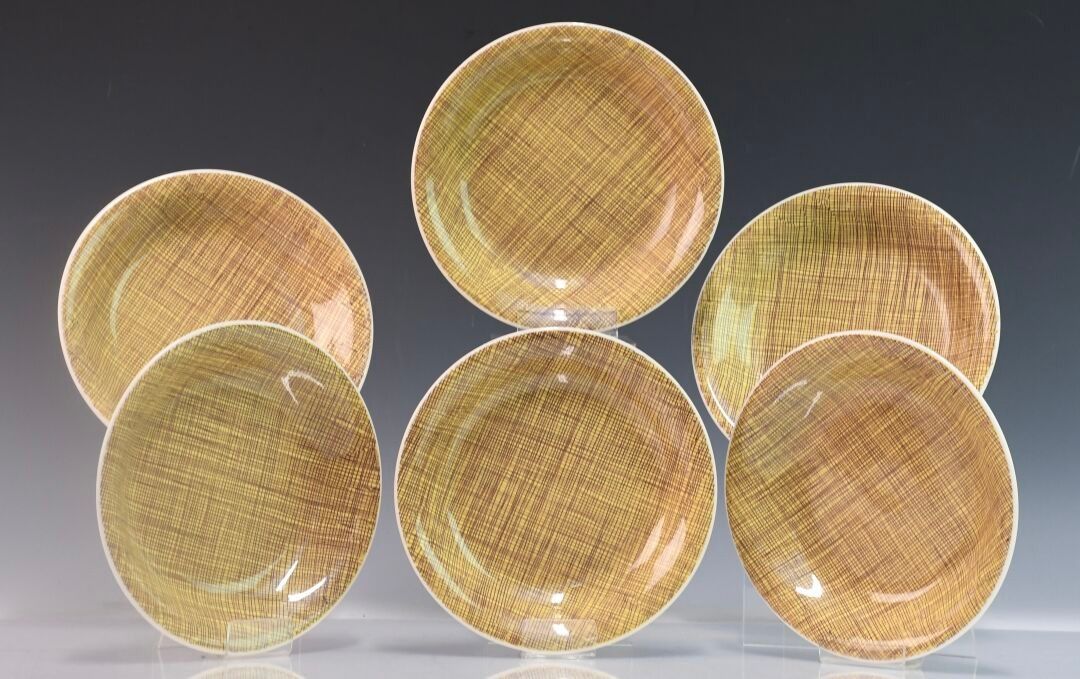 Six fine earthenware soup plates decorated with BERN pattern squares (chips on two plates).