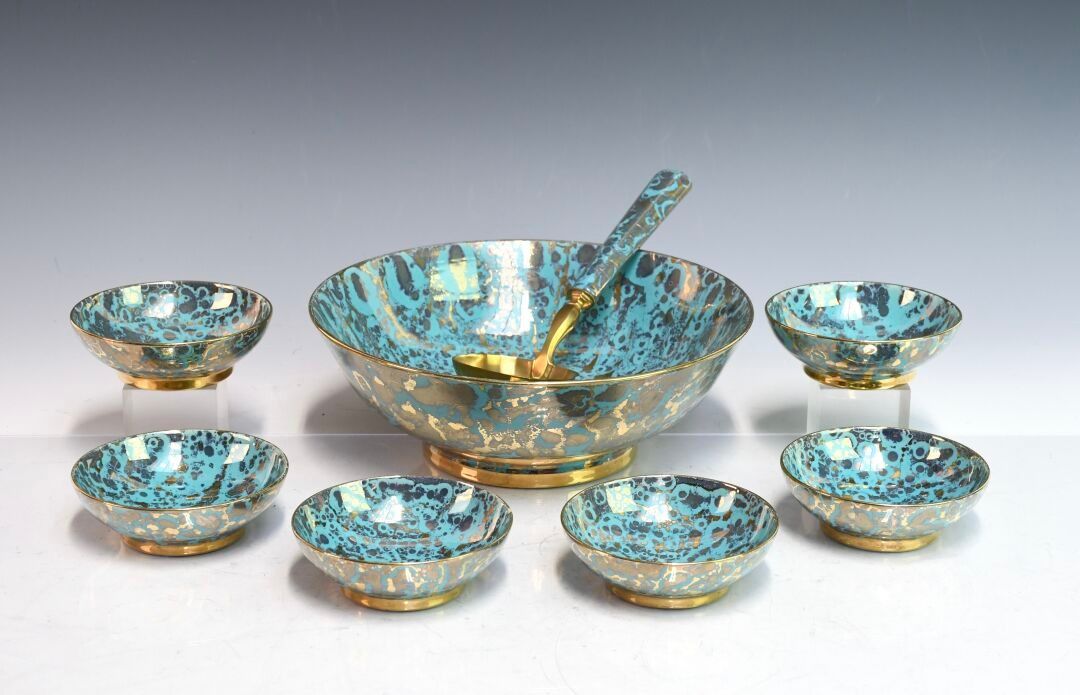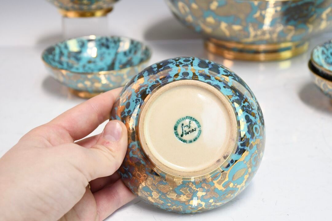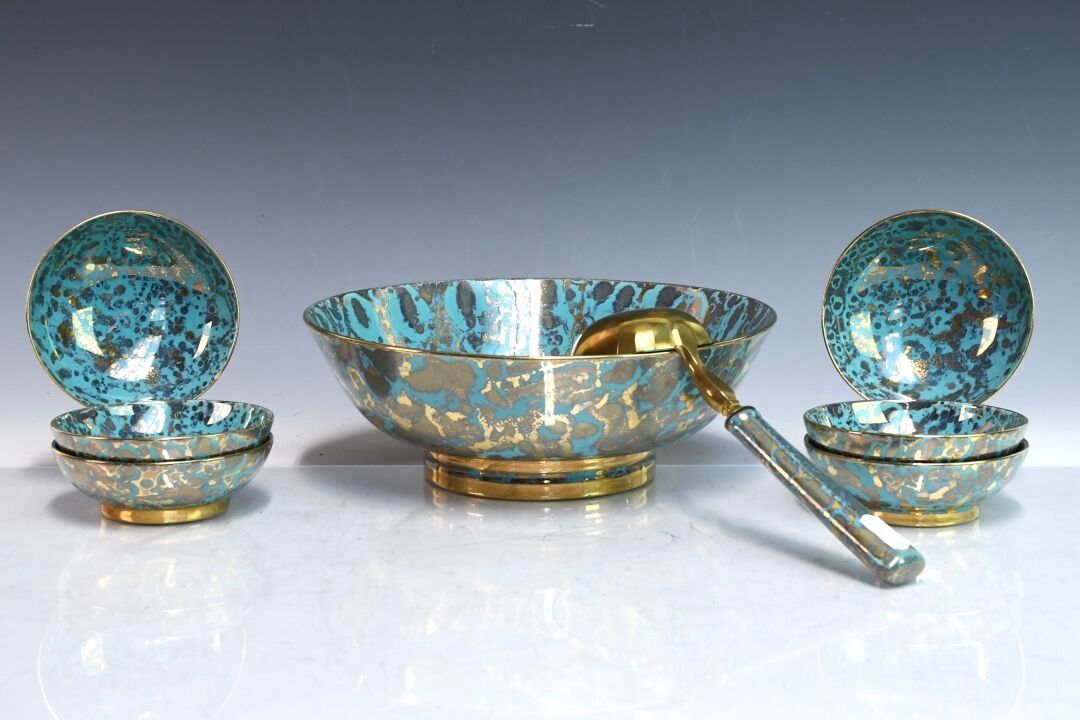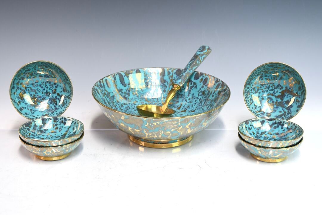 Turquoise glazed earthenware fruit service with gold speckled decoration comprising :