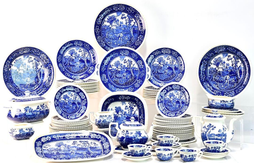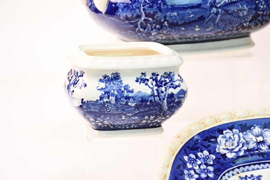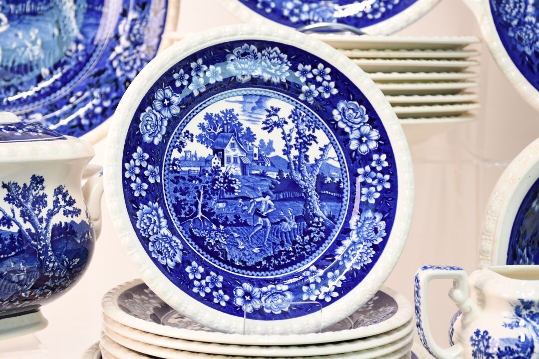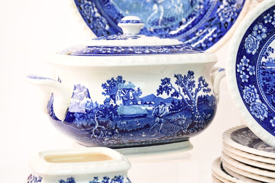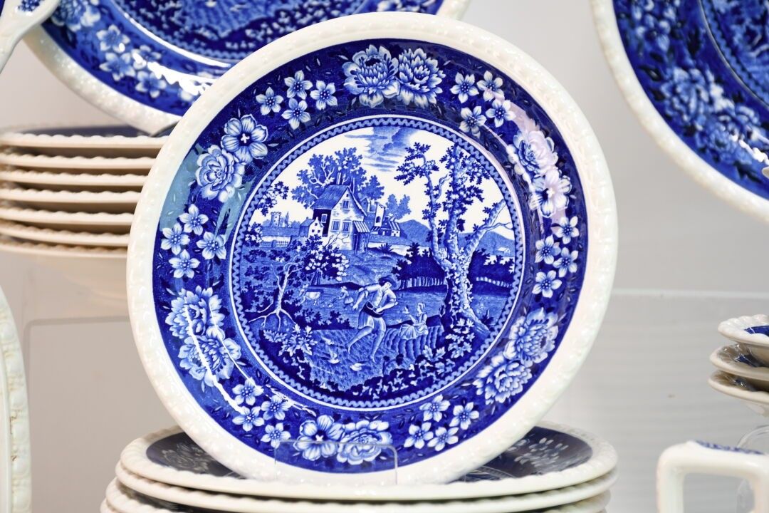 Glazed earthenware dinner service decorated in blue with animated landscapes.
