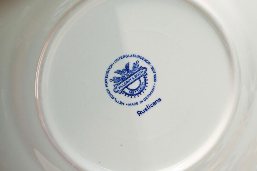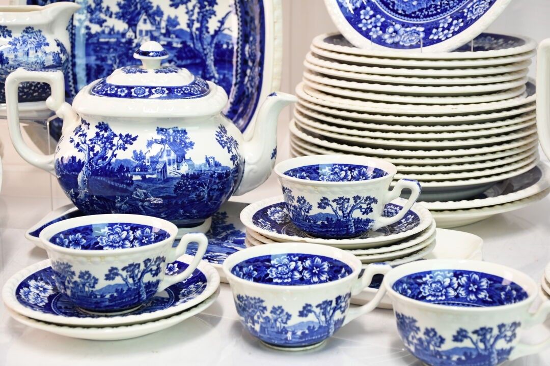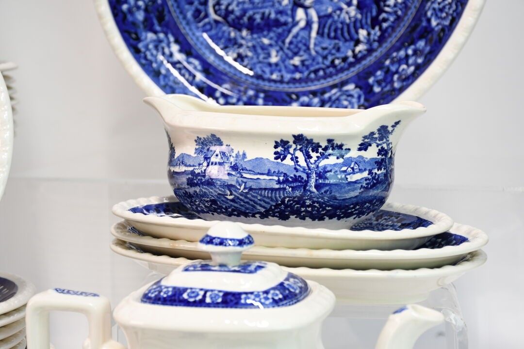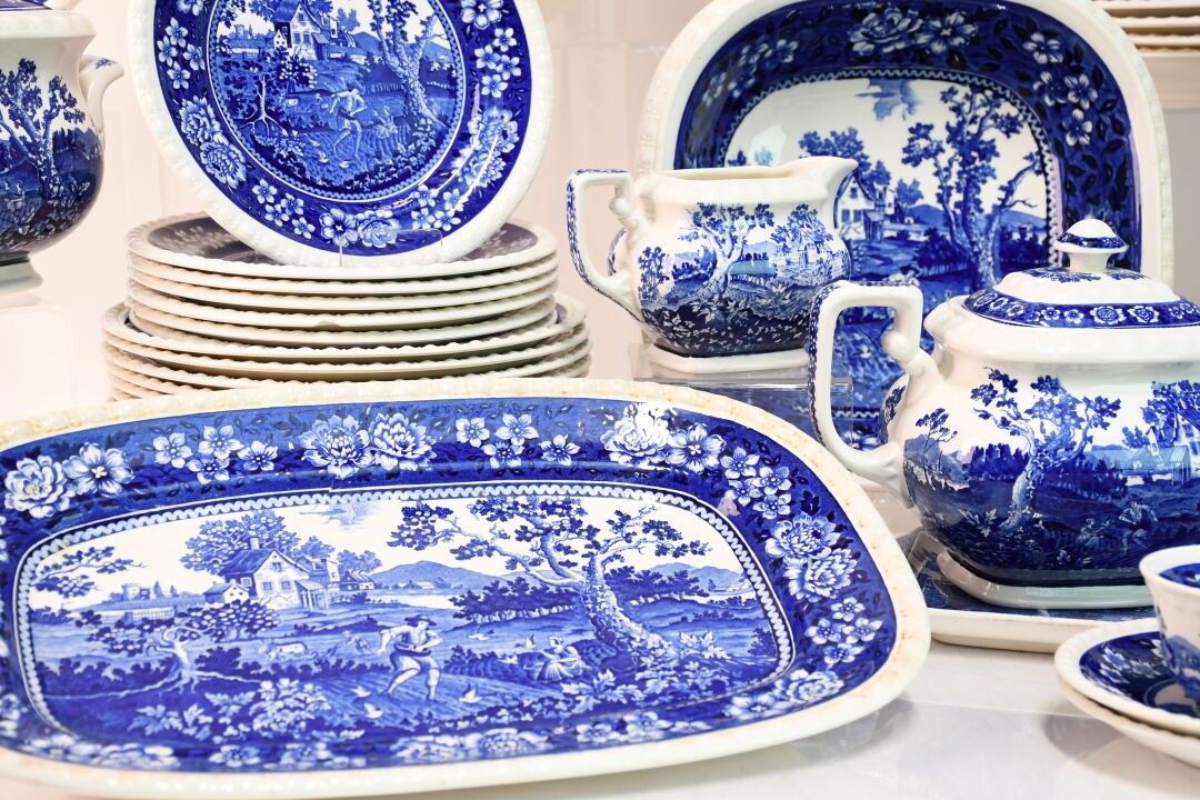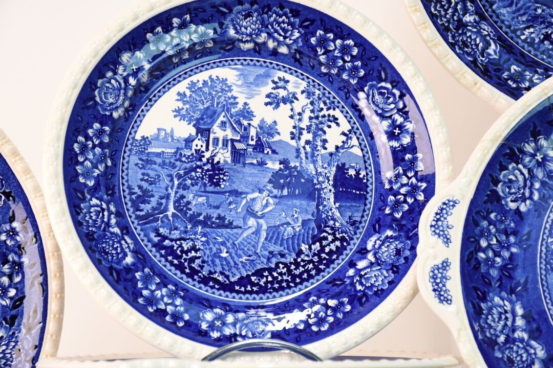 Glazed earthenware dinner service decorated in blue with animated landscapes.
