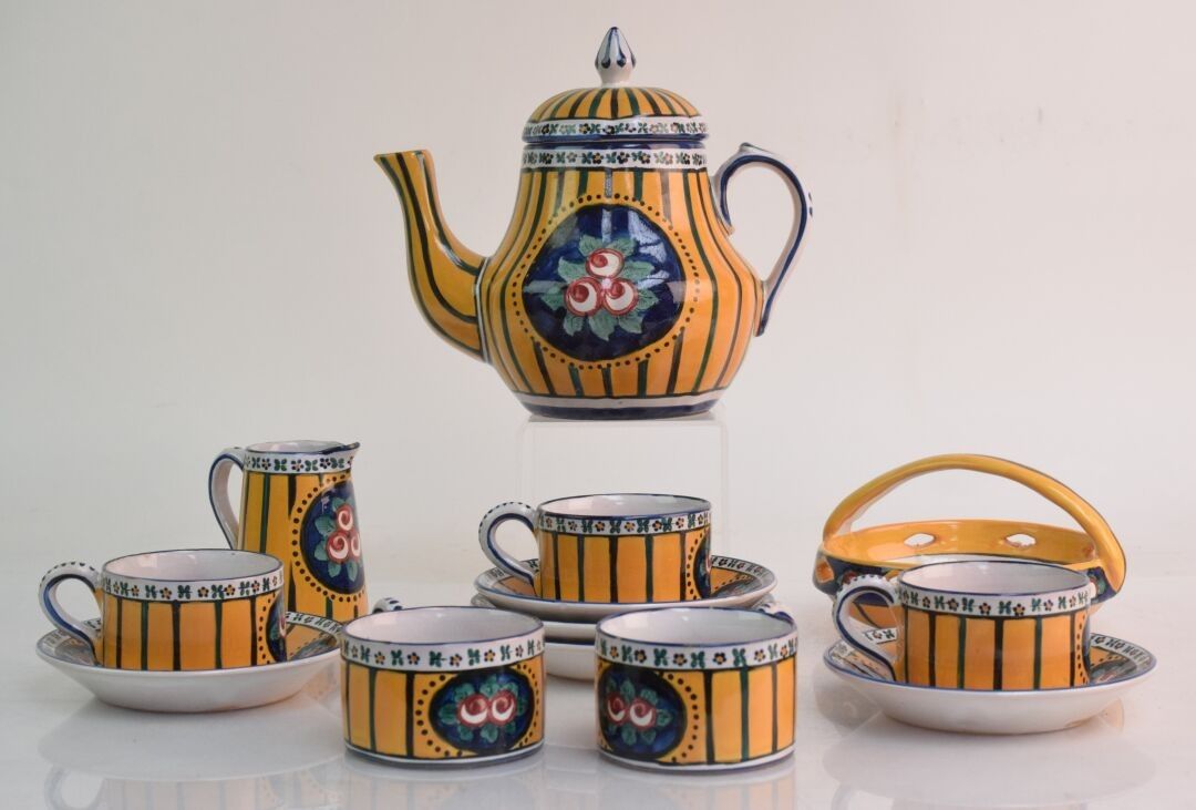 Set of a tea service including a coffee pot, five cups and their saucers, a milk jug and a yellow and blue enamelled earthenware bowl with handle decorated with flowers.