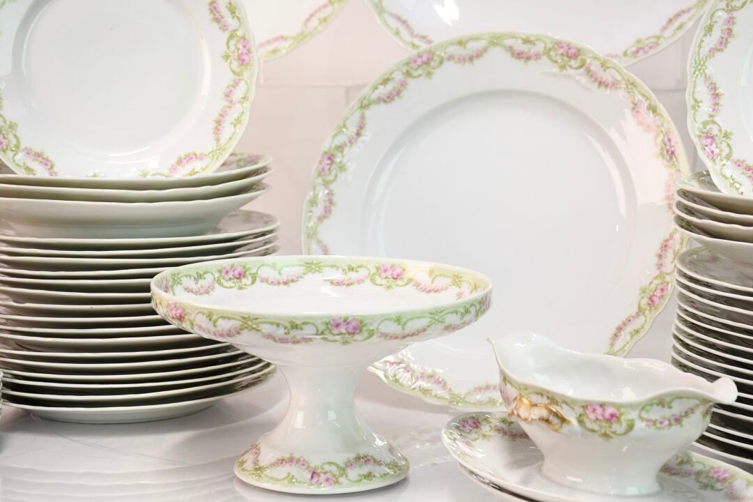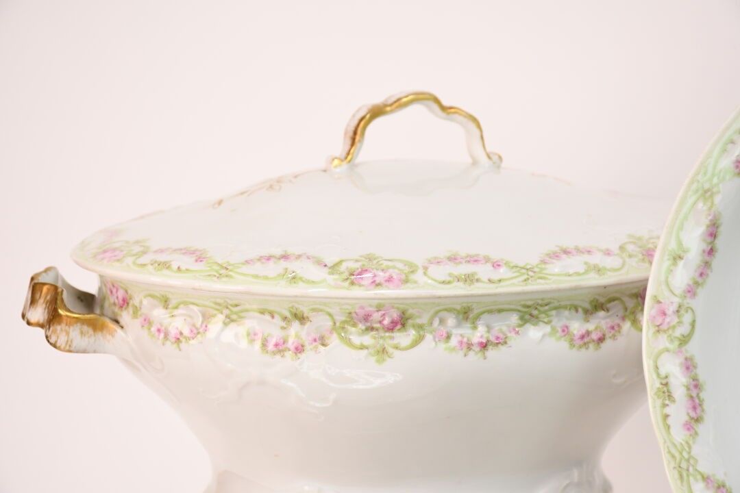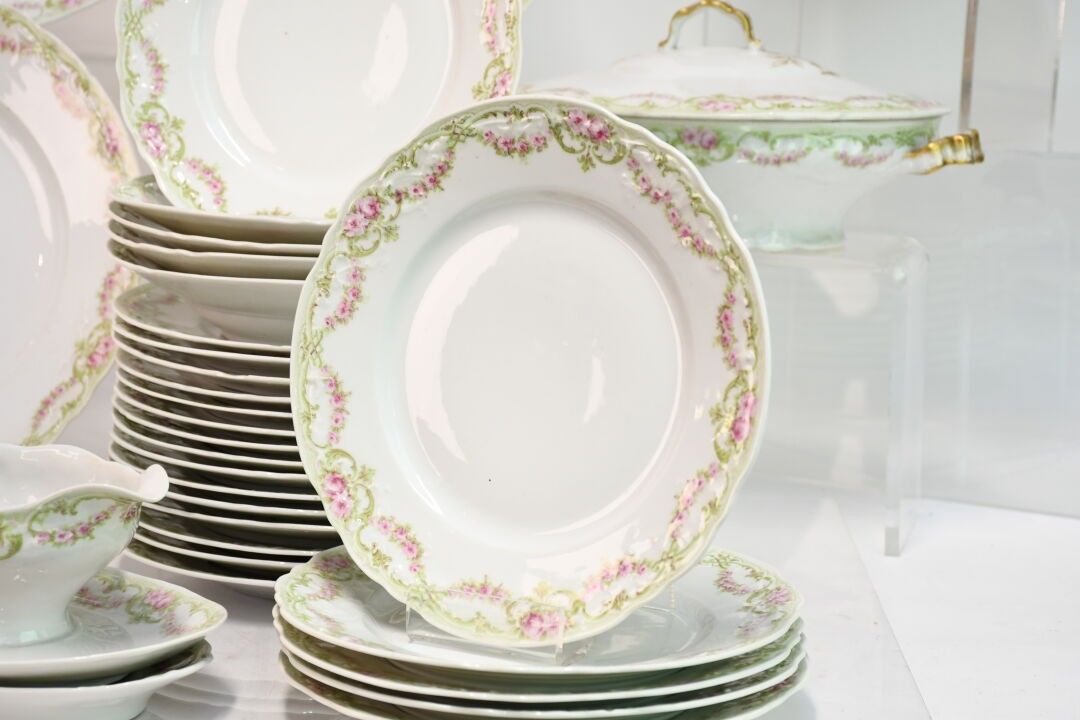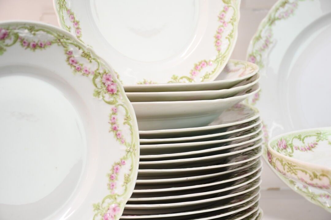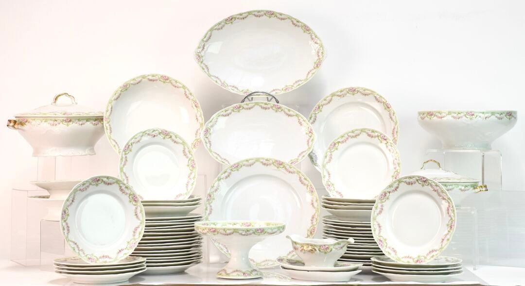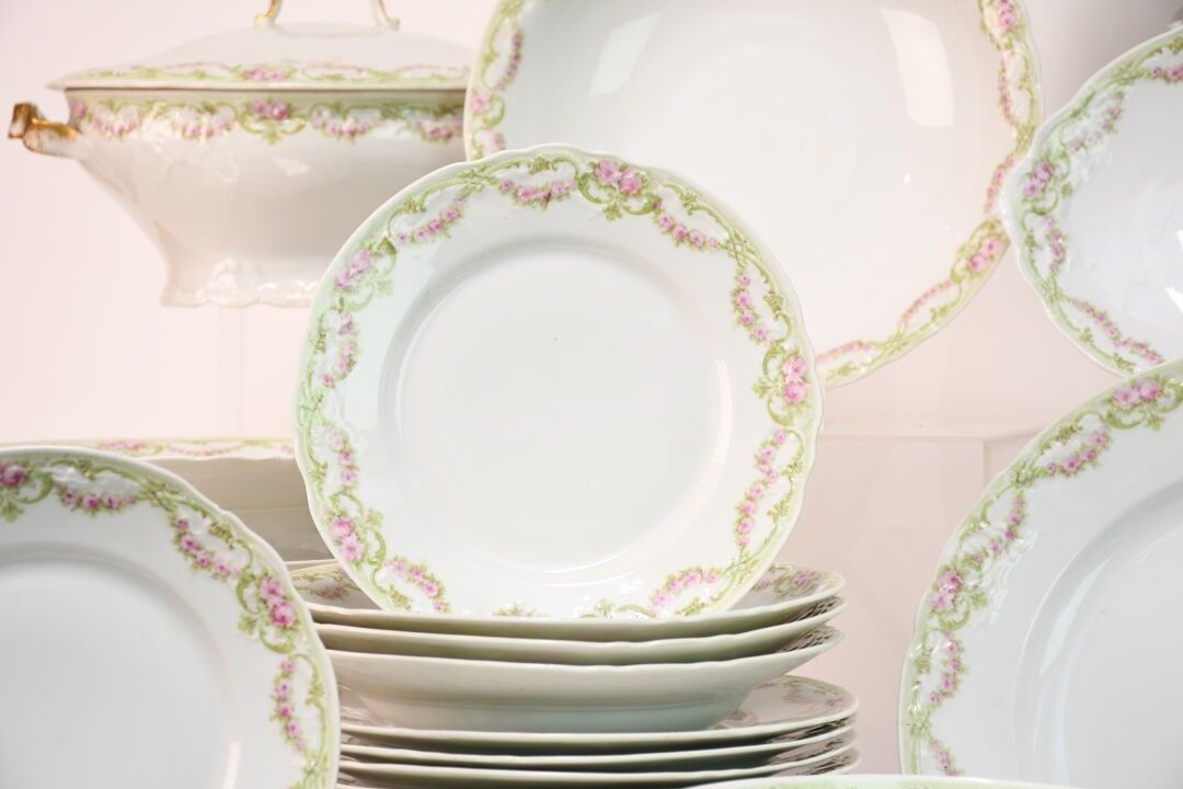 Enamelled porcelain dinner service with printed garlands of flowers. It includes
