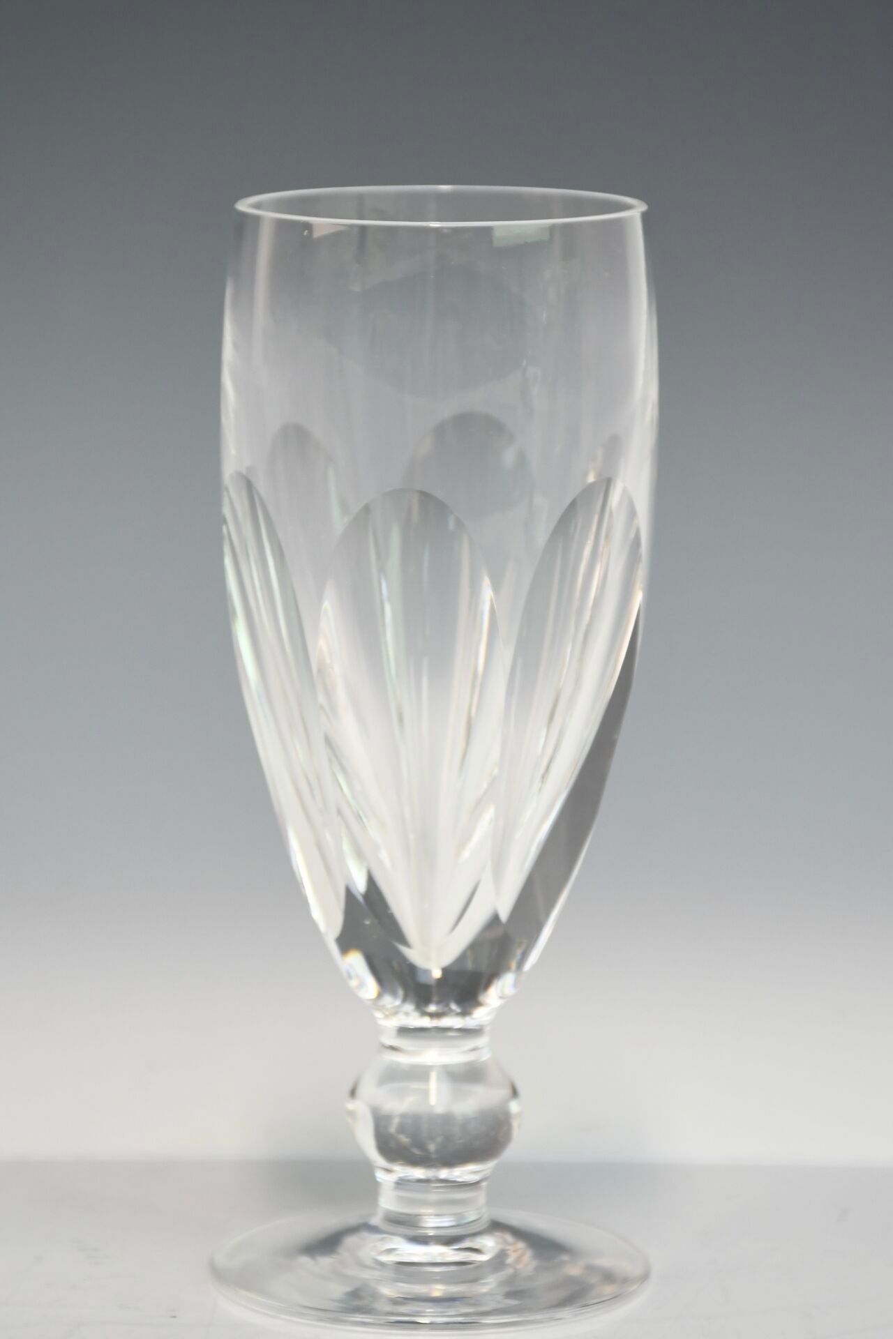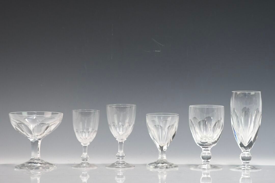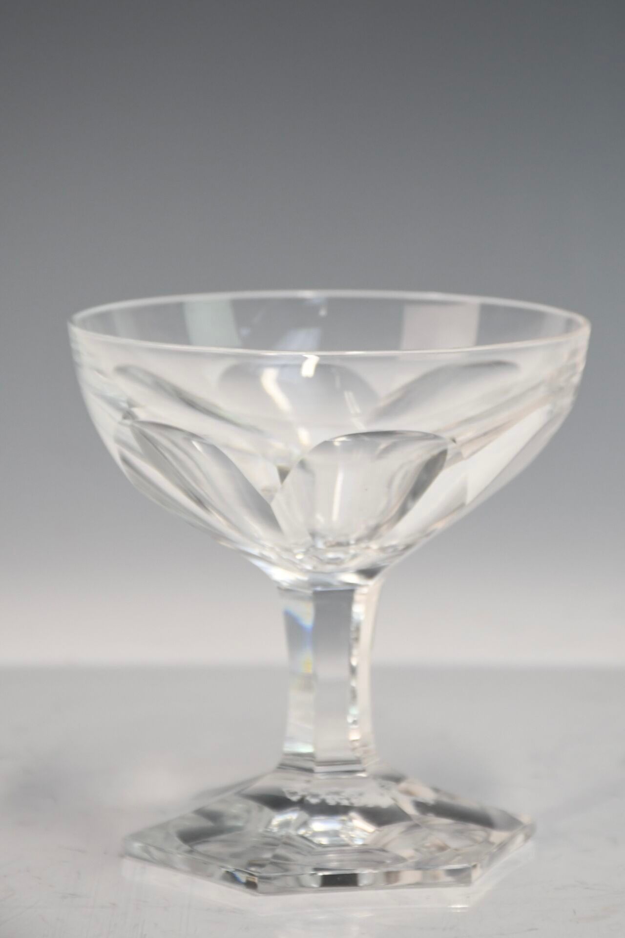 A set of crystal stemmed glasses with hexagonal stems comprising seven wine glasses and five champagne glasses is included