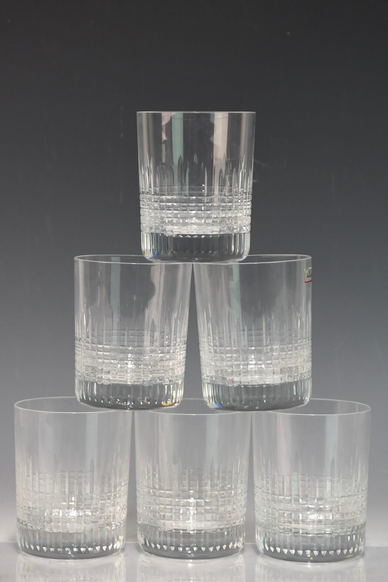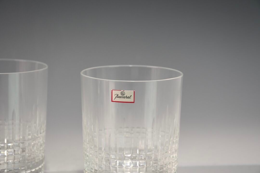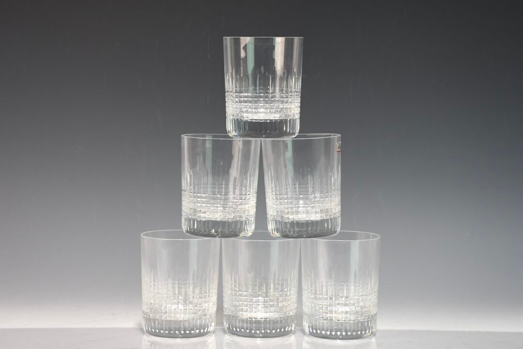 BACCARAT Set of six engraved crystal whisky glasses.
