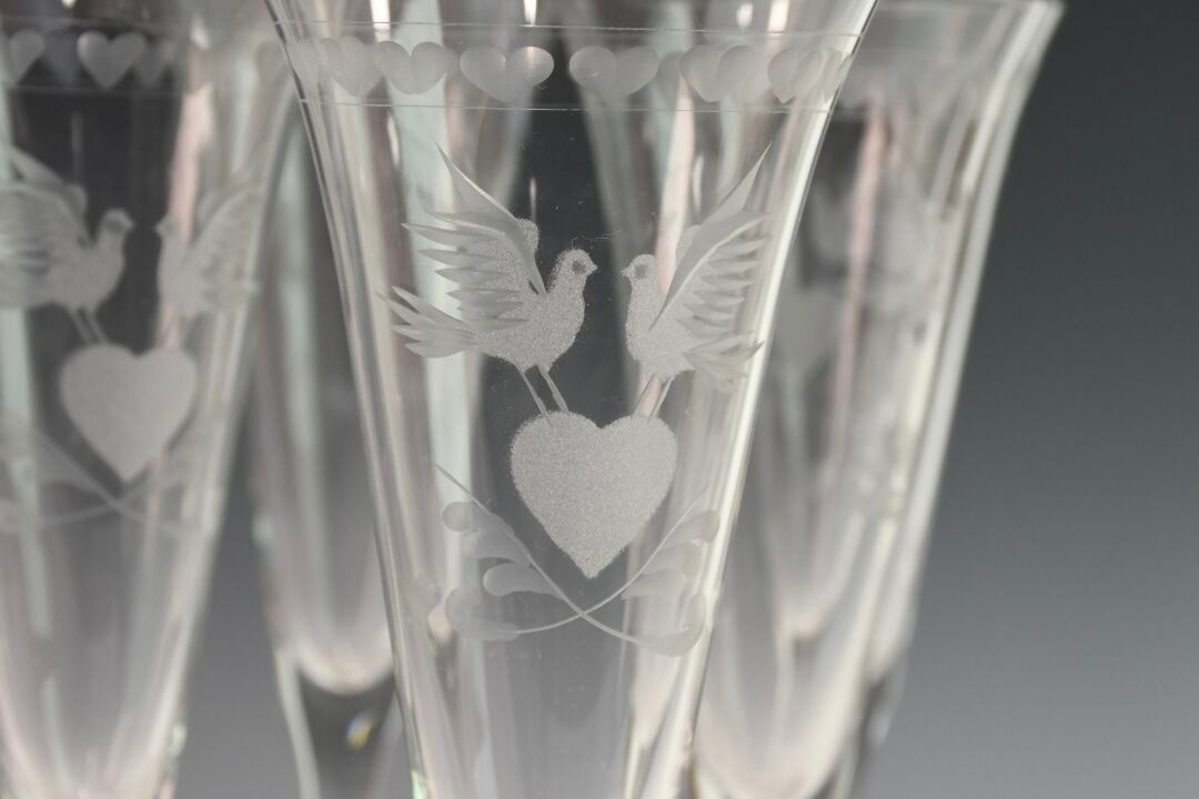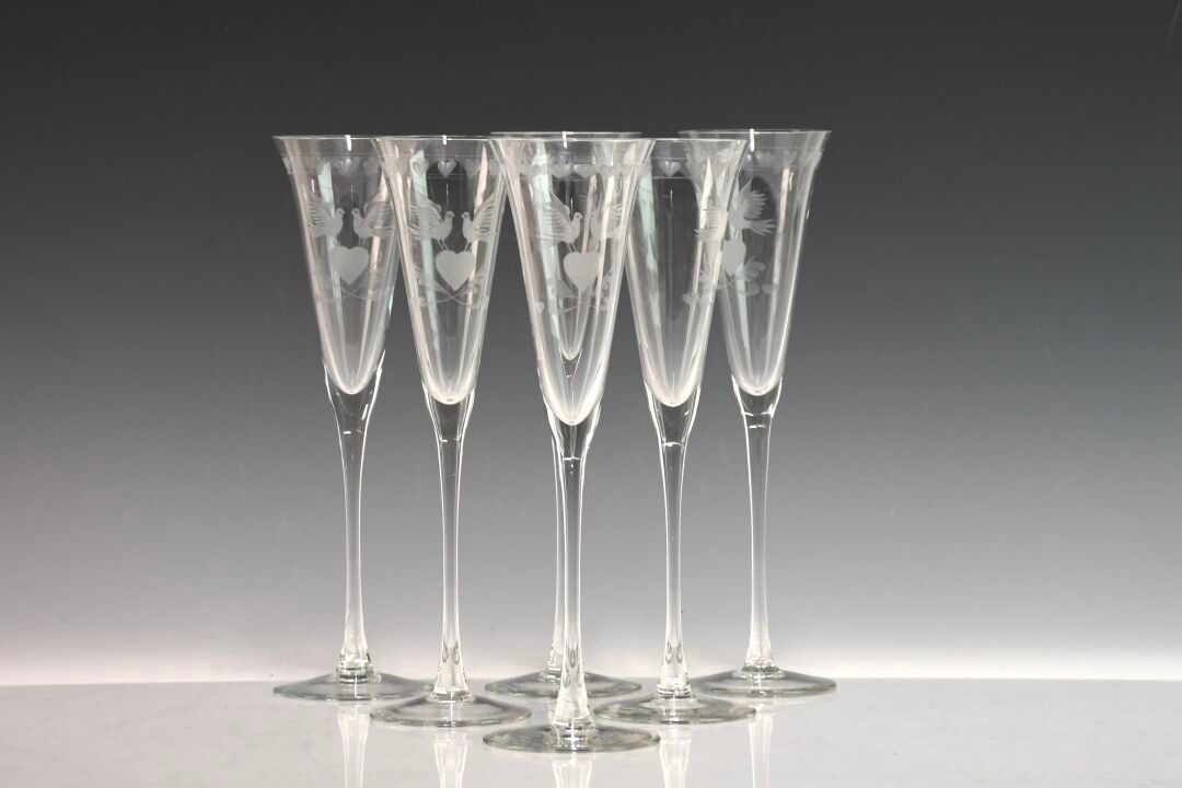 Set of six crystal champagne flutes with wheel-engraved decoration of a heart surmounted by two doves.