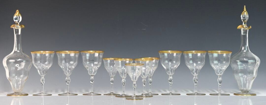 Part of a crystal glass service with a twisted ring at the top of the stem. The rim of the rim and foot with gilded combed motifs comprising eleven champagne glasses (height: 12.5 cm), four wine glasses (height: 13 cm), one white wine glass (height: 12 cm), six water glasses (height: 15.5 cm) and a set of four bubbled decanters (chip to a stopper).