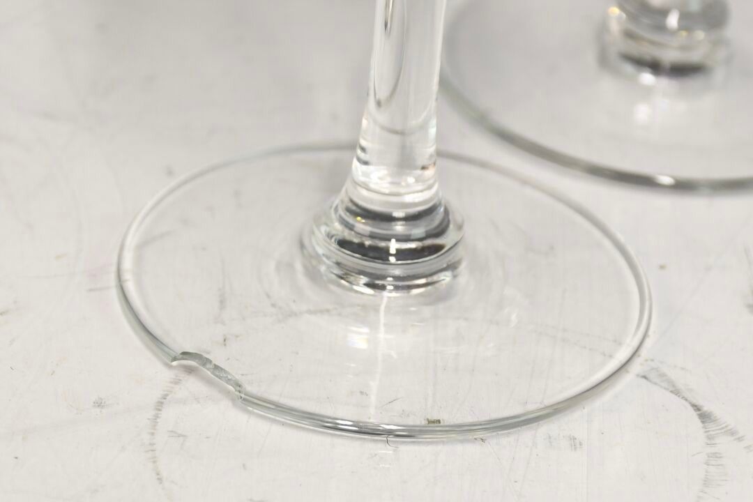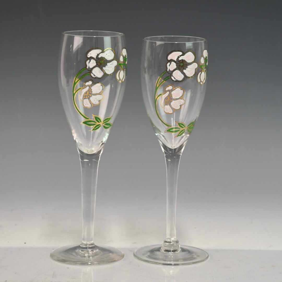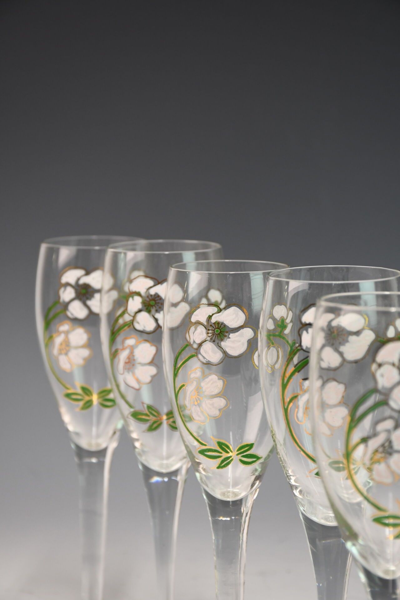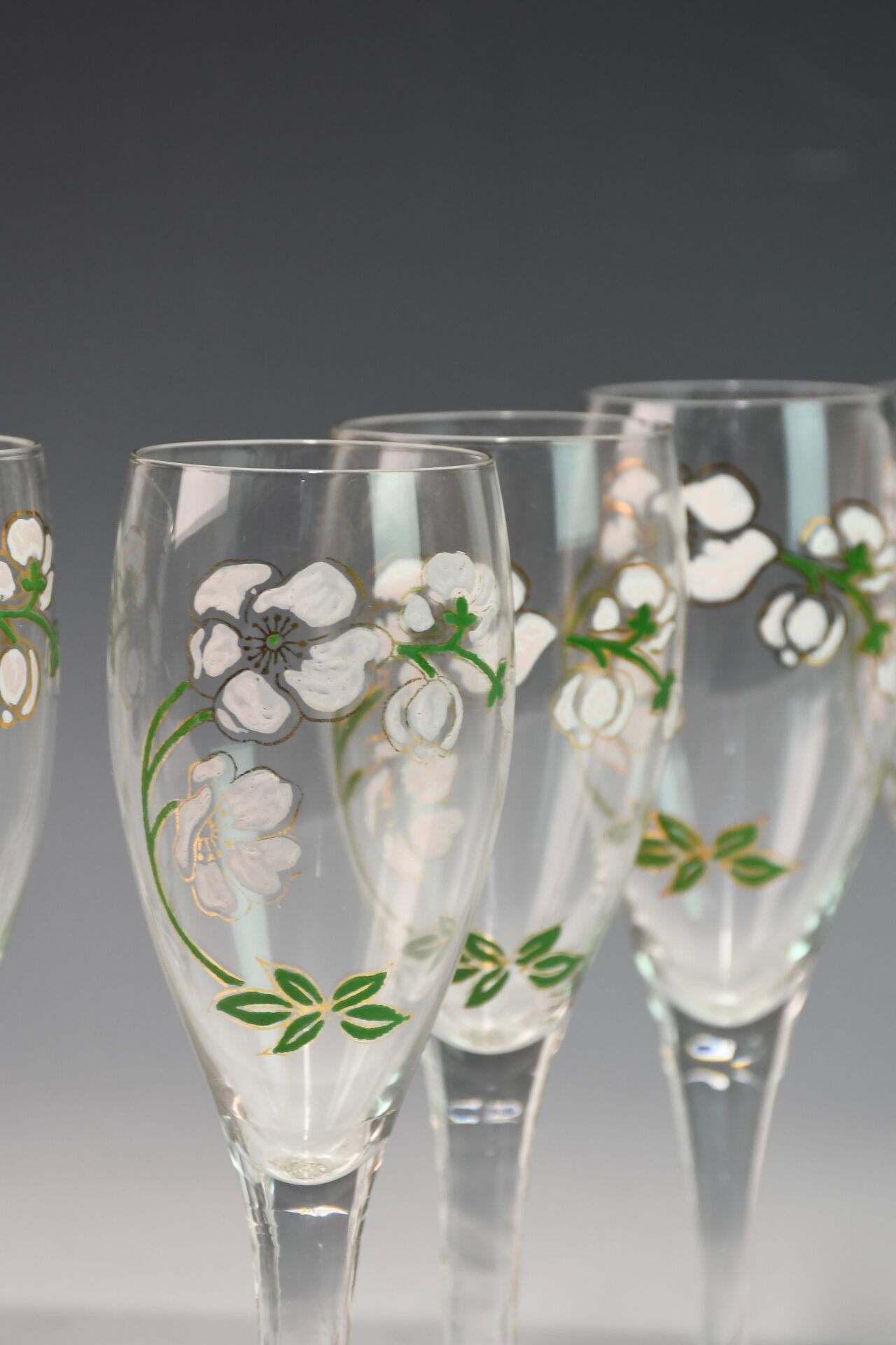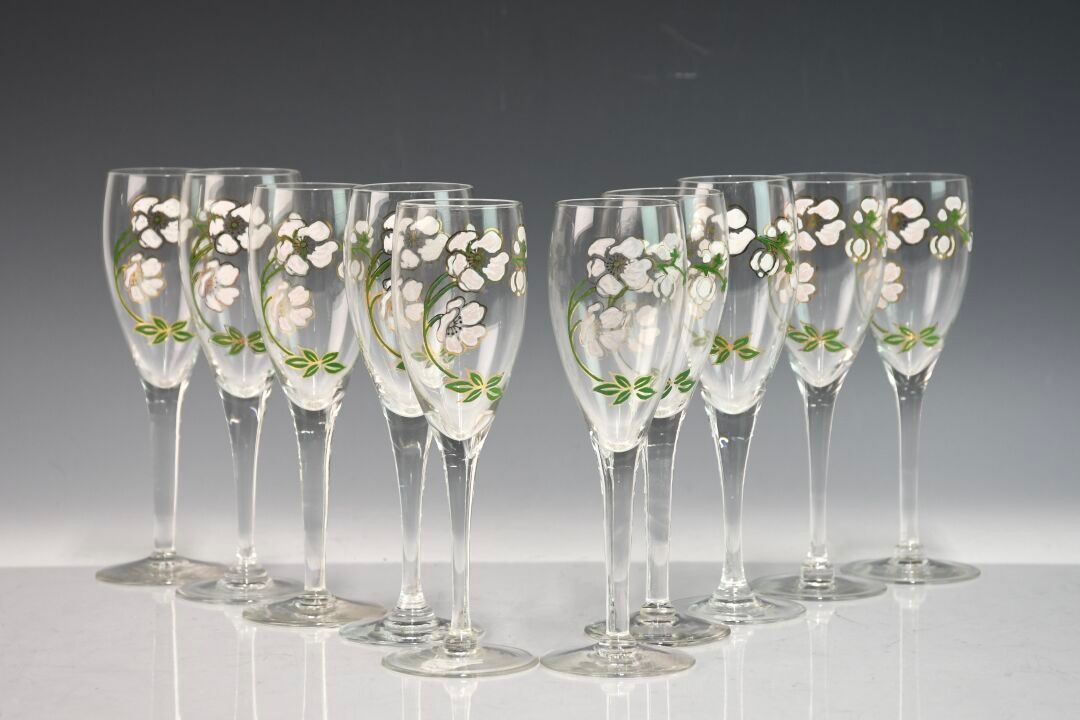 Set of ten white glass champagne flutes enamelled with flowers in the Art Nouveau style (chip to one foot)