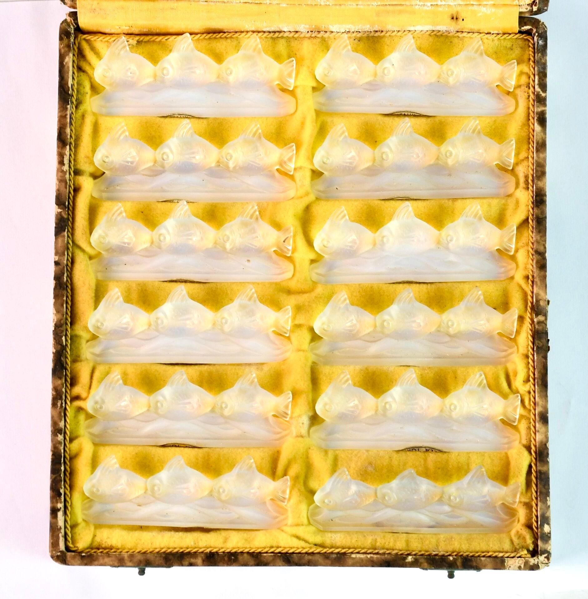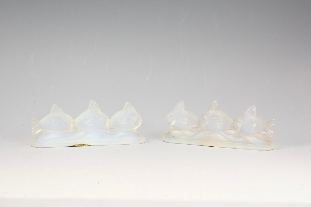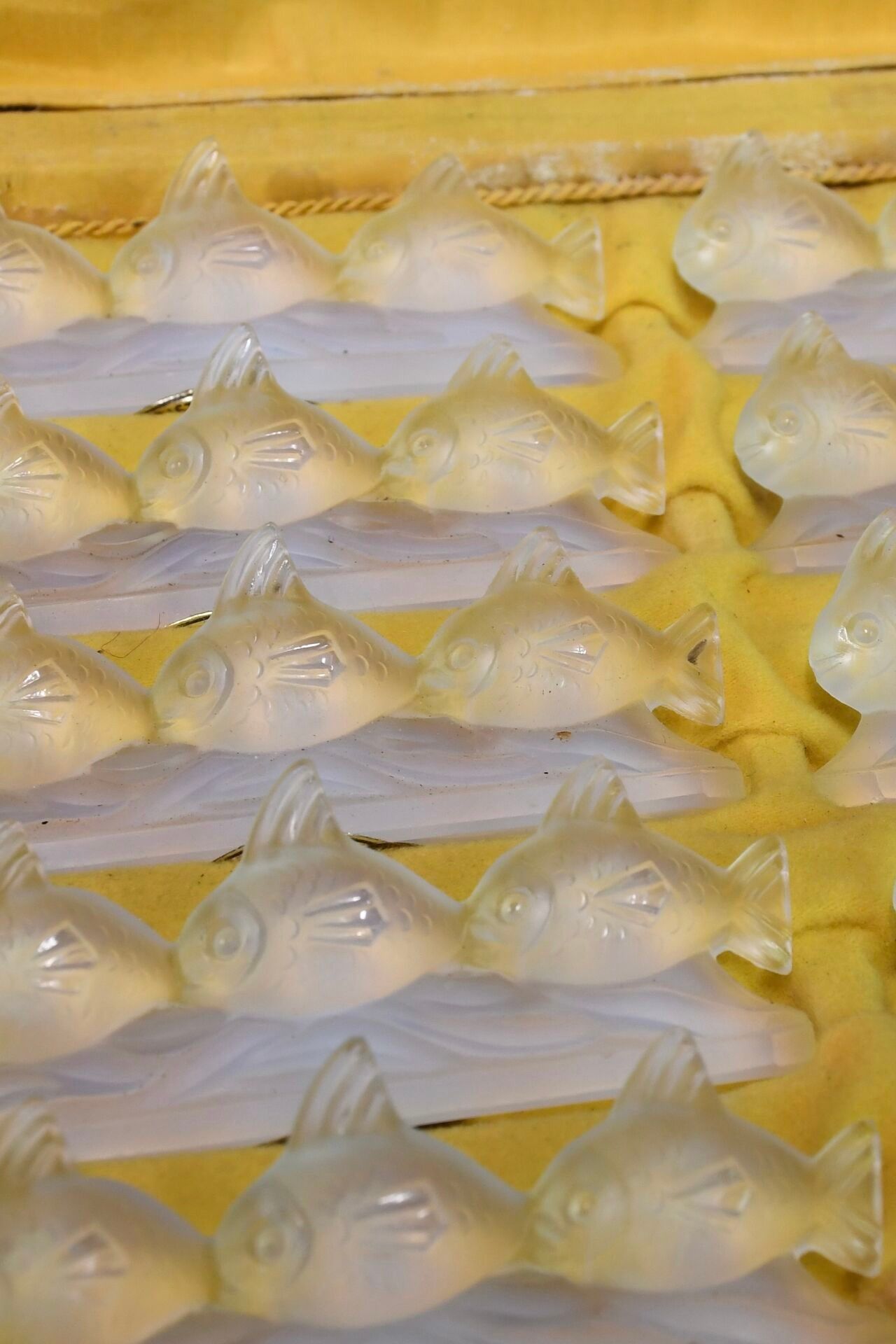 Set of twelve opalescent moulded glass knife-holders in the form of a series of three small fish.