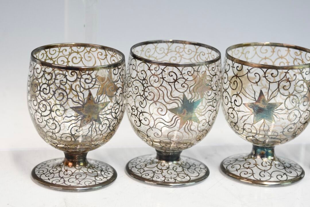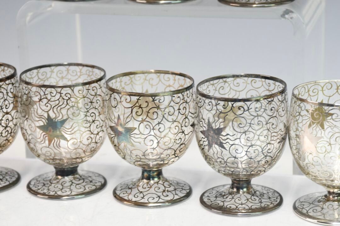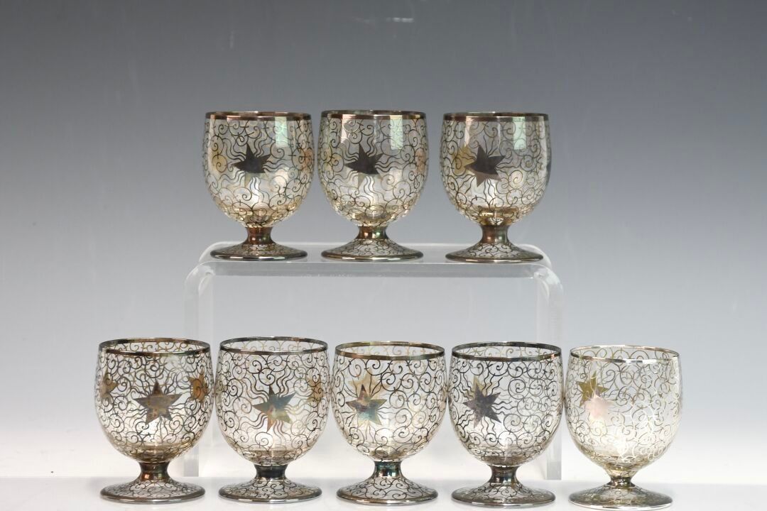 Set of eight small stemmed glasses with silver scrolls and three stars