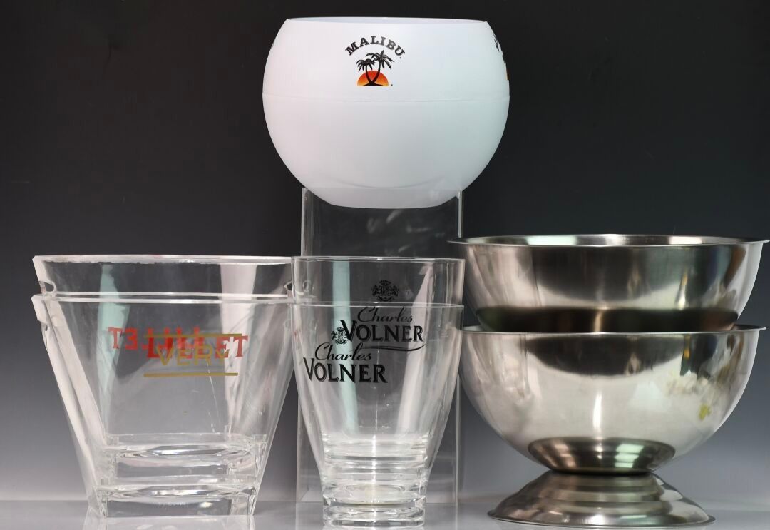 Reunion of two CHARLES VOLNER champagne buckets, a MALIBU cocktail bucket, two stainless steel punch bowls and two LILLET raffraichissoir cups.