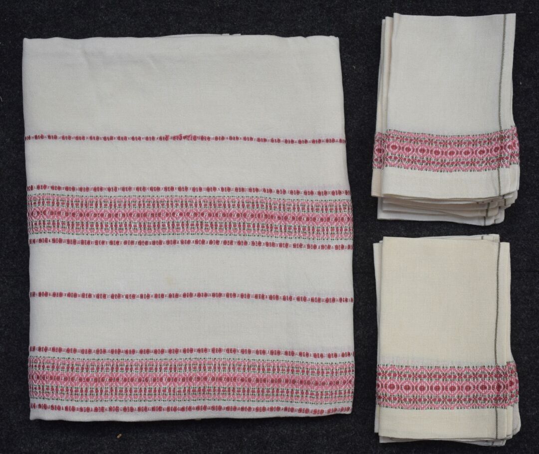 Pink embroidered linen dinner service comprising a tablecloth and twelve napkins (stains)