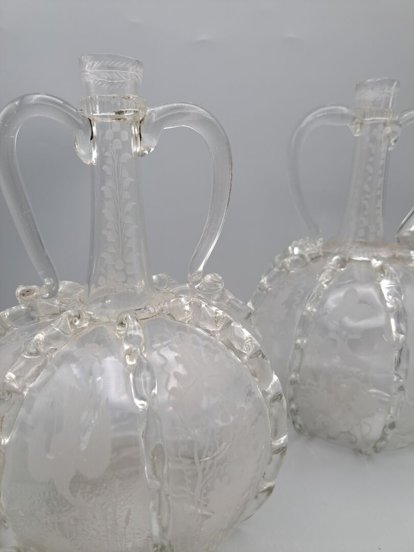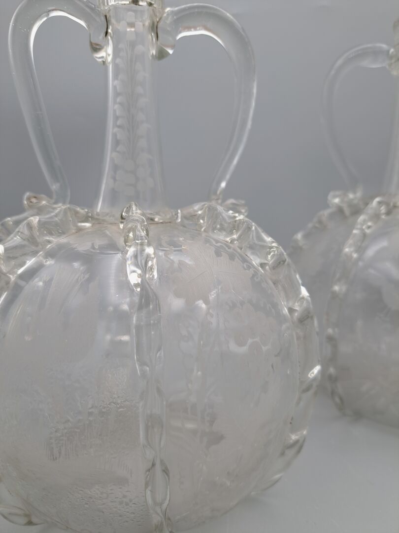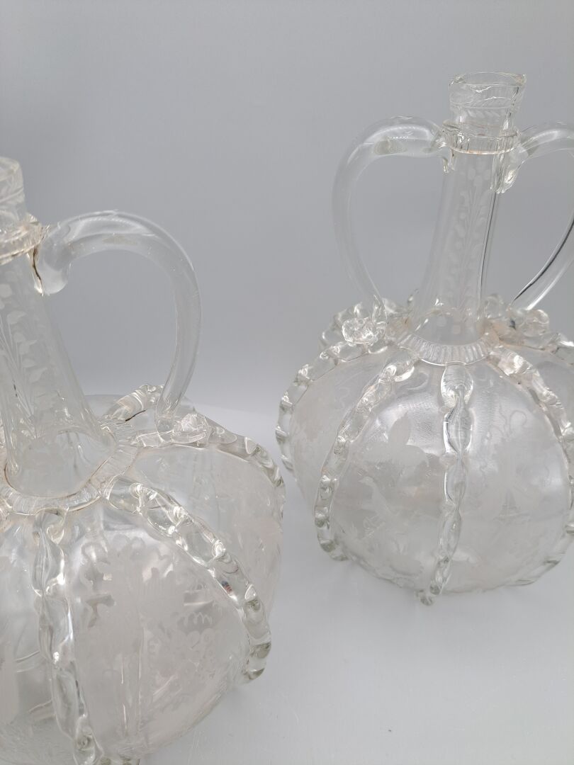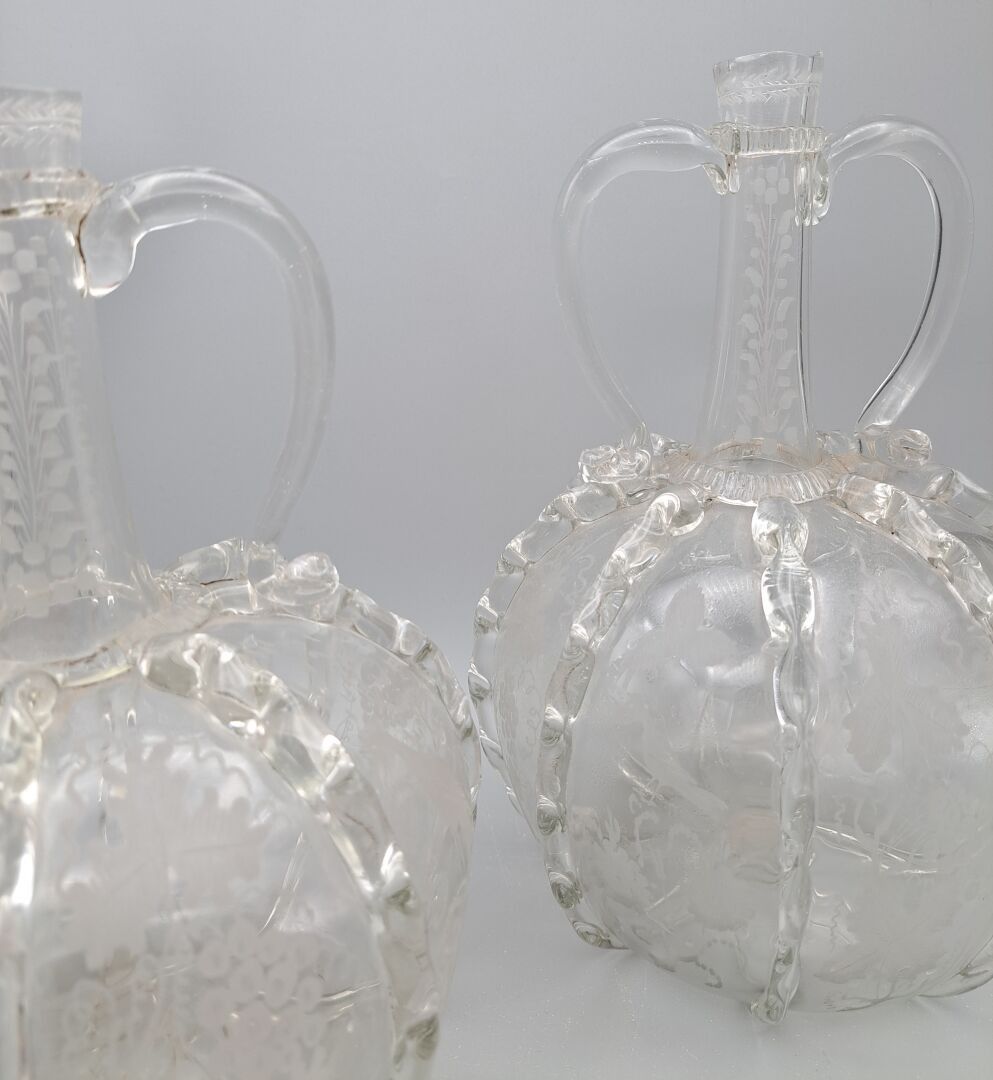A pair of Dutch-style carafes, two handles and decoration in blown glass on the body, engraved decoration of vines, vine shoots and birds, height: 26 cm