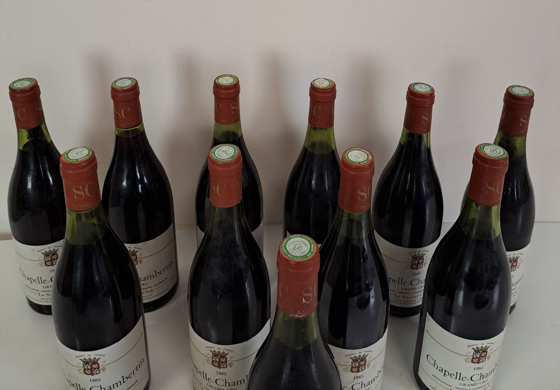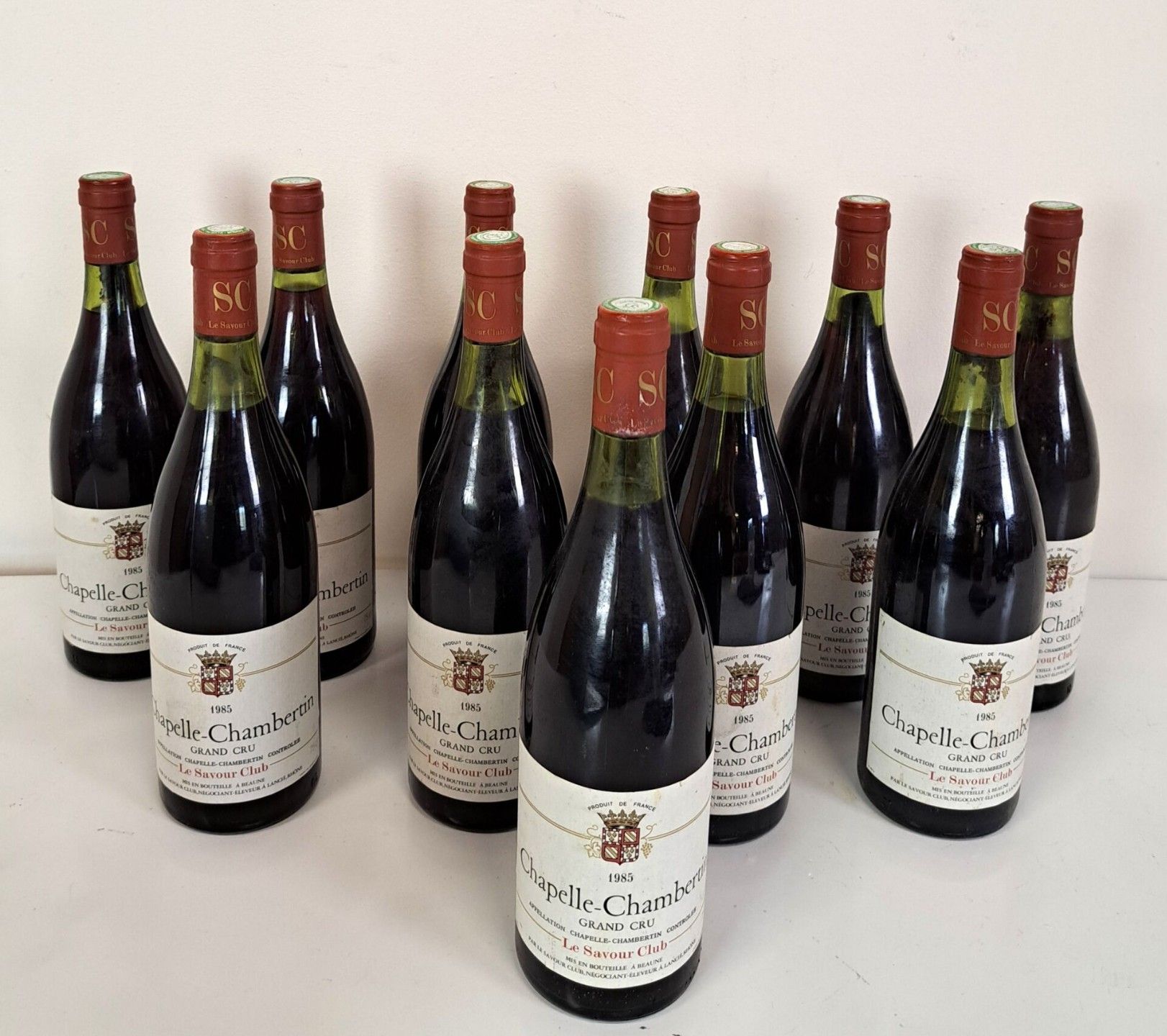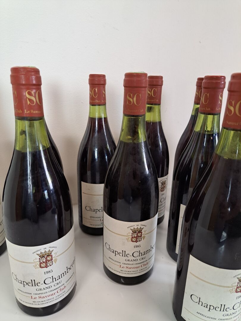 BOURGOGNE - 11 bottles, Chapelle-Chambertin Grand Cru, Le Savour Club, Cuvée recommended by Pierre Troisgros, 1985. Levels at 3.5 cm or better. Caps very slightly dirty, four of which are curved. Slightly dirty labels, two of which also have a very small tear. Slightly dirty back labels, two of which are partially detached and one is missing.