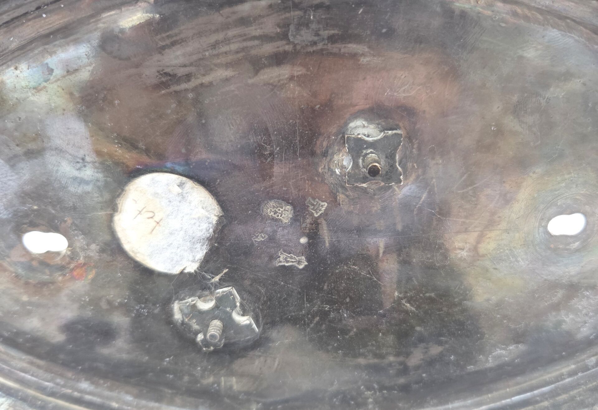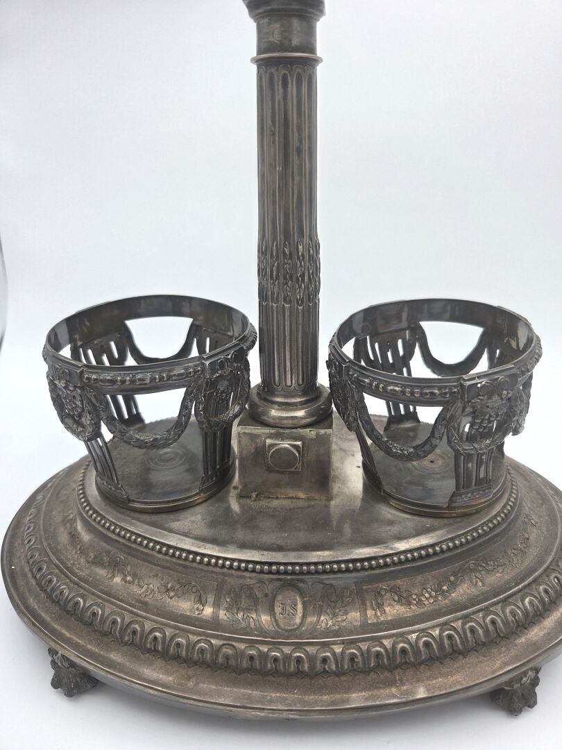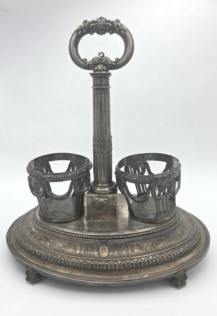Solid silver oil and vinegar cruet holder, oval shape, decorated with garlands of flowers and medallions on the curved edge and stylised leaves on the concave edge, two openwork mounts decorated with garlands and bows and bunches of grapes (one screw missing) separated by a column-shaped handle with fluted shaft, 18th century hallmarks, weight: 1025 g, dimensions: 31 x 28 cm