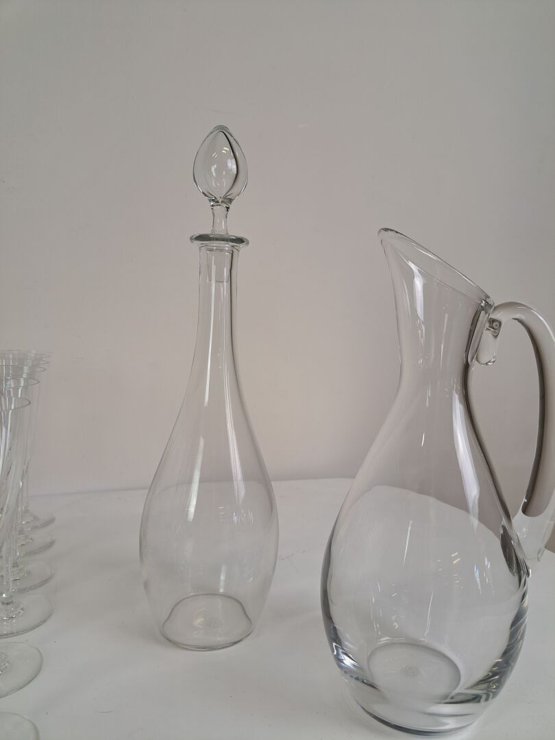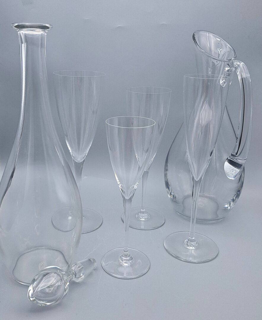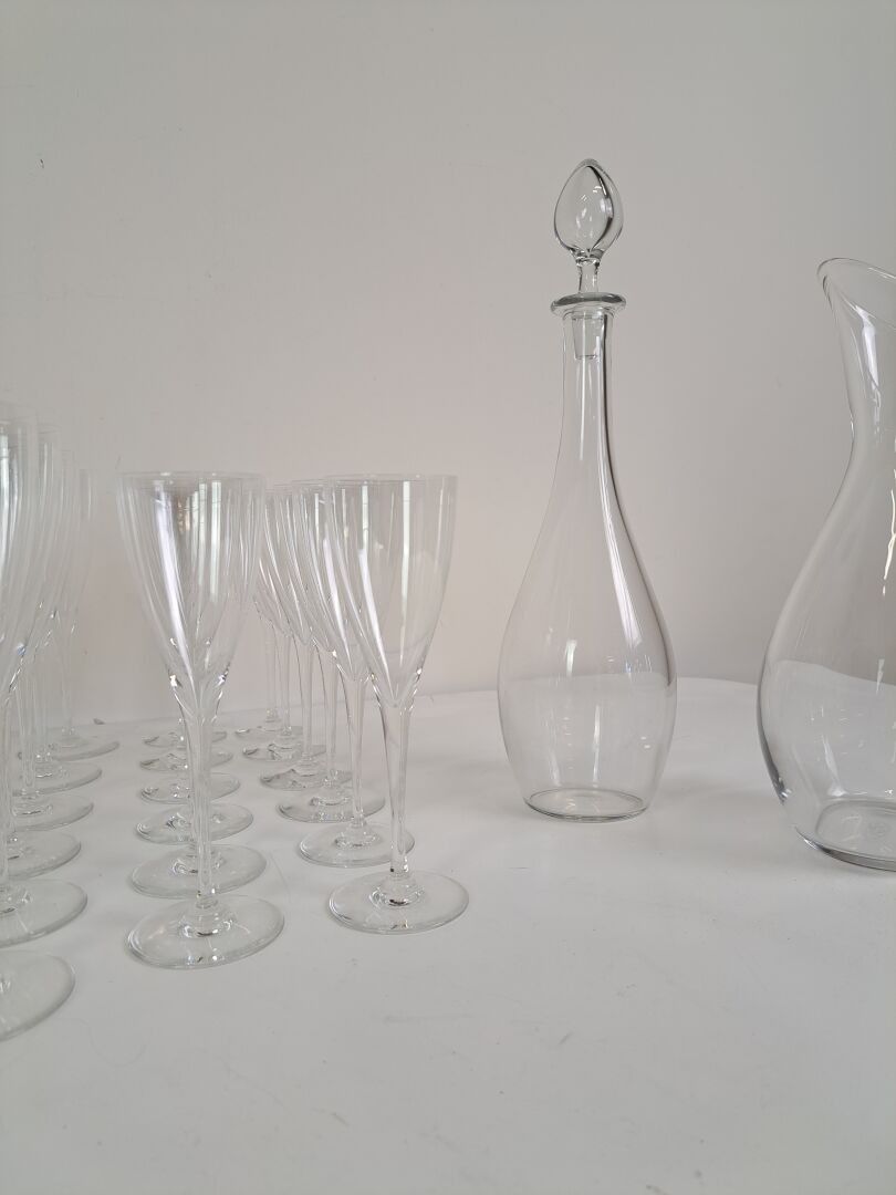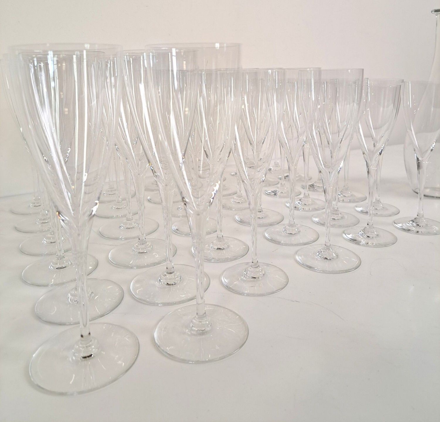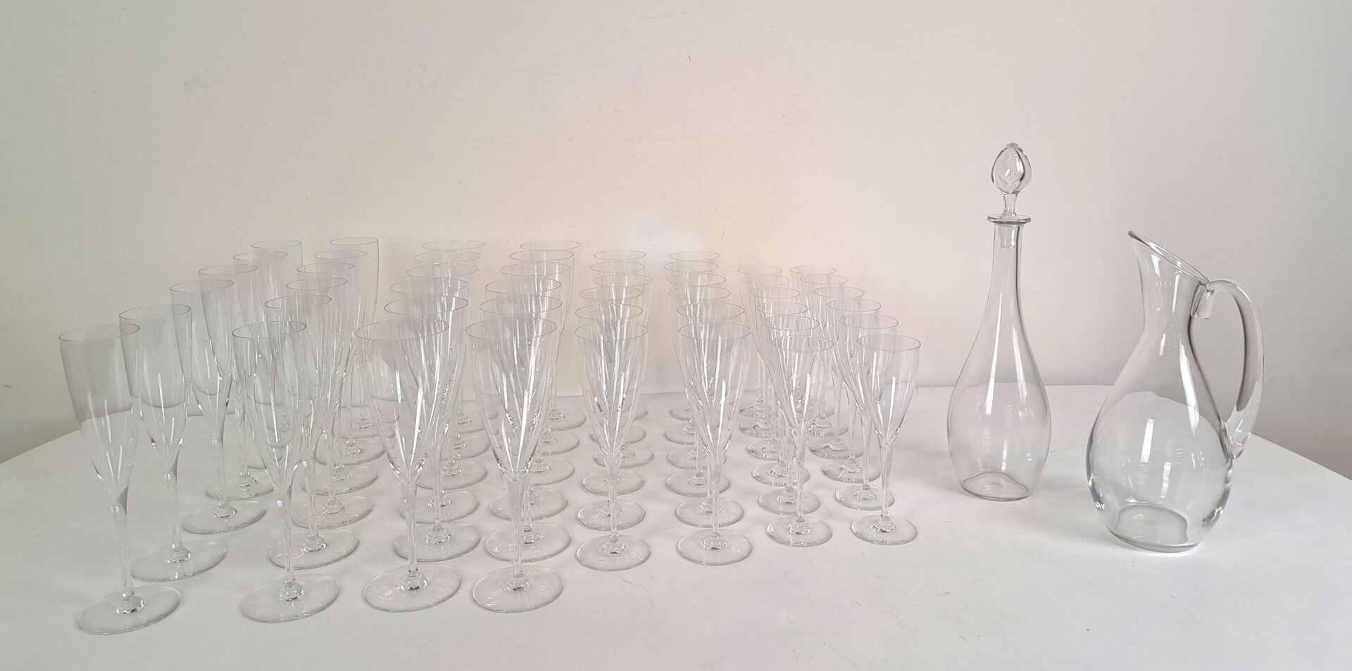 BACCARAT - Set of crystal glasses, "Dom Perignon" model, comprising: twelve white wine glasses (height: 18.5 cm), twelve red wine glasses (height: 20.5 cm), twelve water glasses (height: 23.5 cm), twelve champagne flutes (height: 23.5 cm), a wine carafe with its stopper and a water jug.