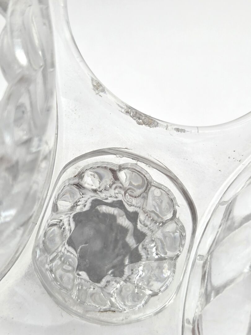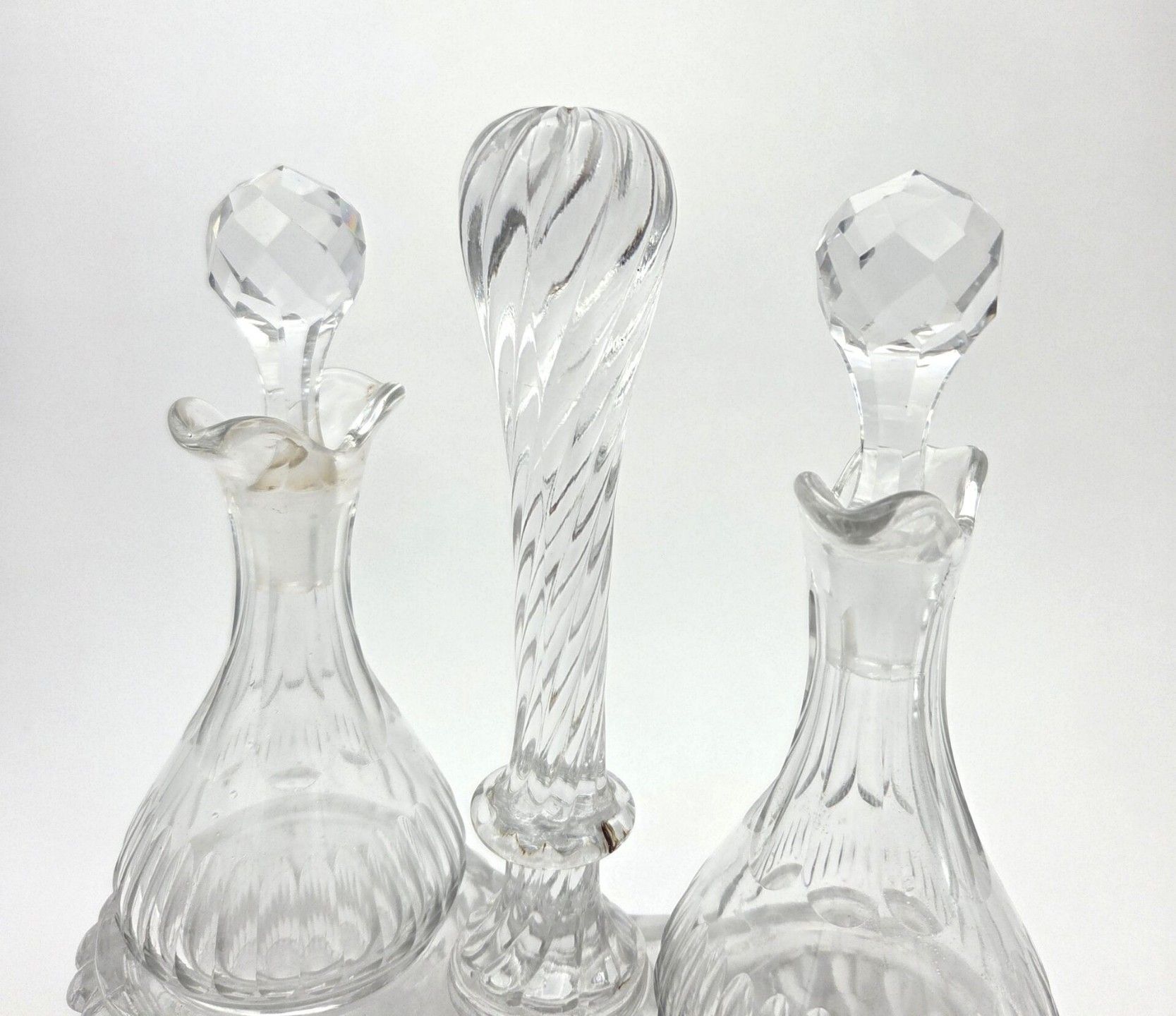 BACCARAT. Pressed moulded oil and vinegar cruet decorated with twisted gadroons, height: 22 cm length: 23 cm, chips on the edges of the bottle supports.