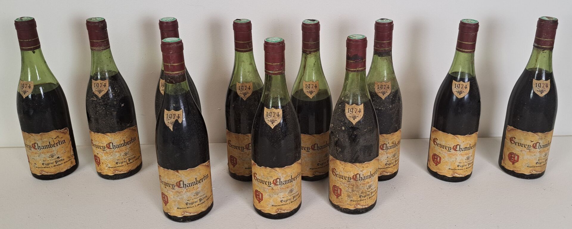 BOURGOGNE - 7 bottles, Gevery-Chambertin, Eugène Péron, 1974. Corks slightly engaged. 2.7 cm, 4.3 cm, 4.5 cm, 5 cm, 5.2 cm and 7 cm and 7.5 cm. Dirty caps. Slightly dirty escutcheons, one of which is also damaged. Dirty labels.