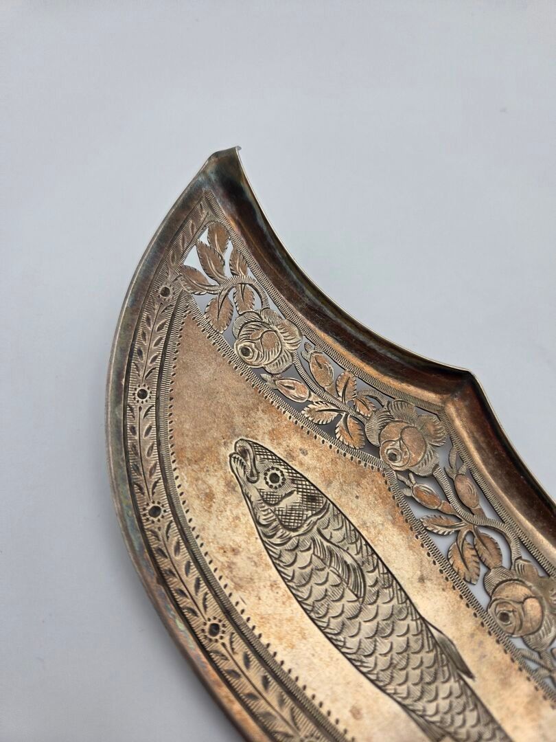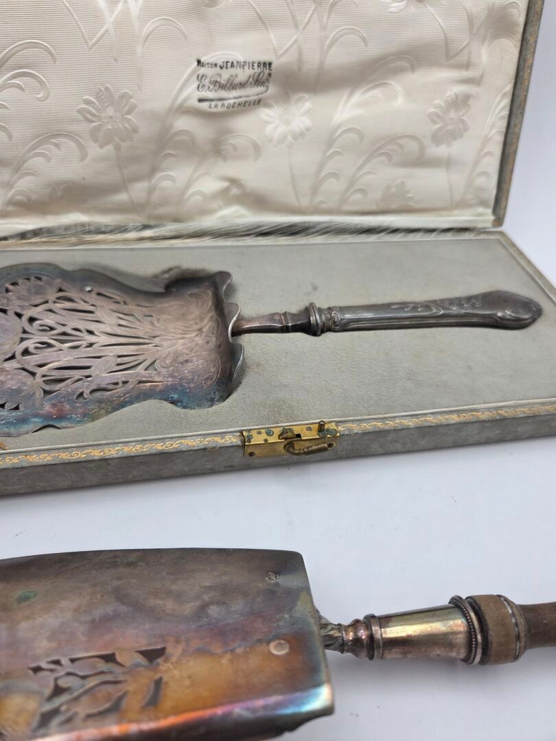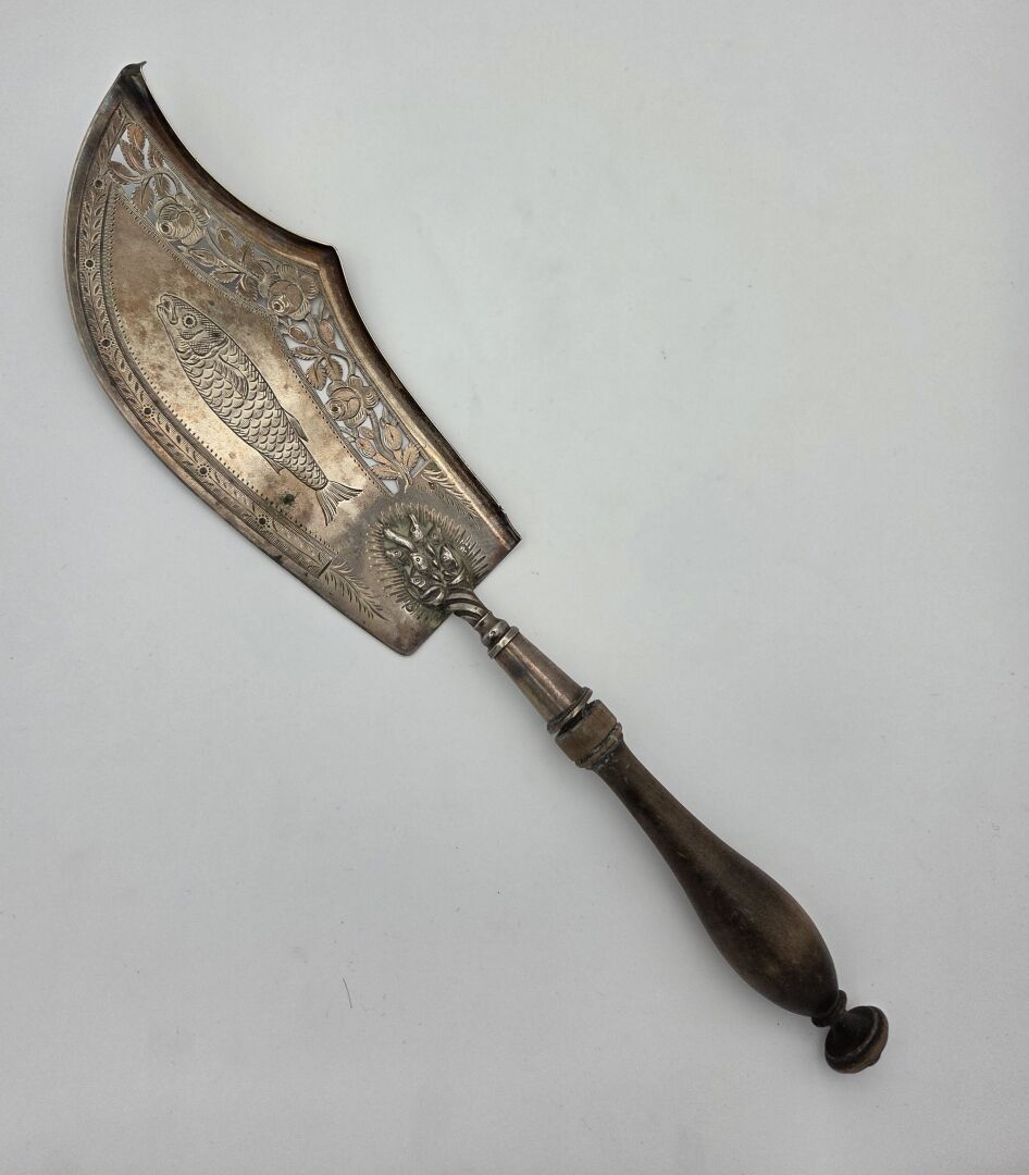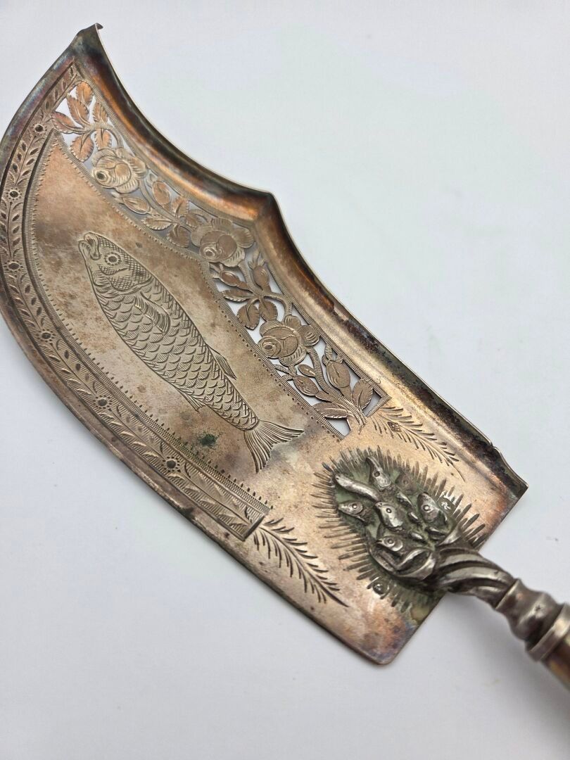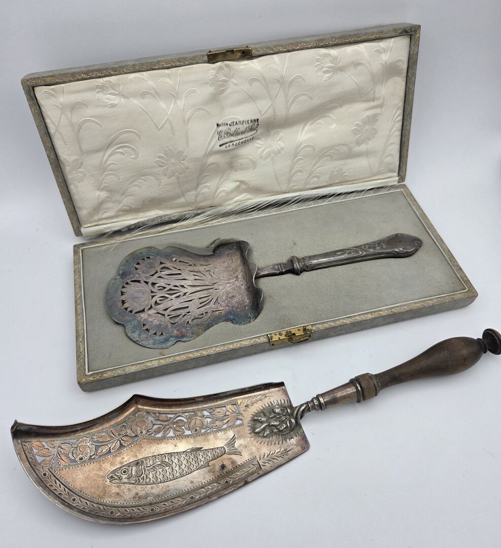 A Minerve hallmarked solid silver fish scoop engraved with a river fish - PB: 143 g - An asparagus scoop in silver plated metal with a forged silver handle and an openwork spatula decorated with flowers is attached.