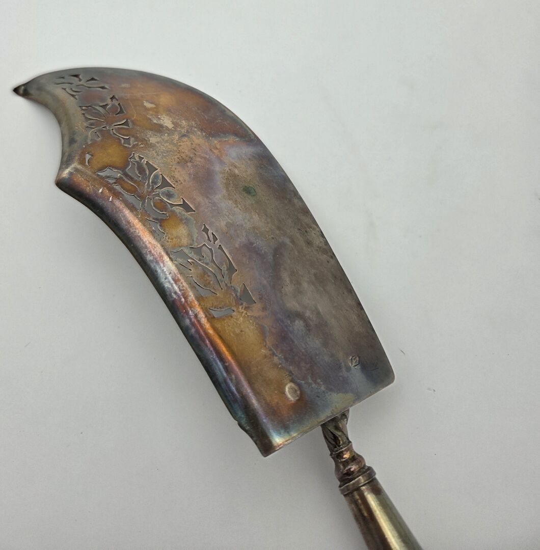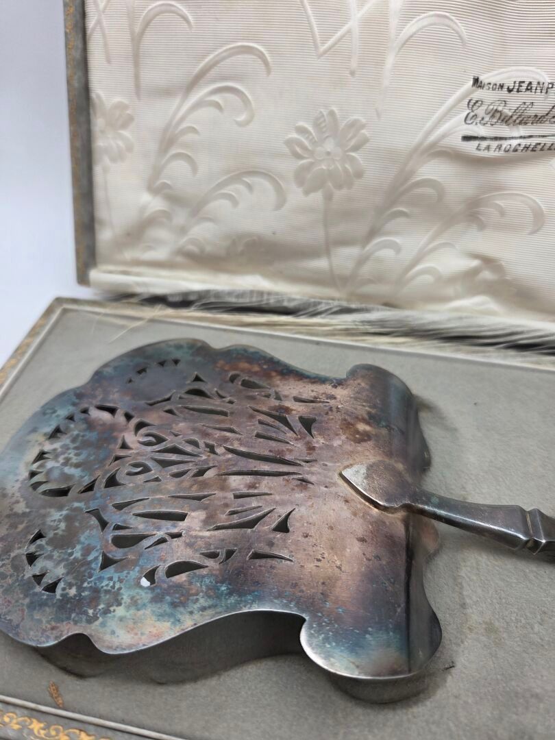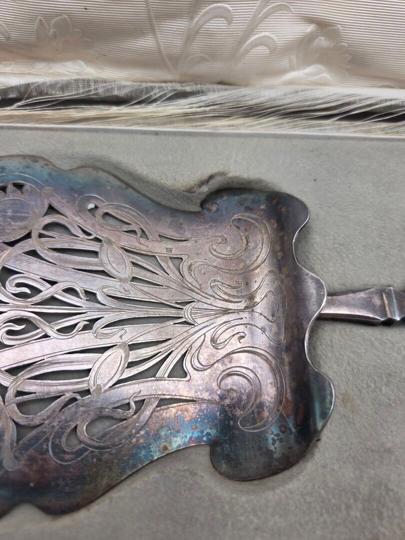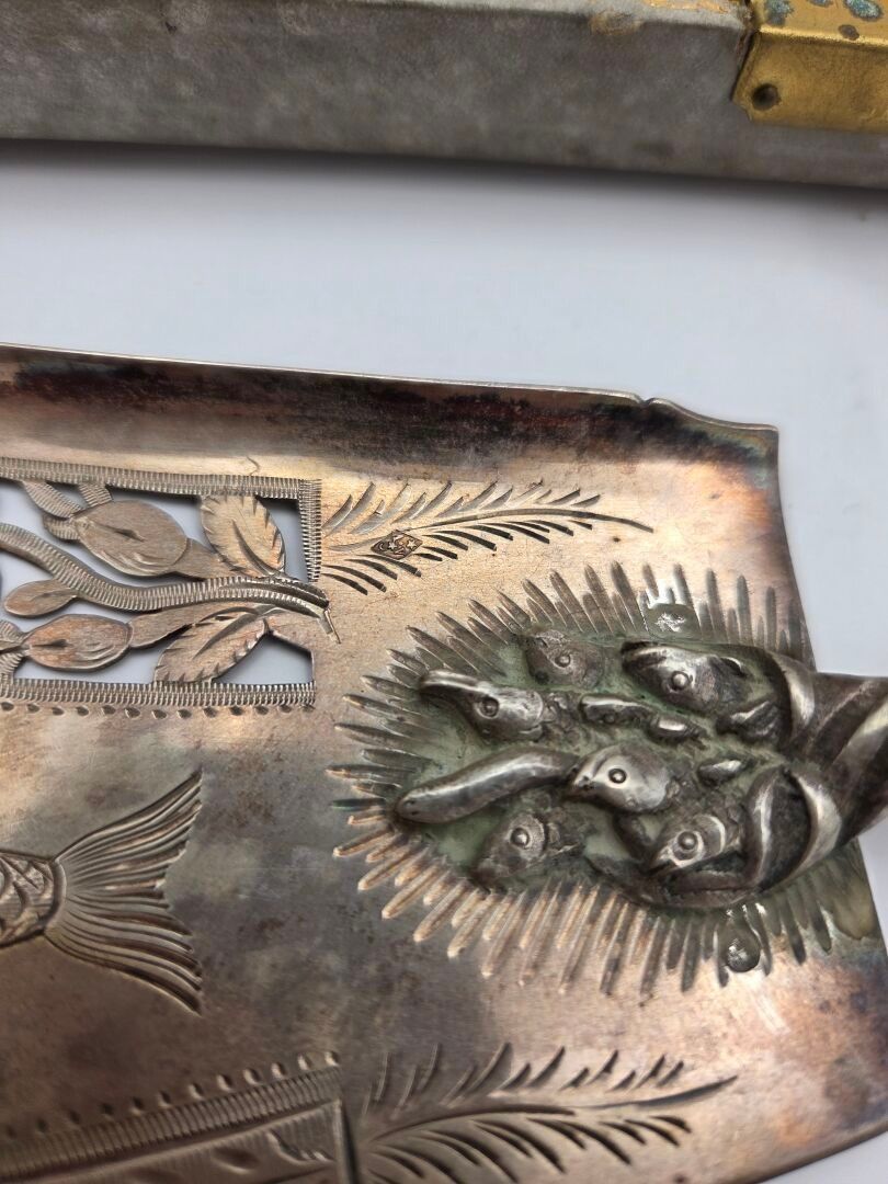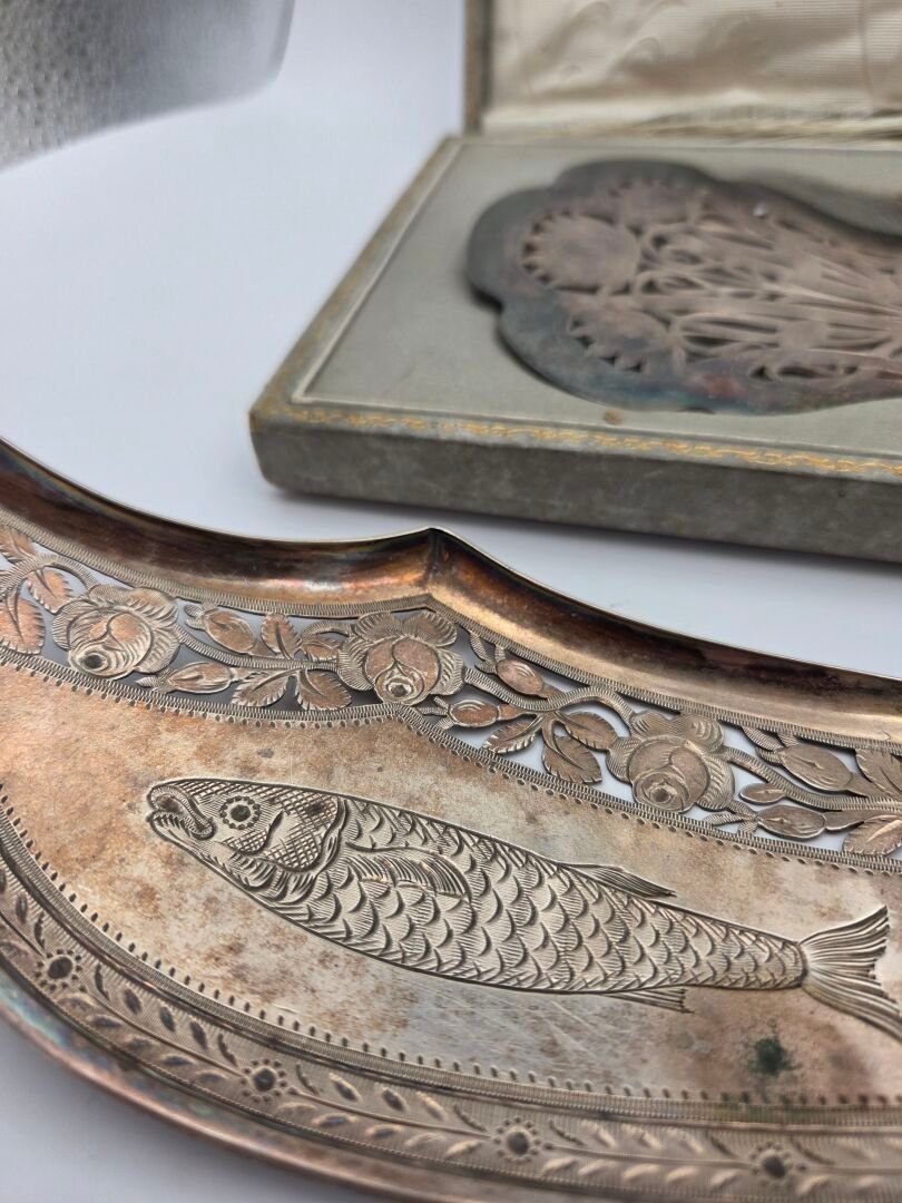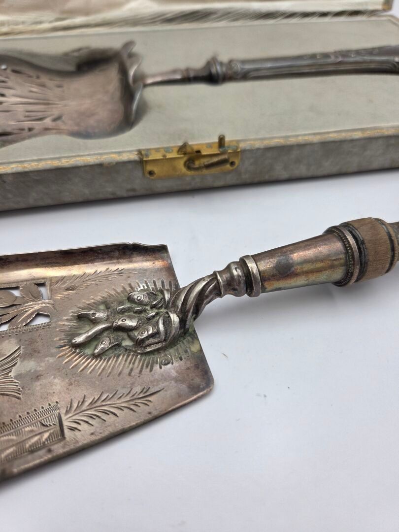 A Minerve hallmarked solid silver fish scoop engraved with a river fish - PB: 143 g - An asparagus scoop in silver plated metal with a forged silver handle and an openwork spatula decorated with flowers is attached.