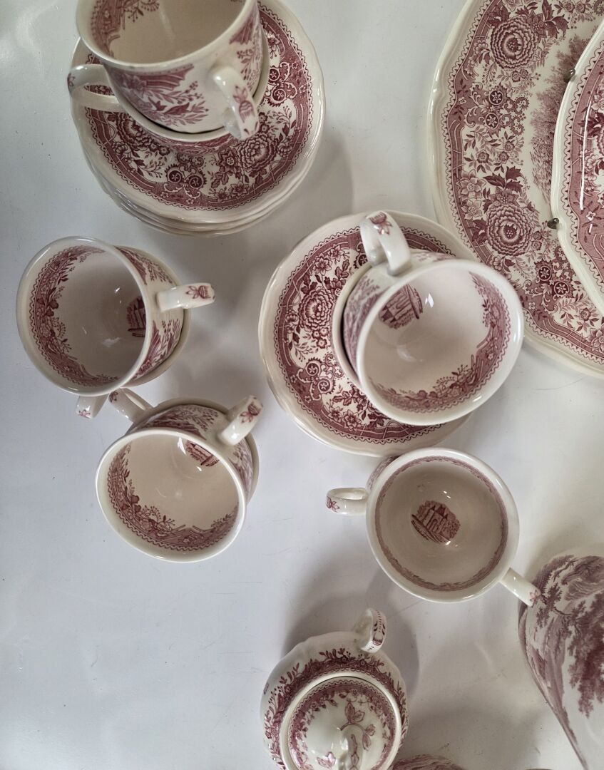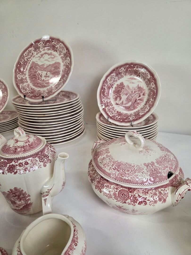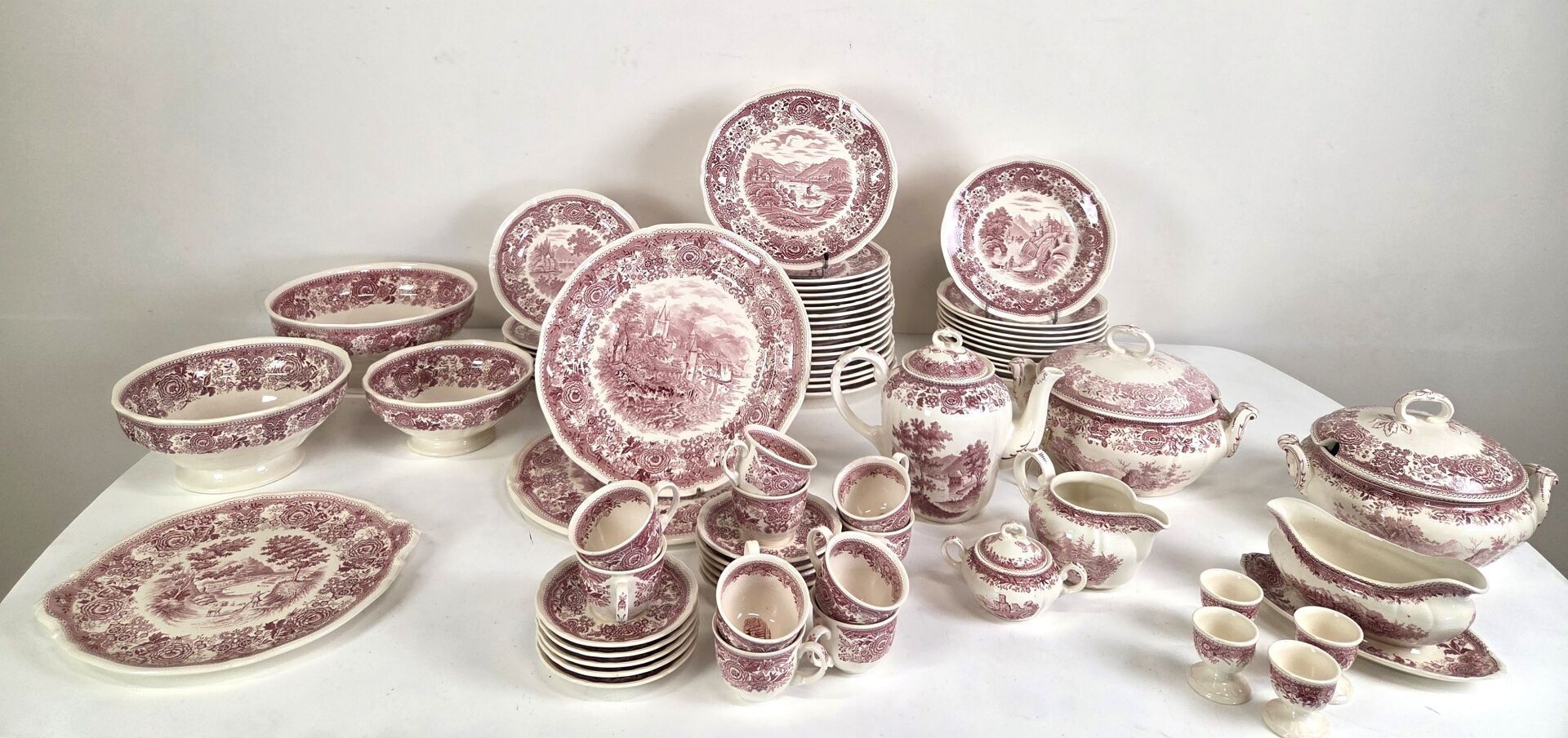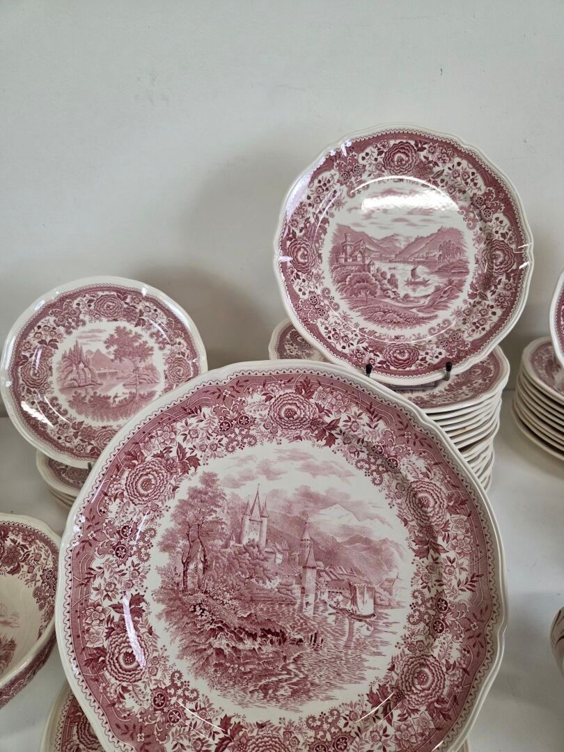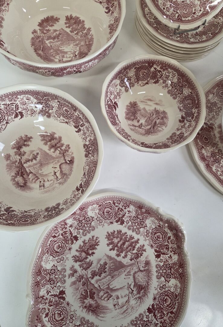 VILLEROY & BOCH - "Burgenland" model - An earthenware service with pink printed decoration, comprising: seventeen dinner plates, eleven soup plates, eight dessert plates, a soup tureen, a vegetable dish, a sauceboat, two dishes including a hors d'oeuvre (missing), a pie dish, three salad bowls, four egg cups, a teapot, a milk jug, a sugar bowl, eleven saucers, and ten cups (chips).