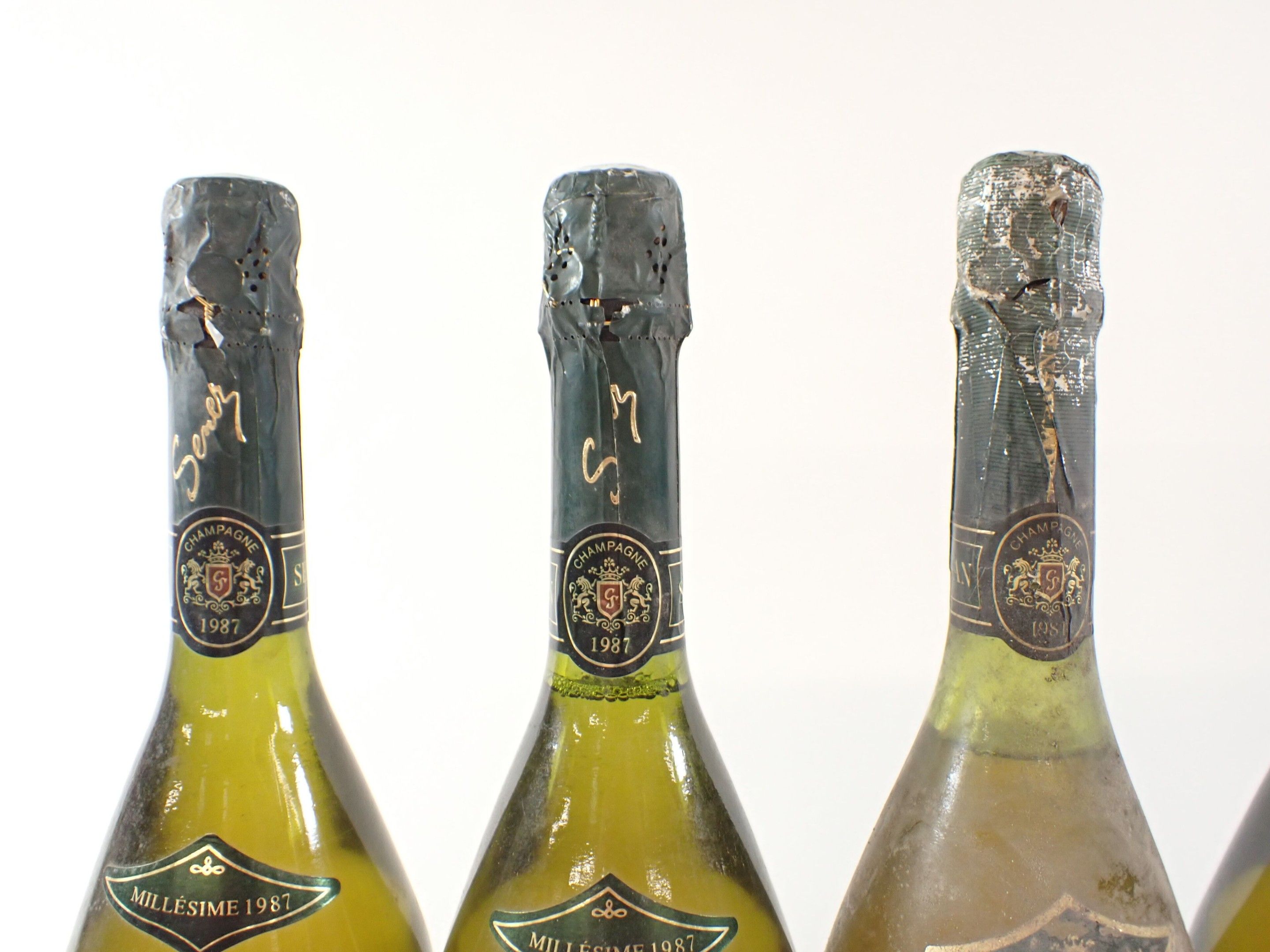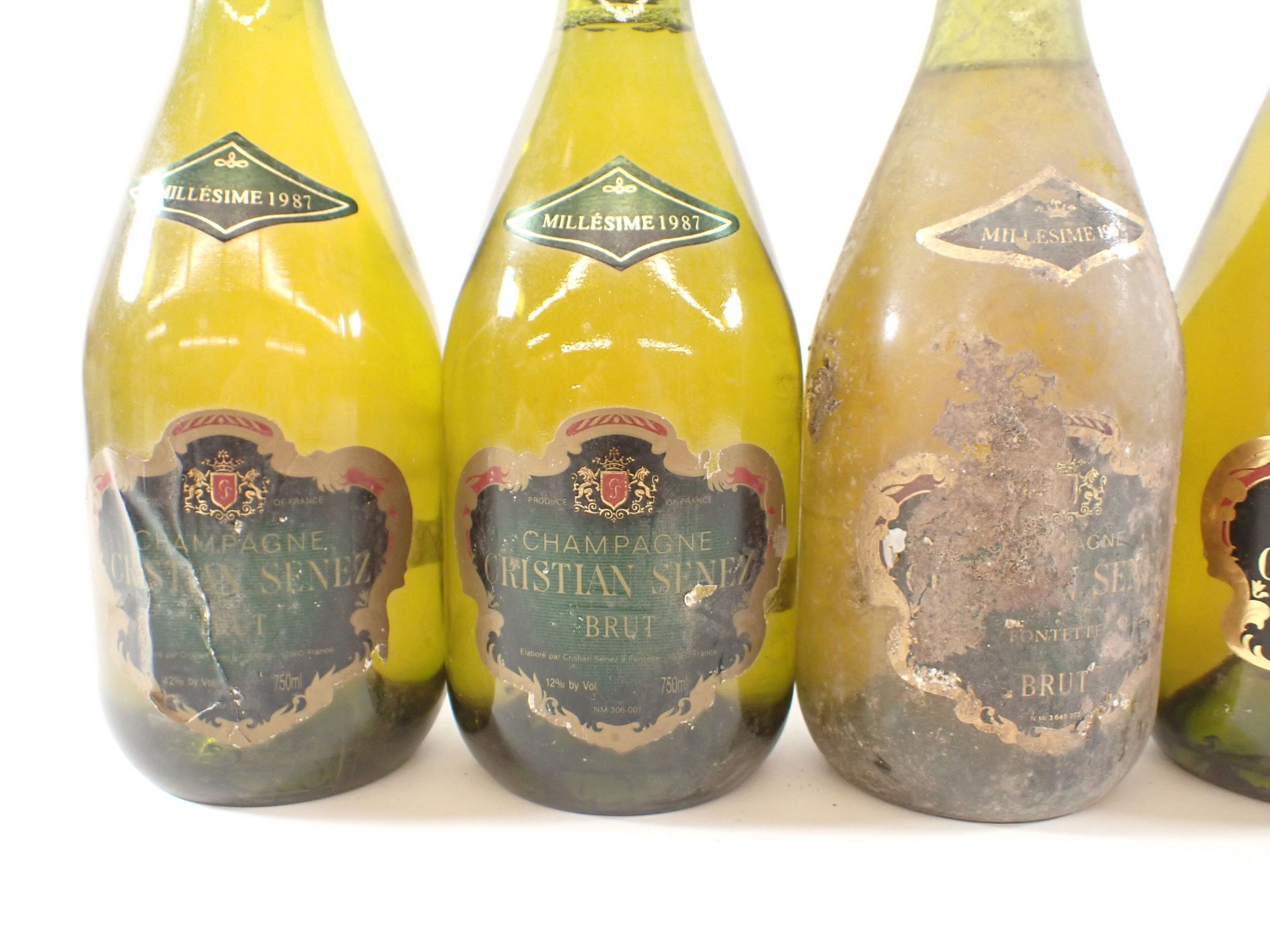 4 bottles, Champagne, Christian Senez, Brut, 1981 (1), 1987 (2) and 1989 (1). Covers slightly dirty to dirty and slightly damaged to damaged. One crest is dirty. Labels slightly dirty to very dirty and slightly damaged to damaged.