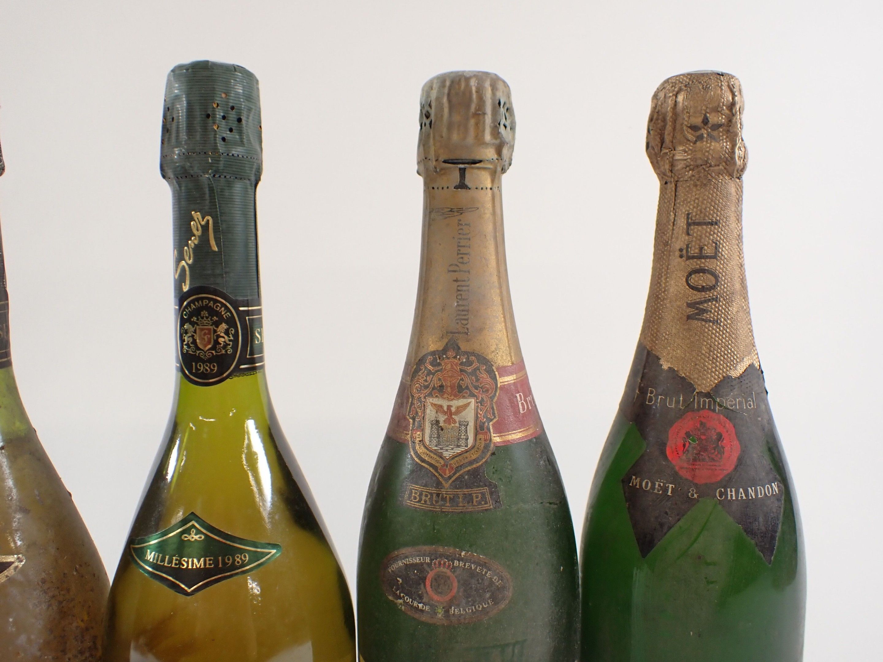 1 bottle, Champagne, Laurent Perrier, Brut. Dirty cap and crest. Label dirty to very dirty and damaged.