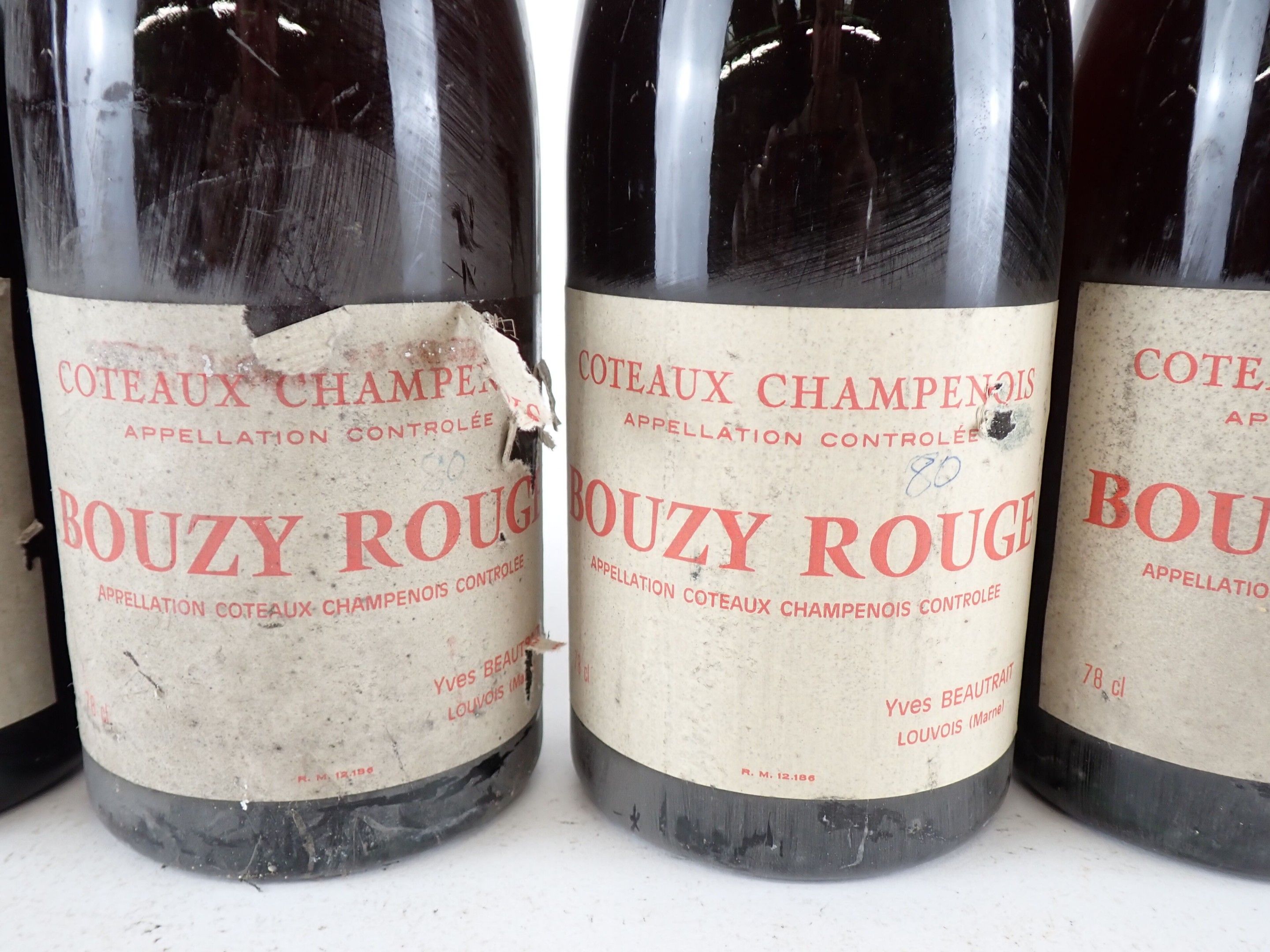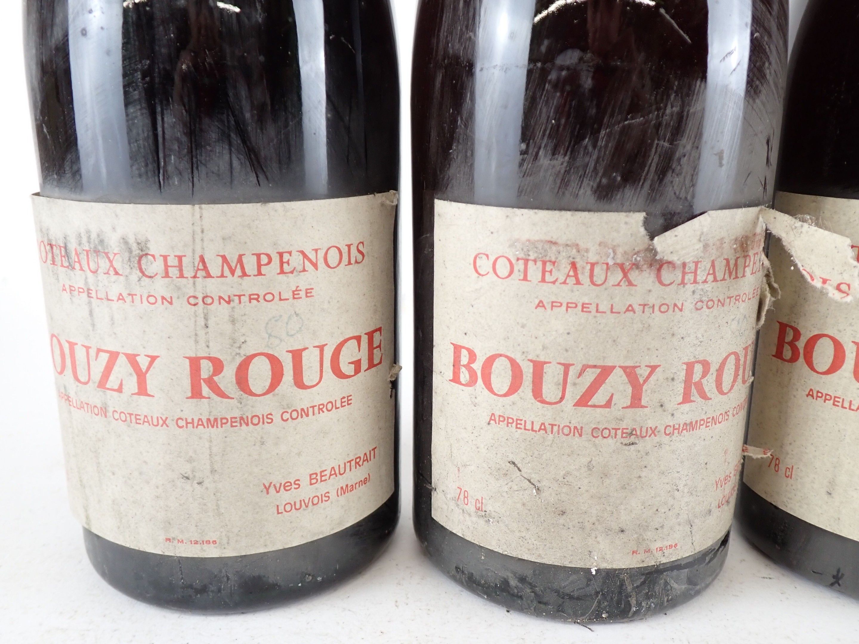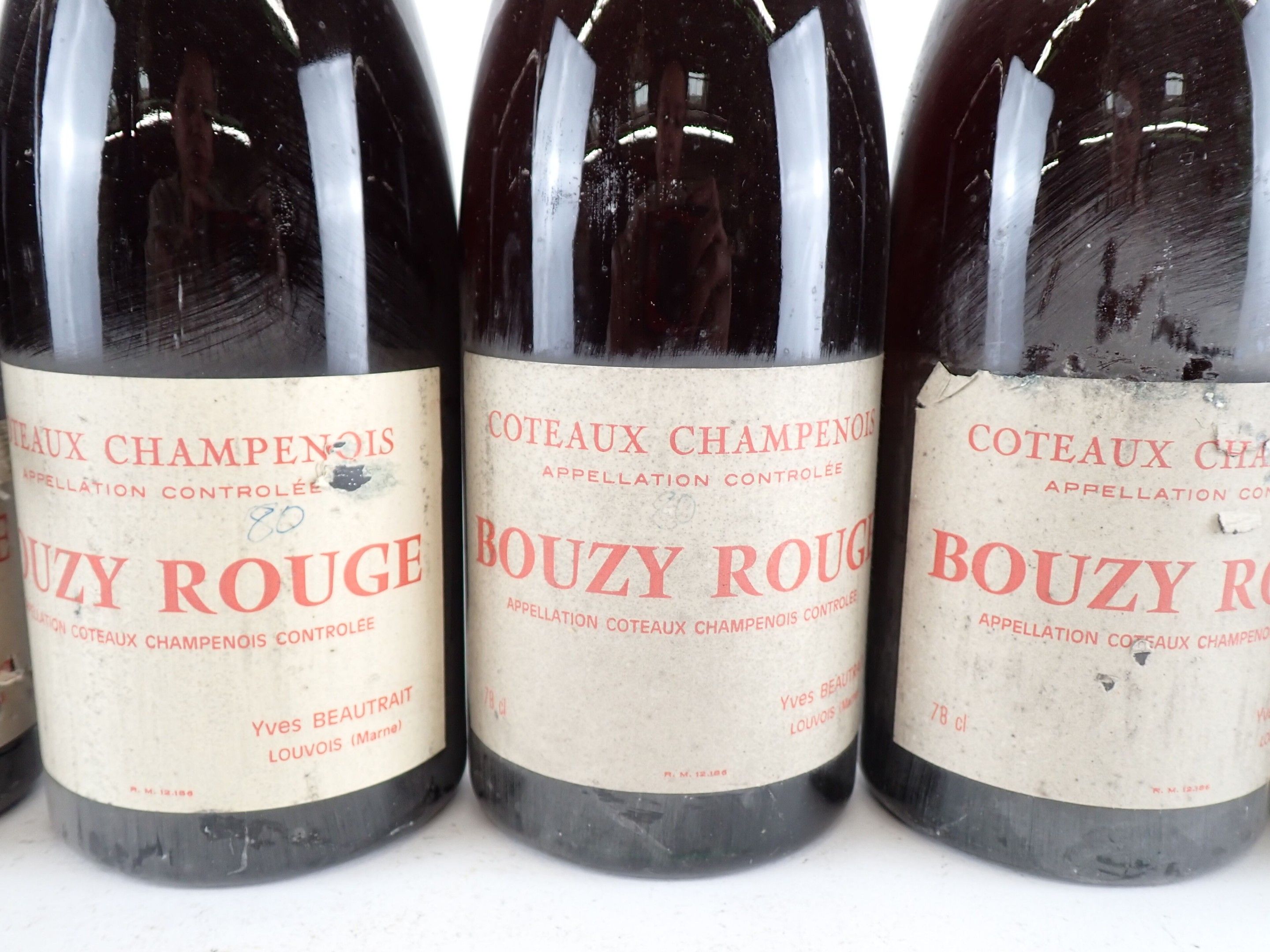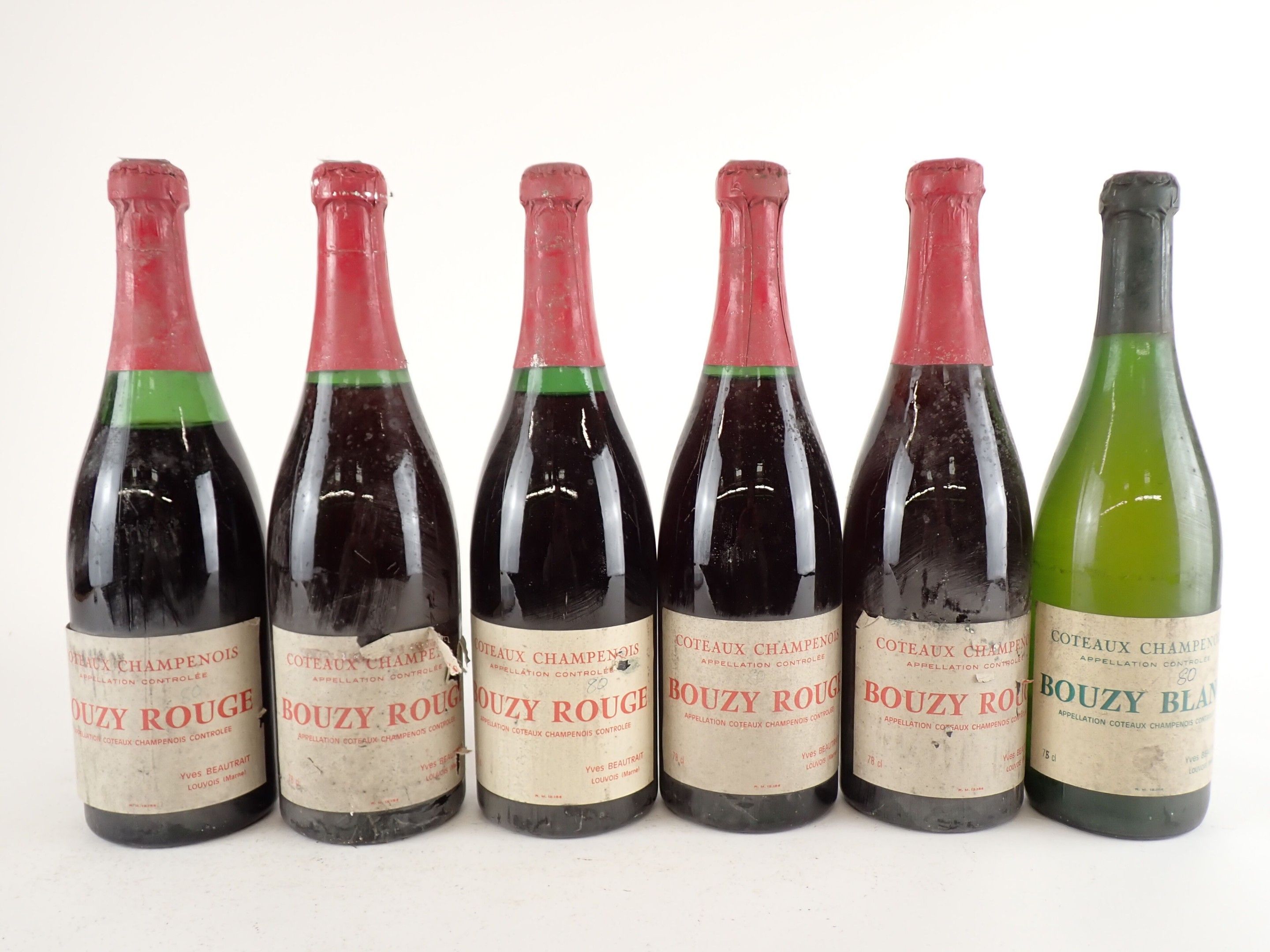 5 bottles, Coteaux Champenois 'Bouzy Rouge', Yves Beautrait. Level at 2.3 cm under the cap or better. Dirty caps. Dirty labels, four of which are slightly faded to faded.