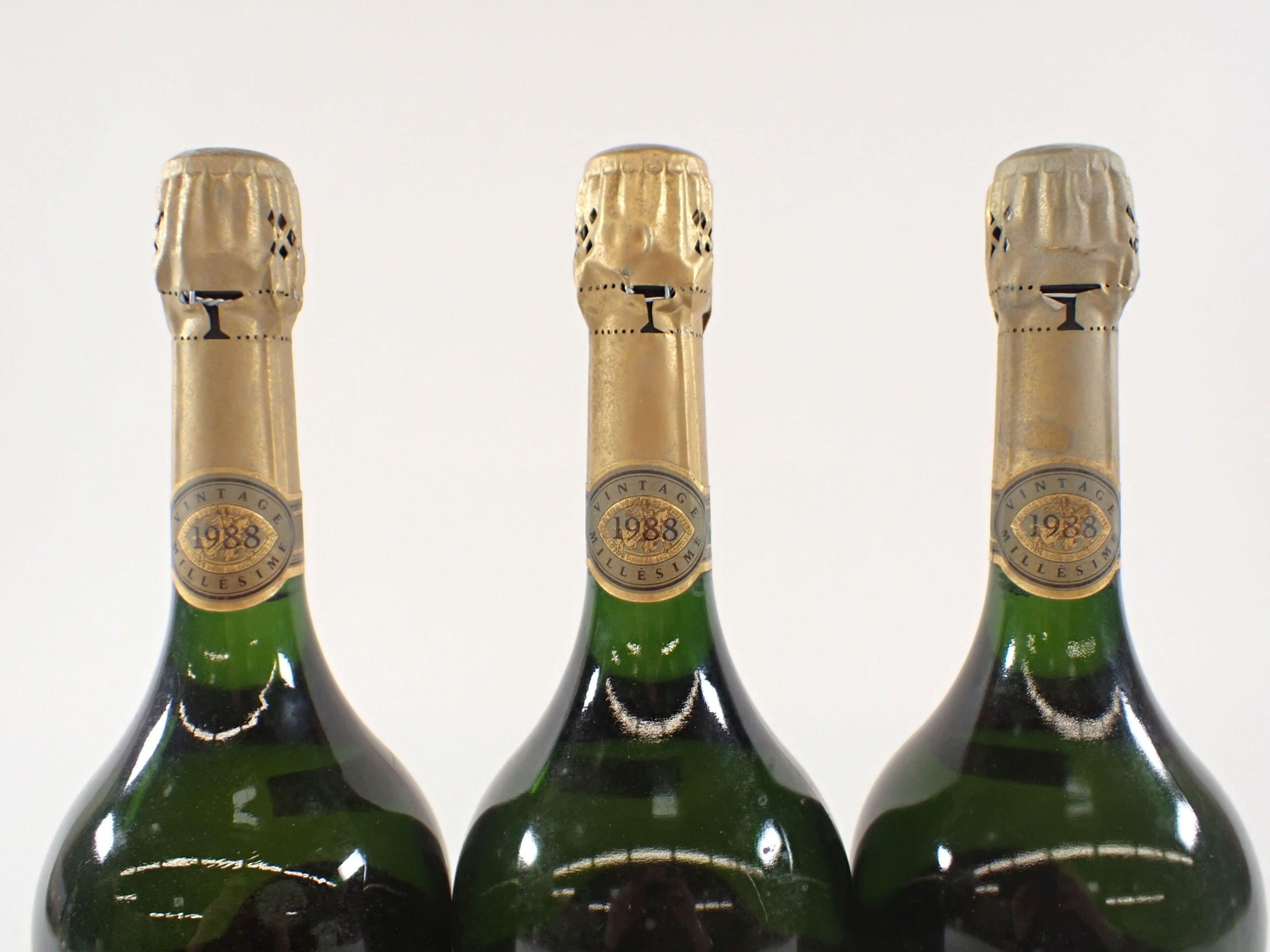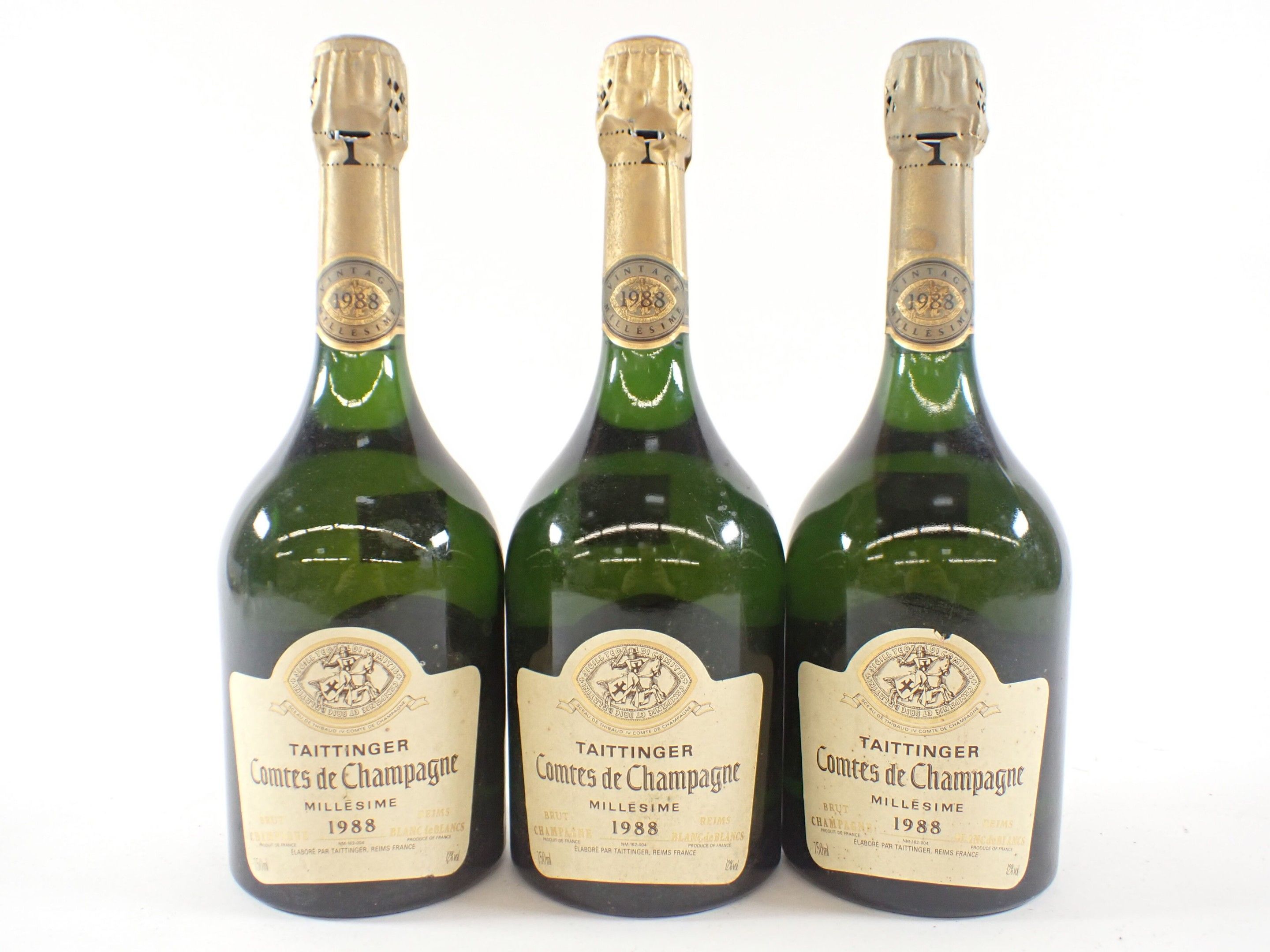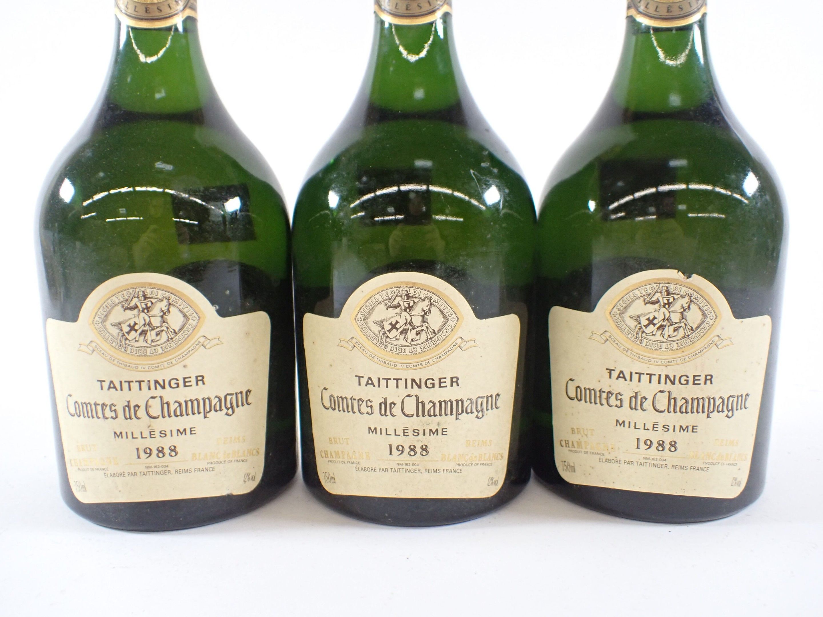 CHAMPAGNE - 3 bottles, Champagne, Taittinger, Comtes de Champagne, 1988. Covers, labels and back labels slightly dirty.