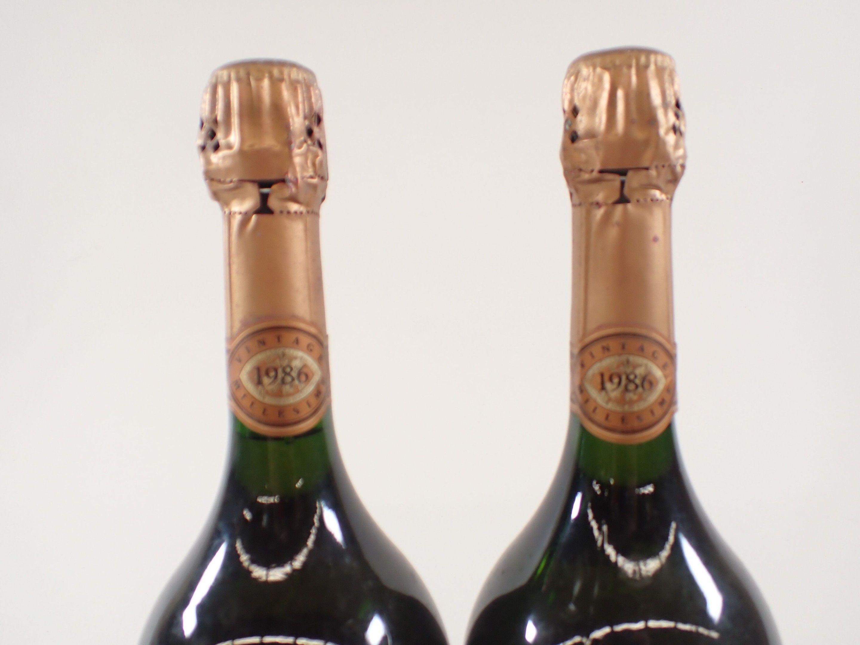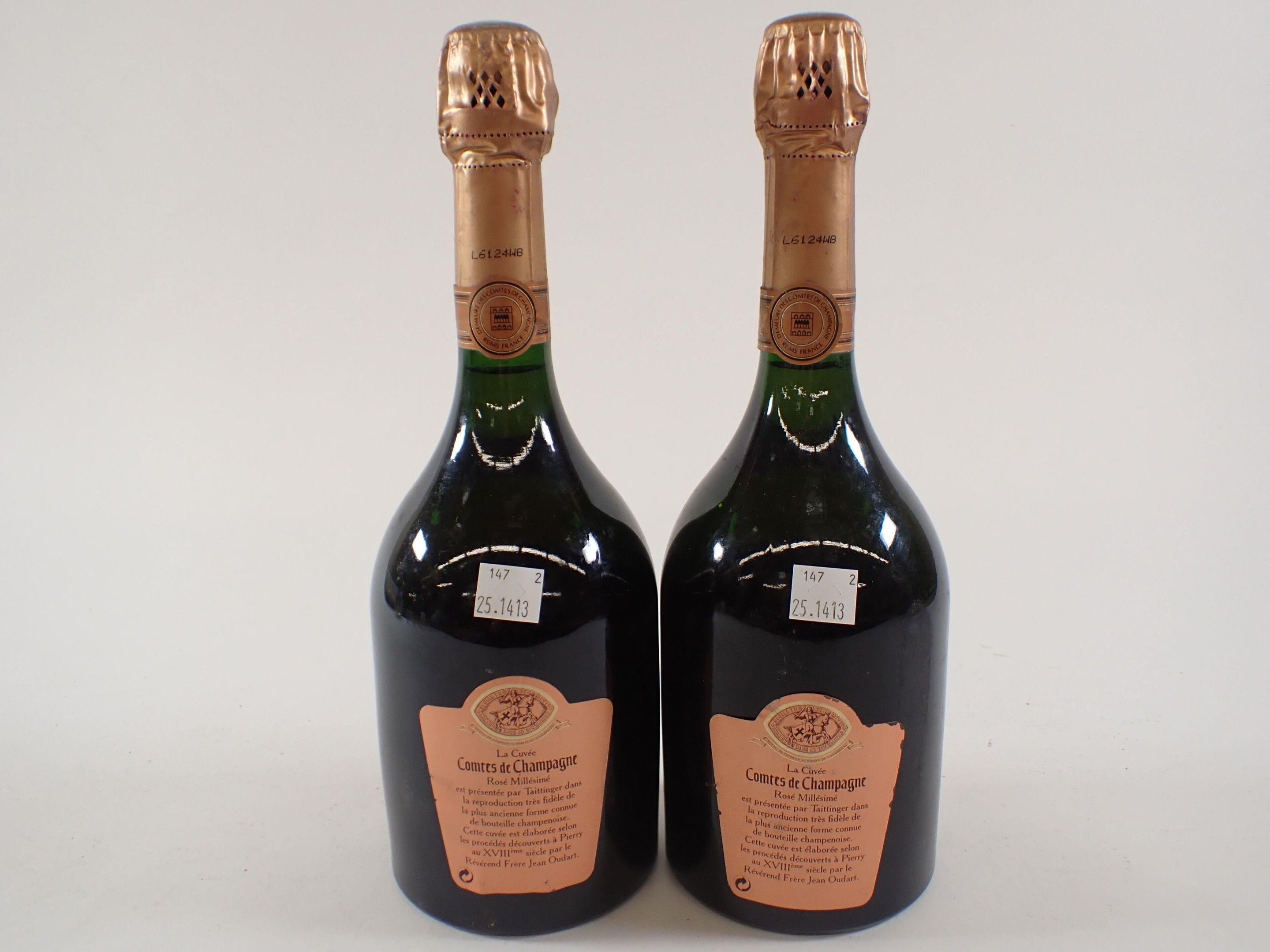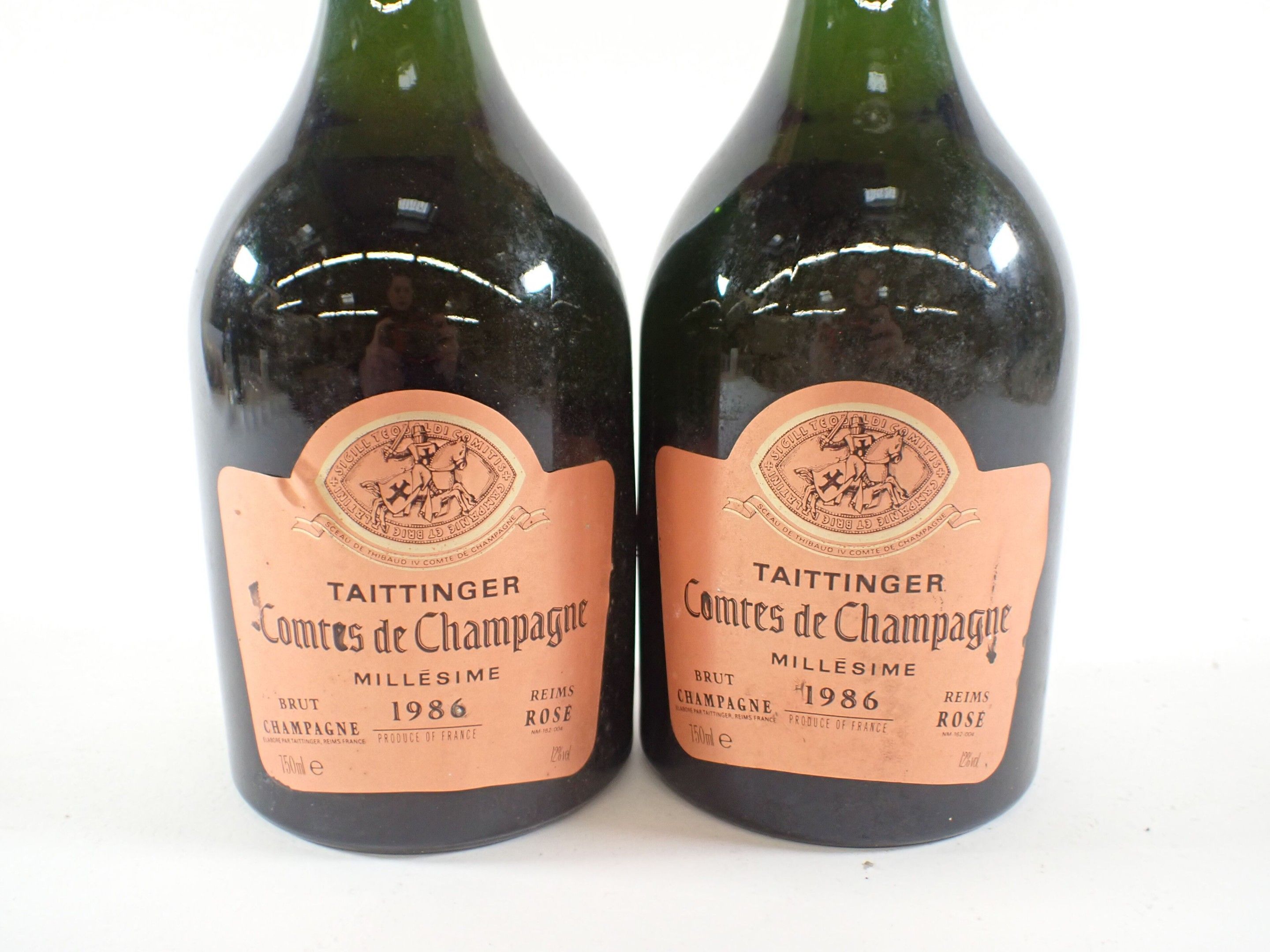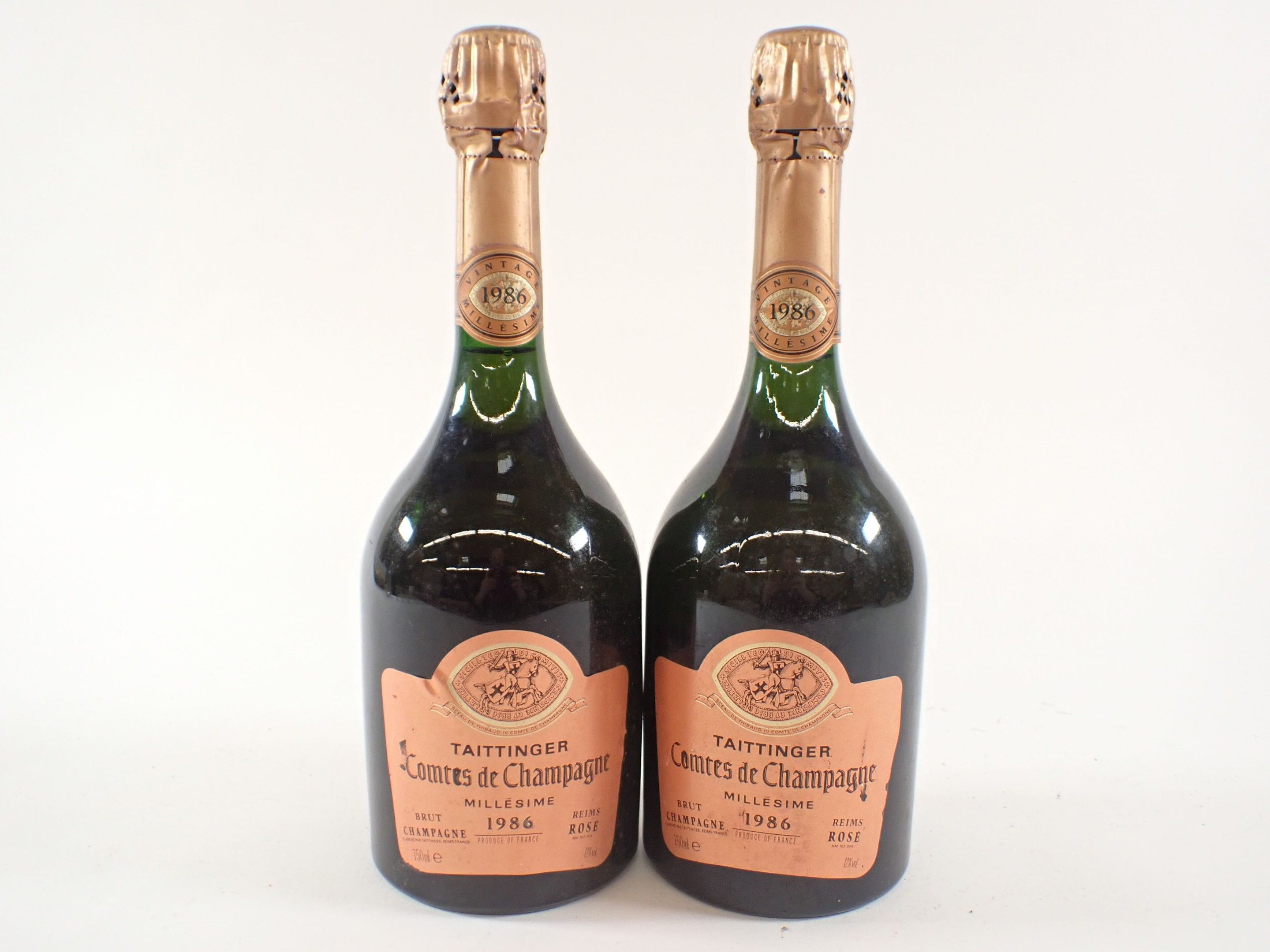 CHAMPAGNE - 2 bottles, Champagne, Taittinger, Comtes de Champagne Rosé, 1986. Covers, labels and back labels slightly dirty. One label and one back label show a small spot of detachment.