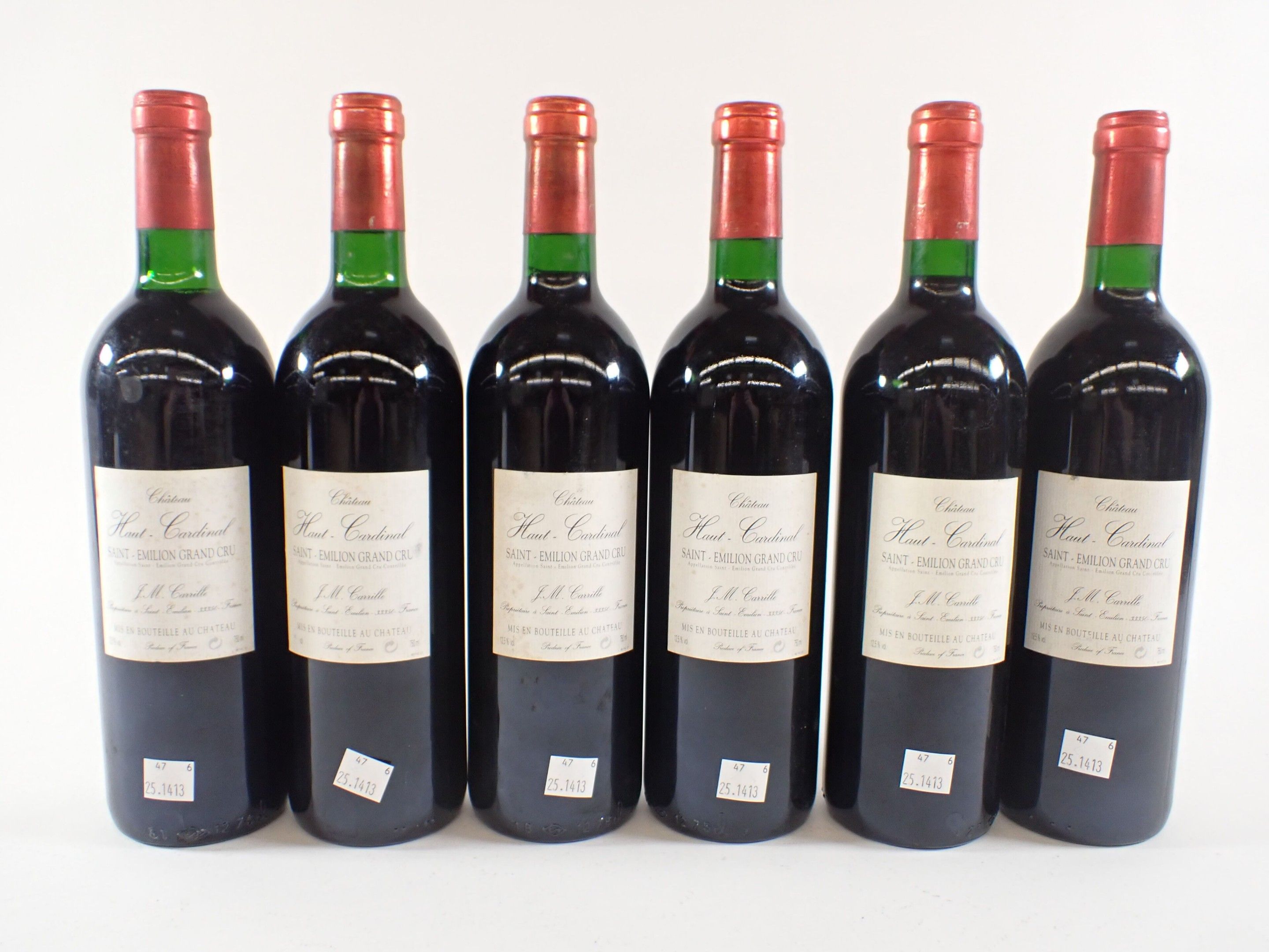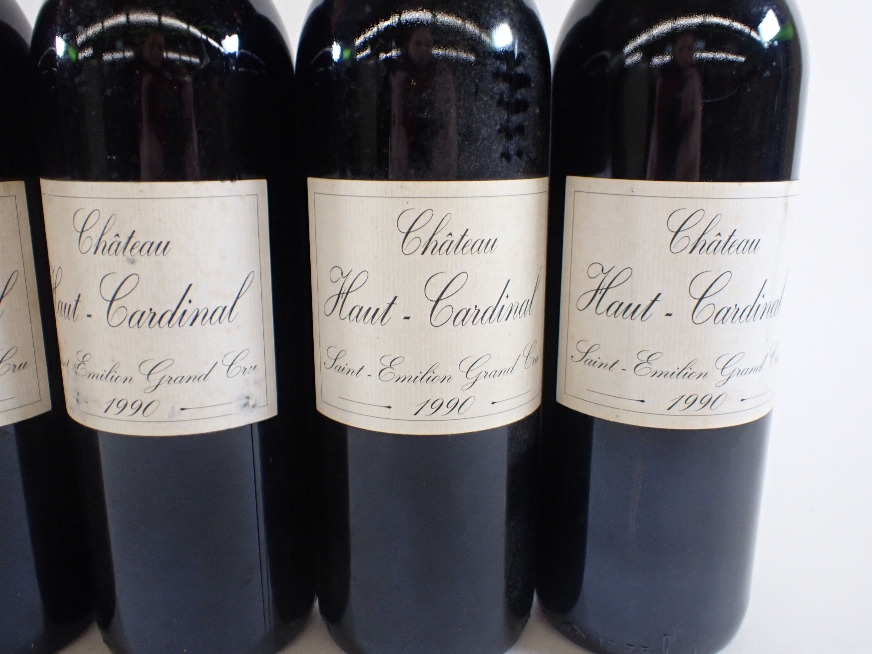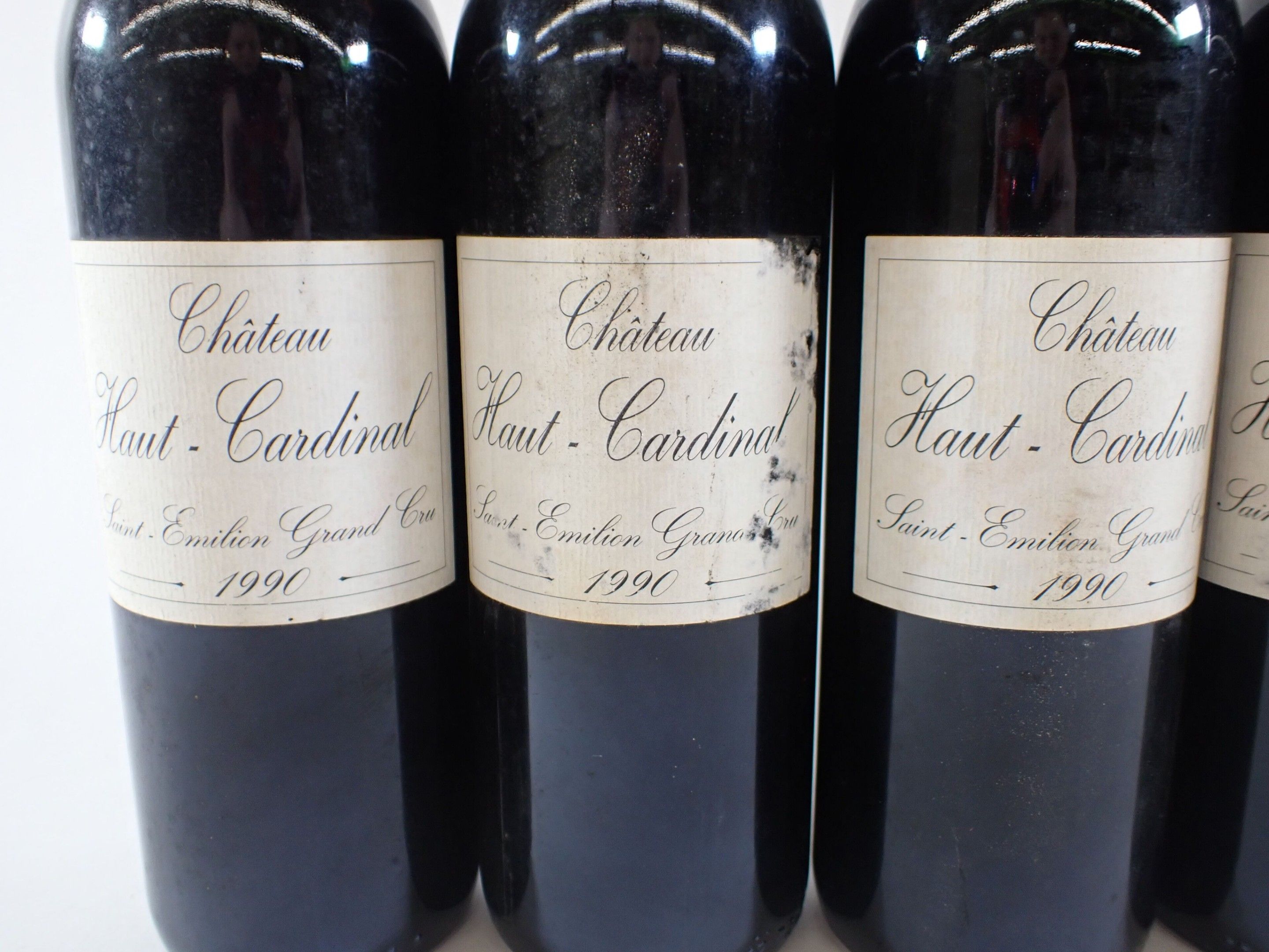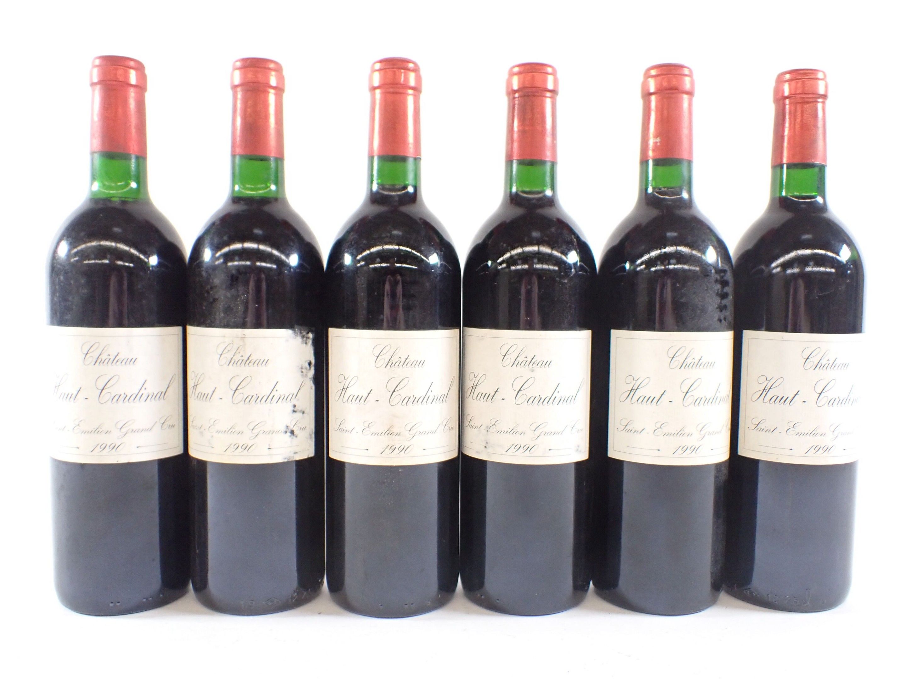 BORDEAUX - 6 bottles, Saint-Emilion Grand Cru, Château Haut-Cardinal, 1990. 3 BG (+), 1 BG and 1 BG (-). Caps slightly dirty, three of which are curved. Slightly dirty labels, three of which are damaged. Back labels slightly dirty.