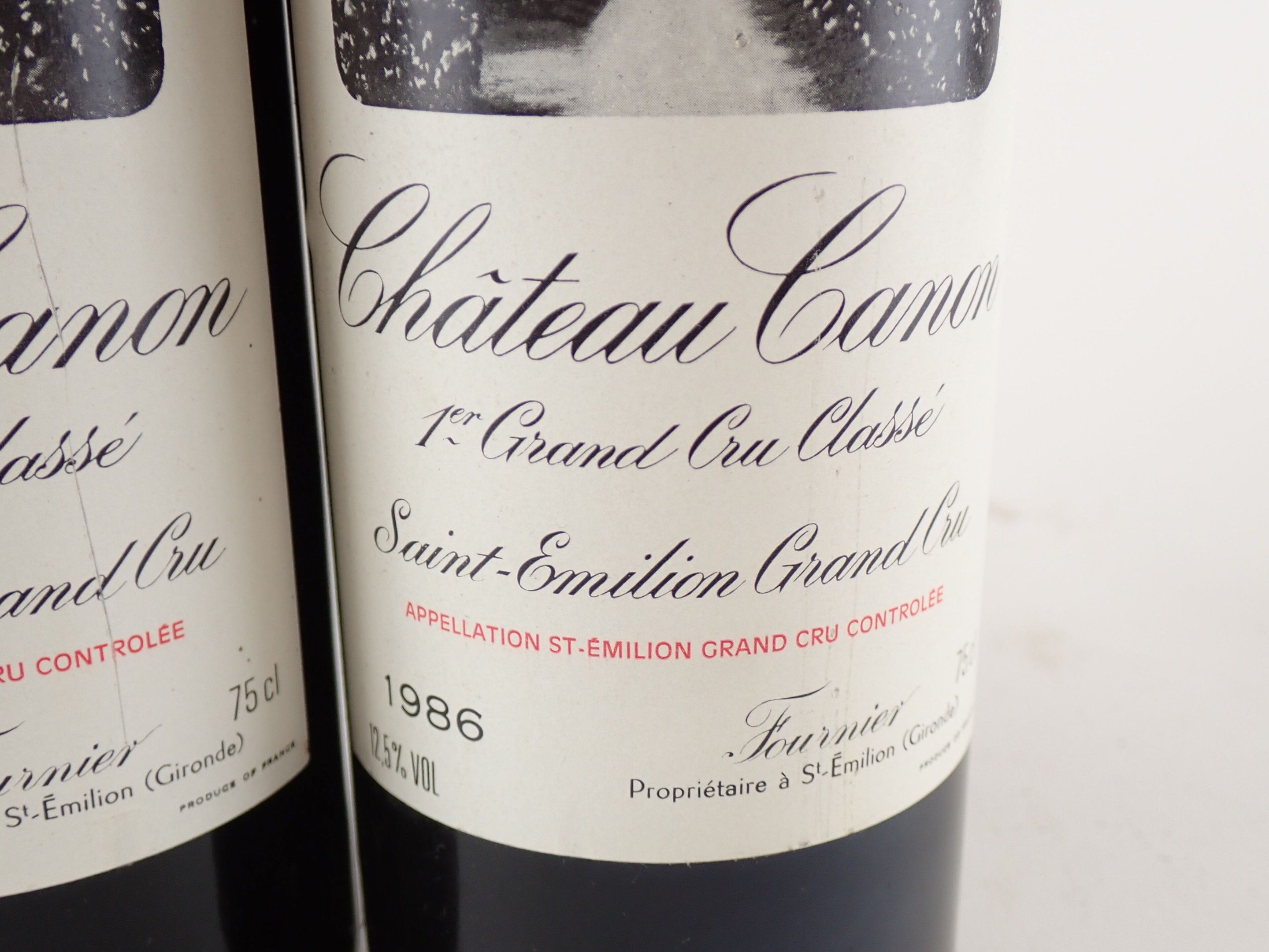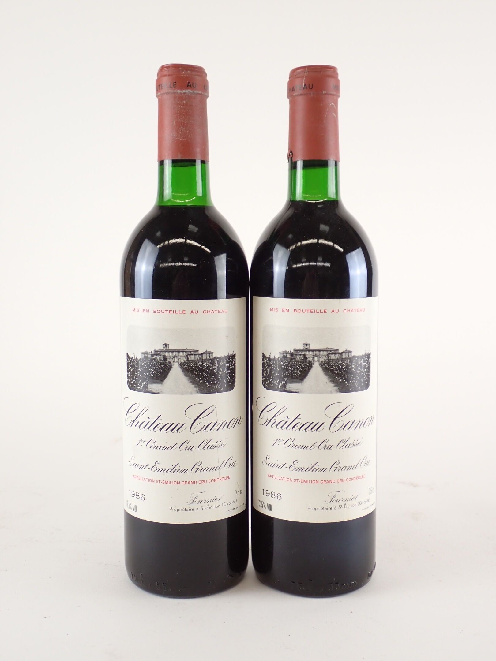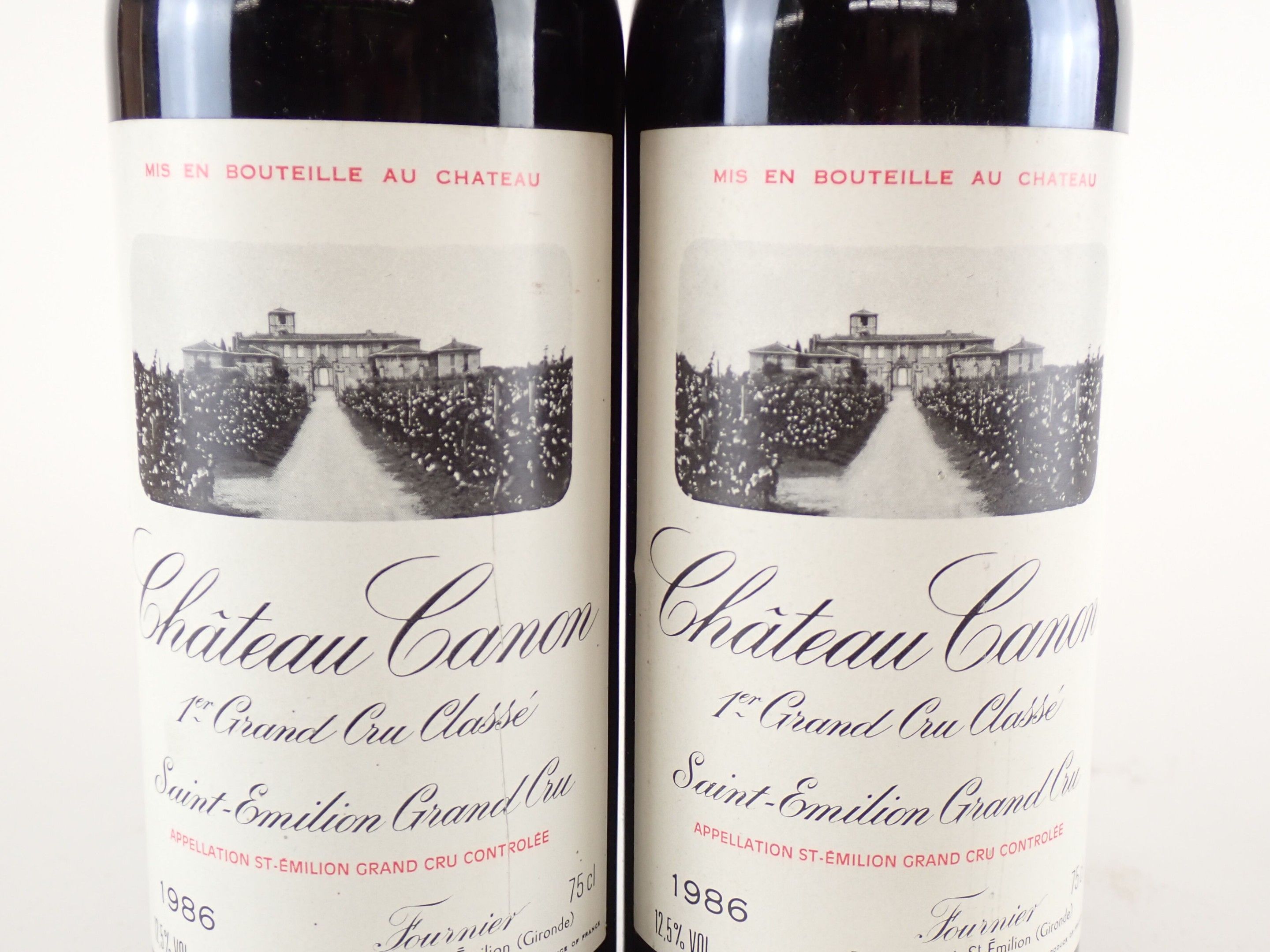 BORDEAUX - 2 bottles, Saint-Emilion Grand Cru, Château Canon, 1er Grand Cru Classé, 1986. 1 BG and 1 BG (-). Caps slightly dirty with traces of rubbing, one of which is slightly damaged at the bottom of the skirt. Some light marks on the labels.