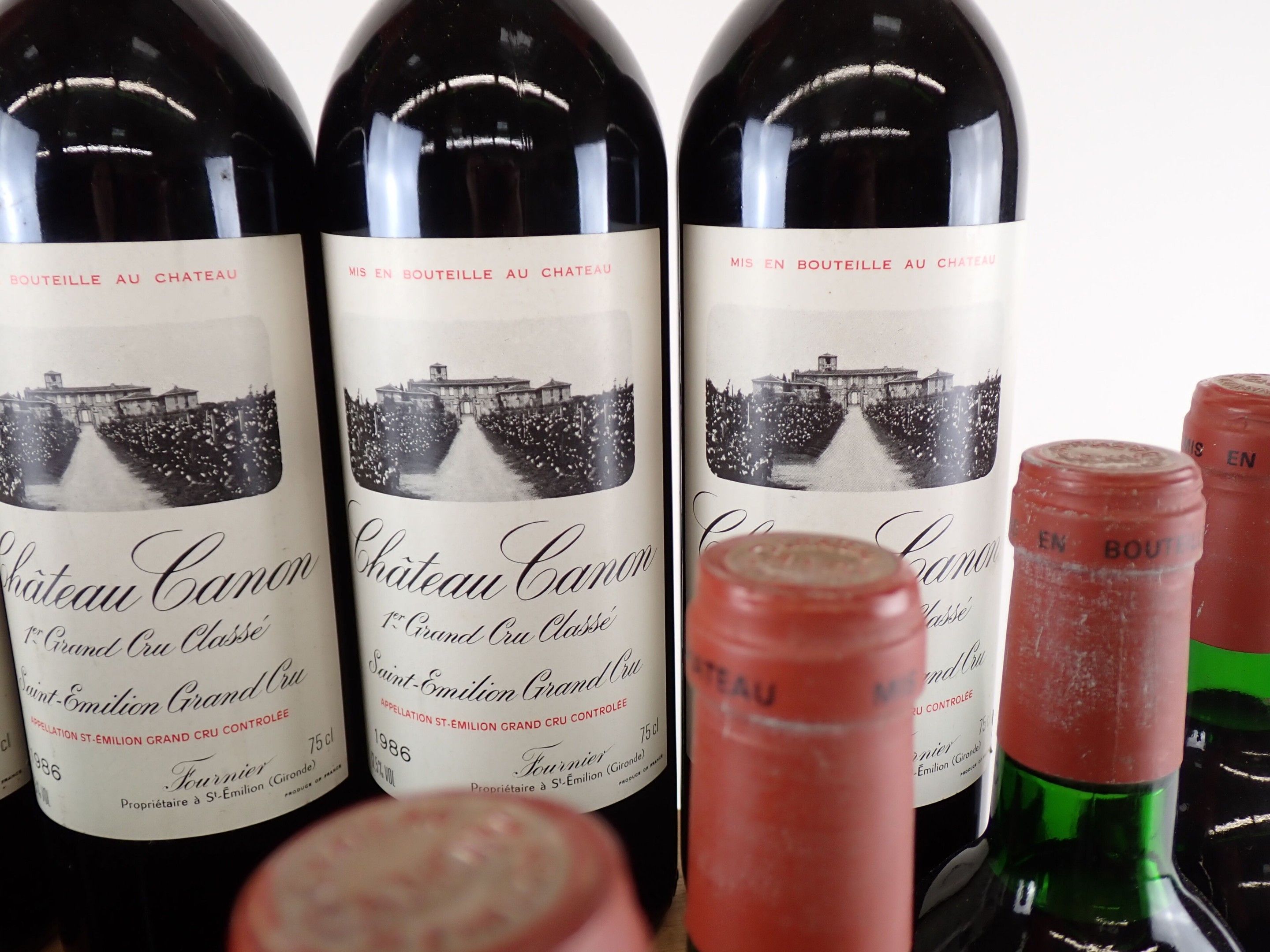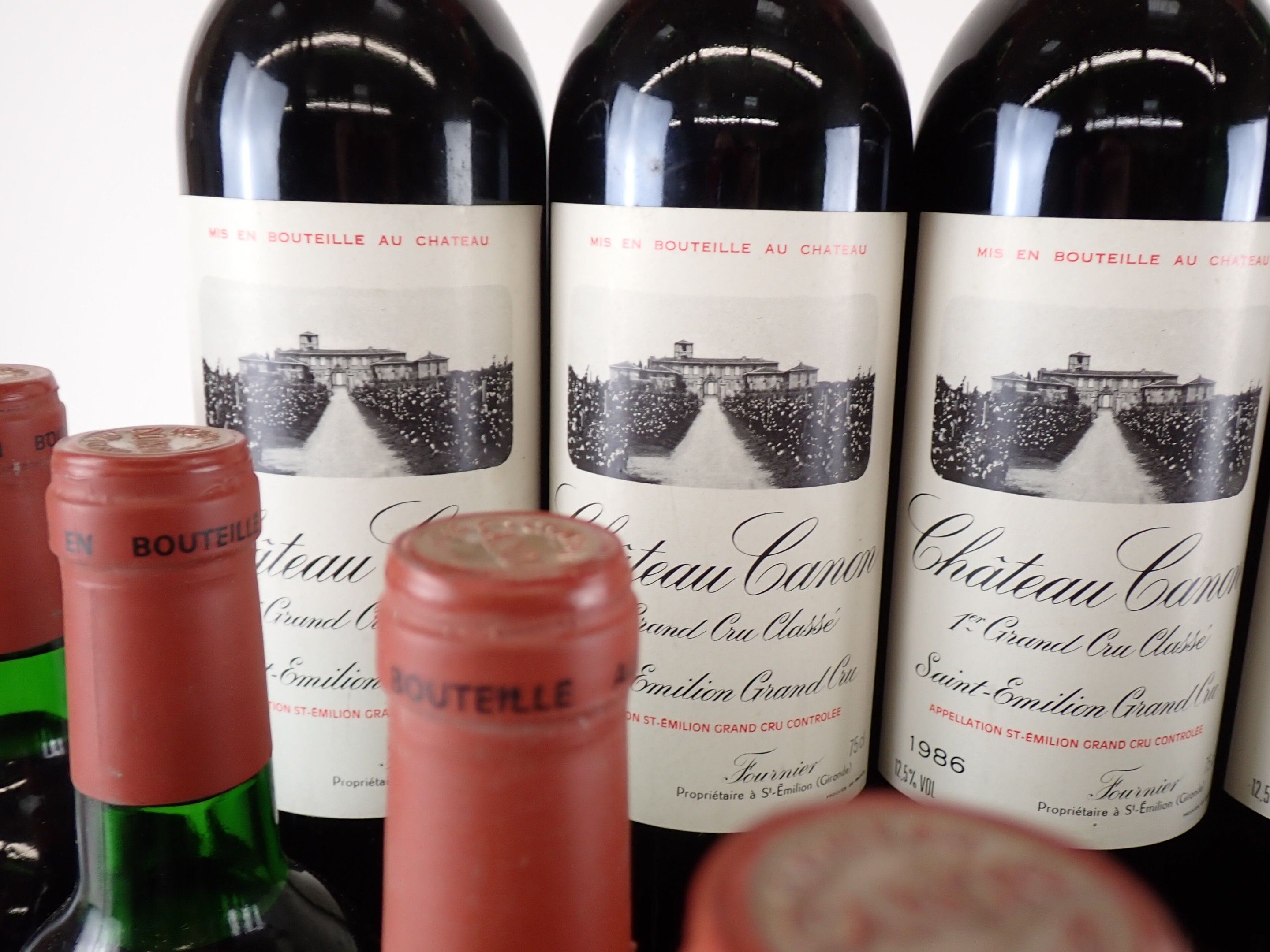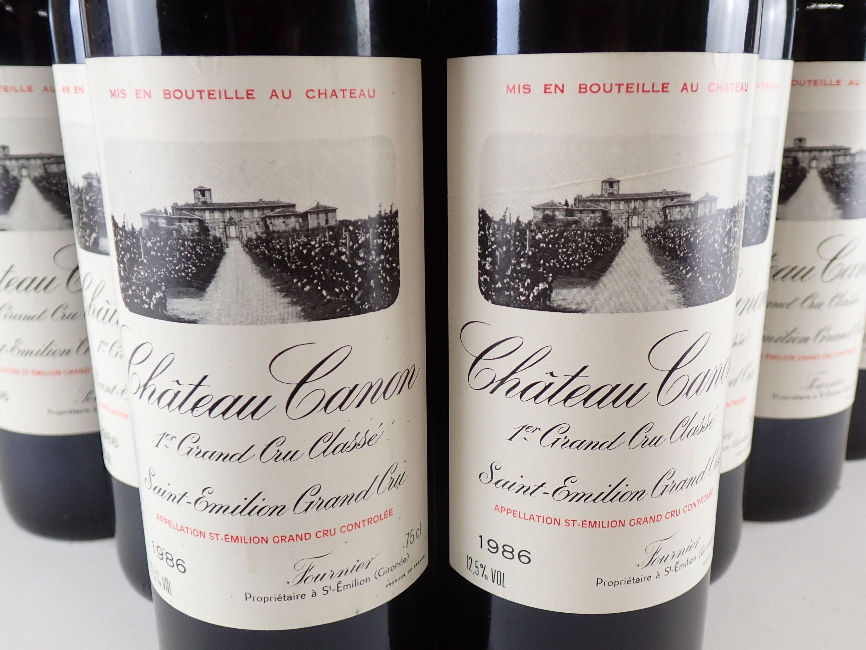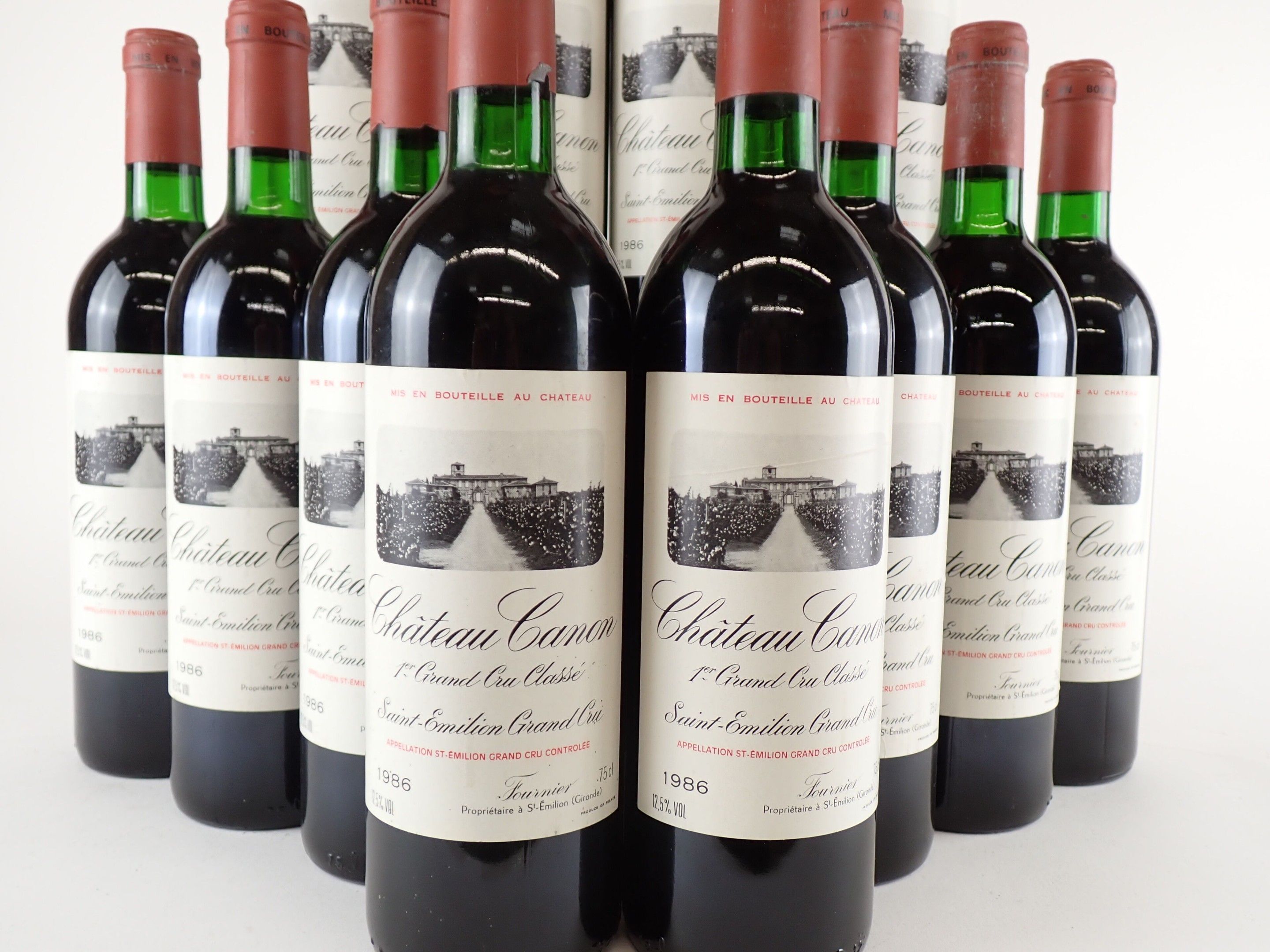 BORDEAUX - 12 bottles, Saint-Emilion Grand Cru, Château Canon, 1er Grand Cru Classé, 1986. 2 BG (+), 5 BG, 3 BG (-) and 1 TLB. Caps slightly dirty with traces of rubbing, three of which are slightly damaged at the bottom of the skirt and four slightly curved. Some light marks on the labels, one of which has a crease.