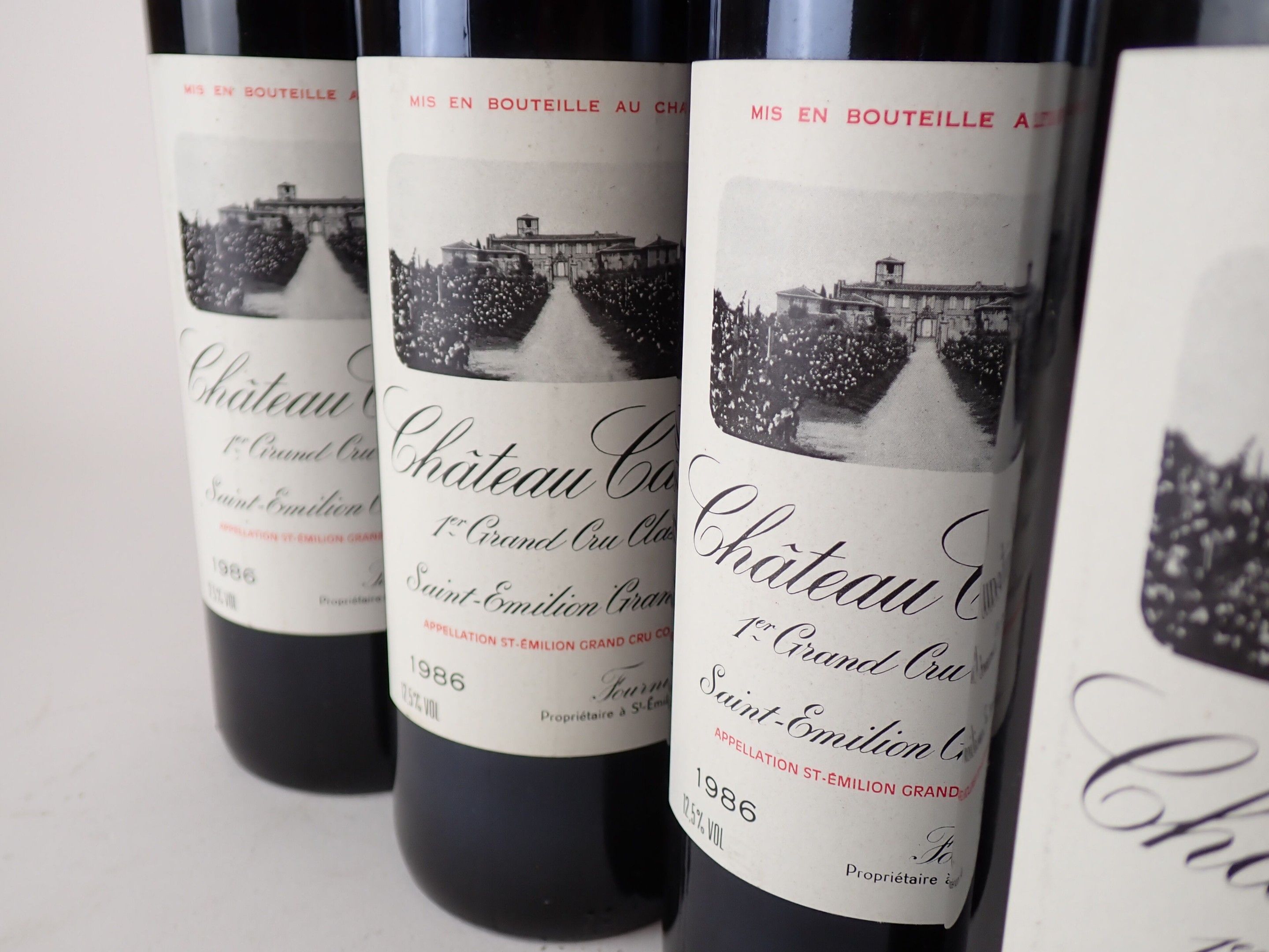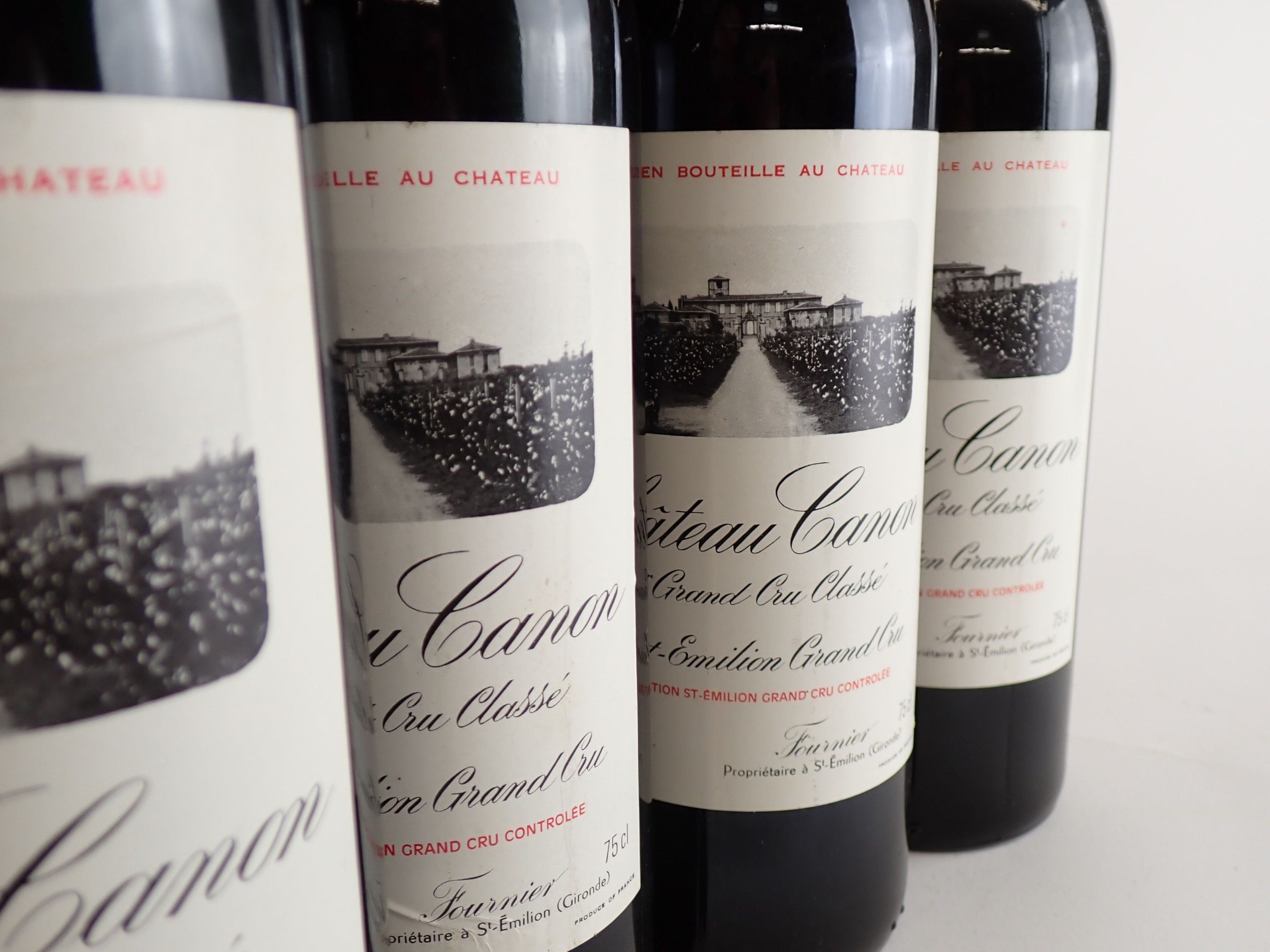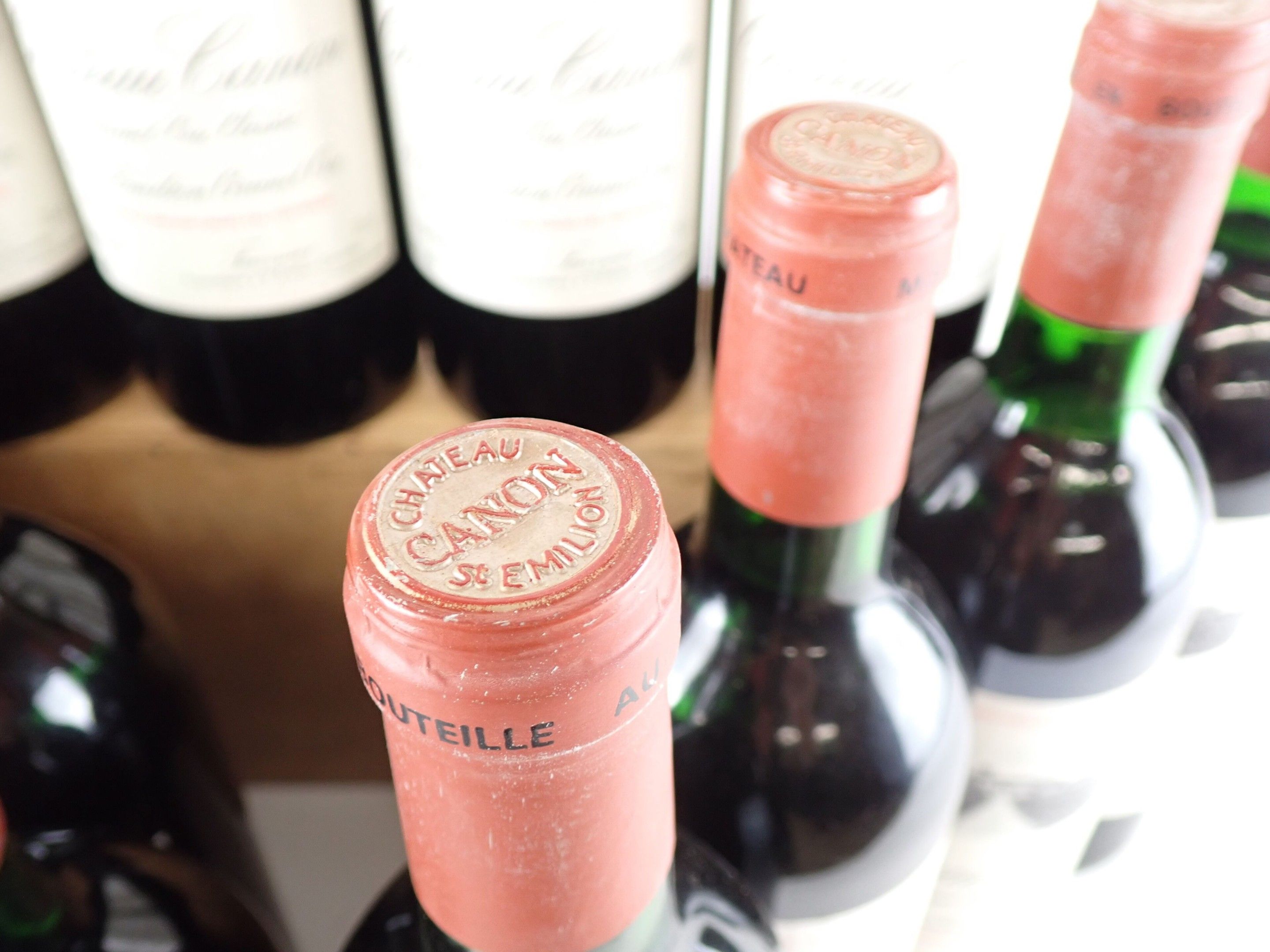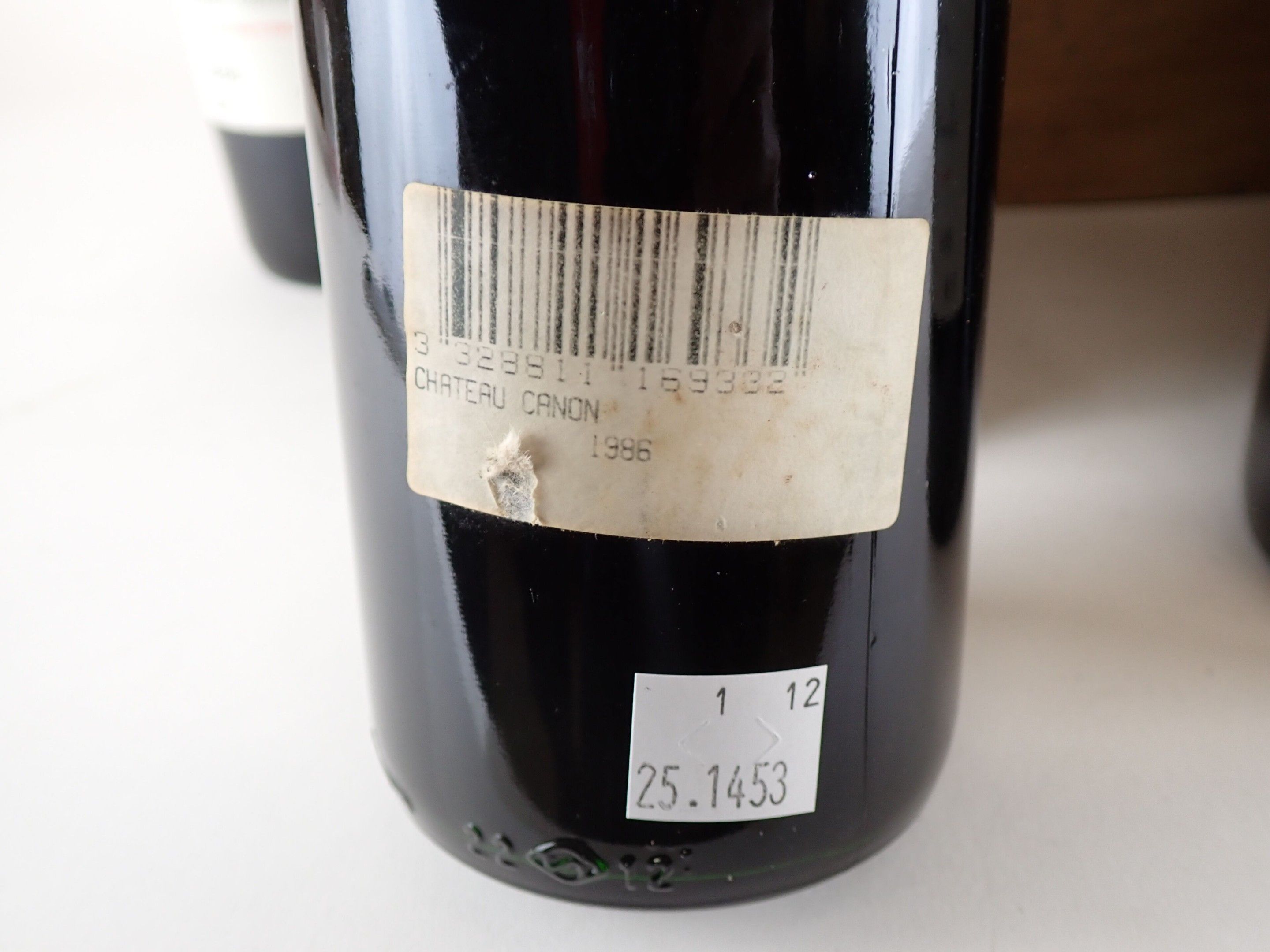 BORDEAUX - 12 bottles, Saint-Emilion Grand Cru, Château Canon, 1er Grand Cru Classé, 1986. 2 BG (+), 5 BG, 3 BG (-) and 1 TLB. Caps slightly dirty with traces of rubbing, three of which are slightly damaged at the bottom of the skirt and four slightly curved. Some light marks on the labels, one of which has a crease.