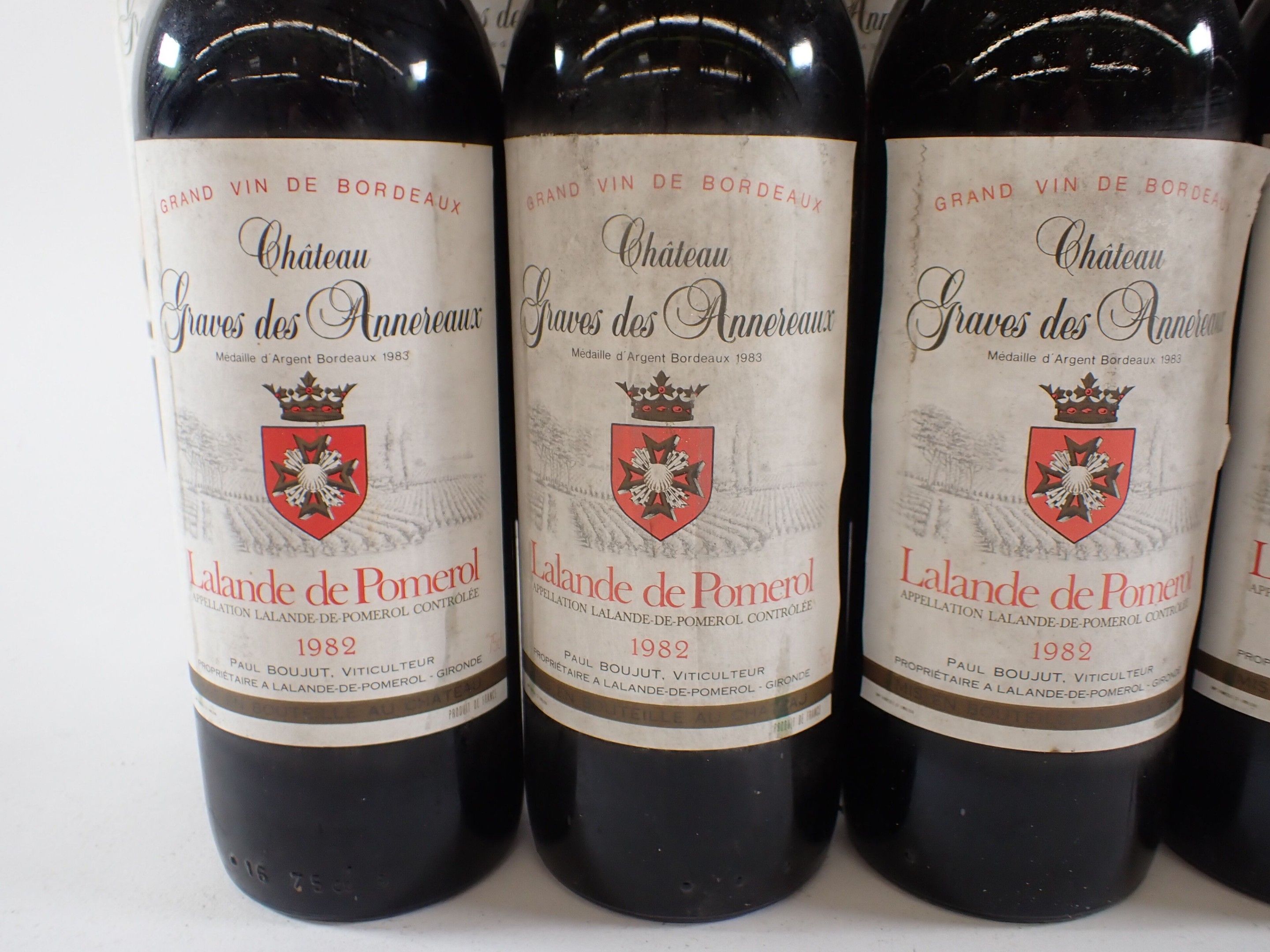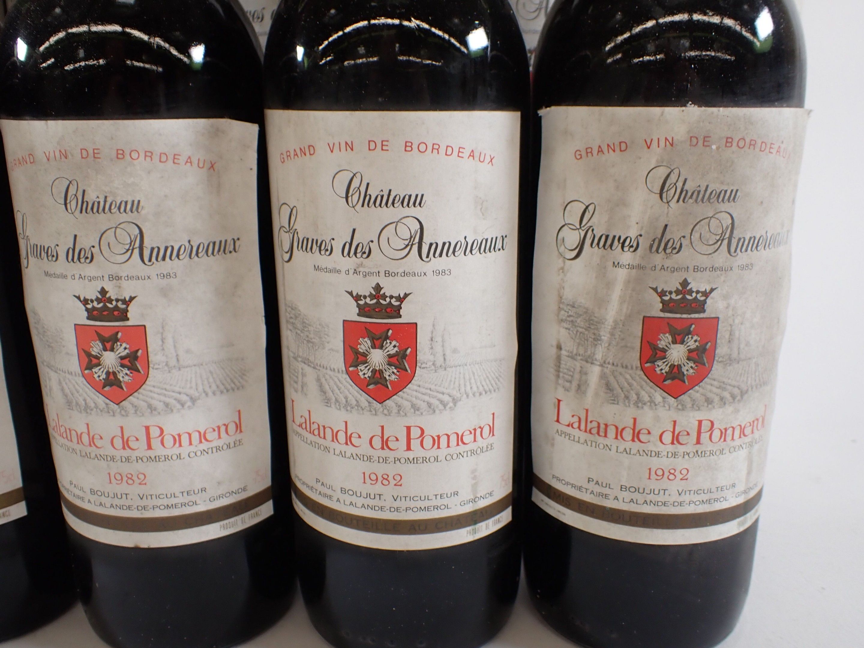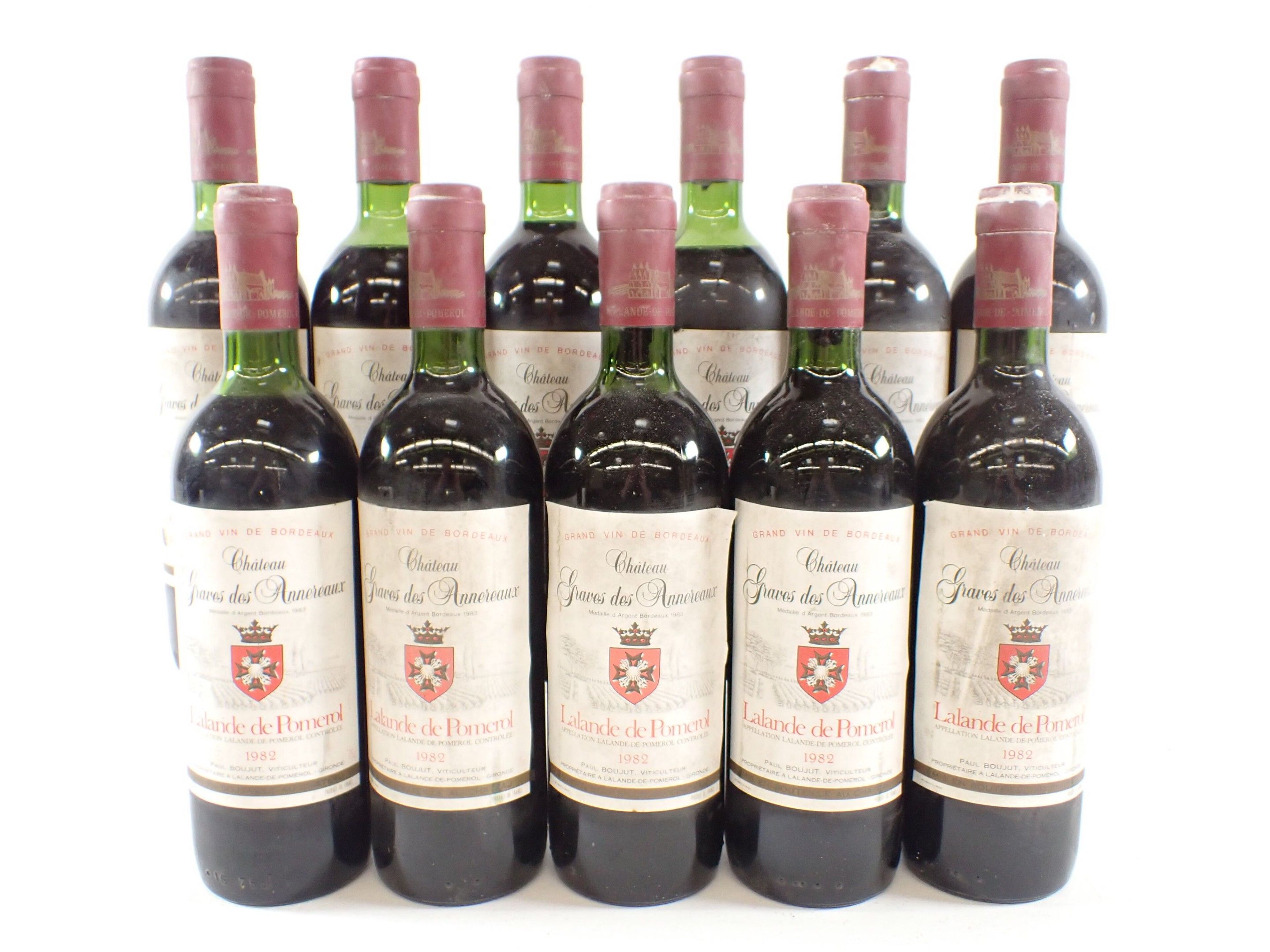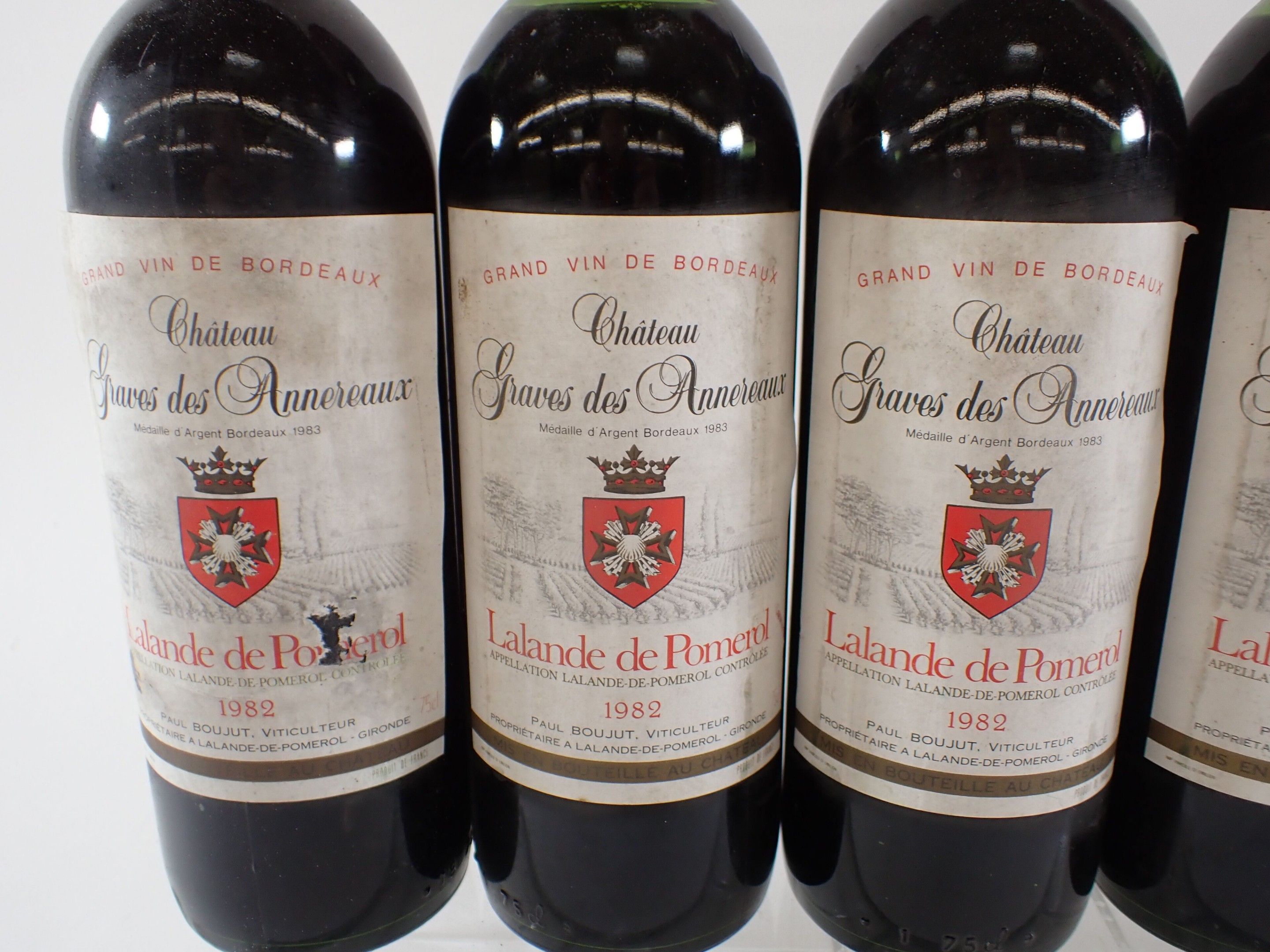 BORDEAUX - 11 bottles, Lalande-de-Pomerol, Château Graves des Annereaux, 1982. 5 BG, 1 TLB, 2 HE (+) and 2 ME (+). Caps slightly dirty to dirty. Slightly dirty to dirty labels with peeling points (one label is partially peeled off), one of which has a small tear.