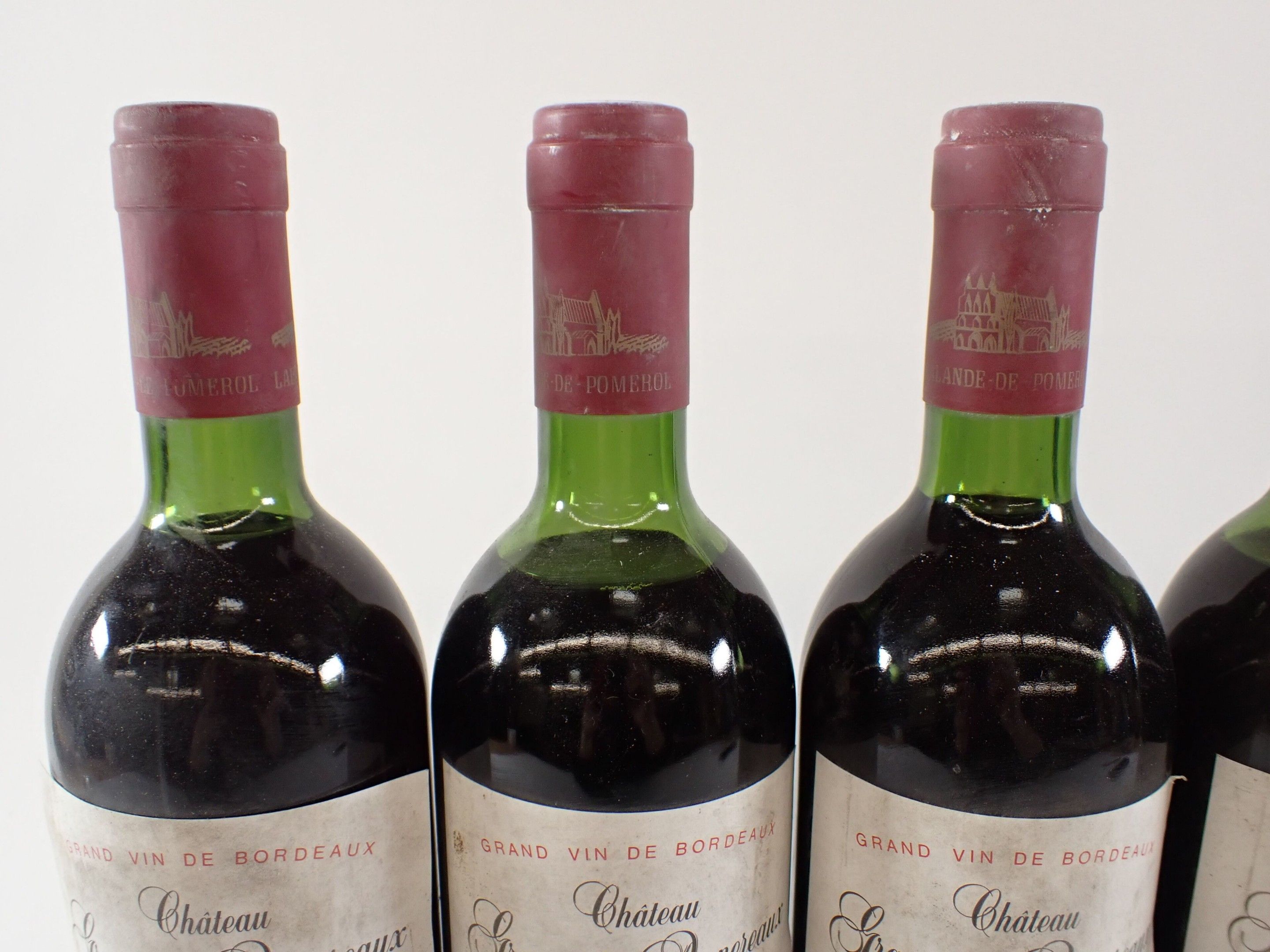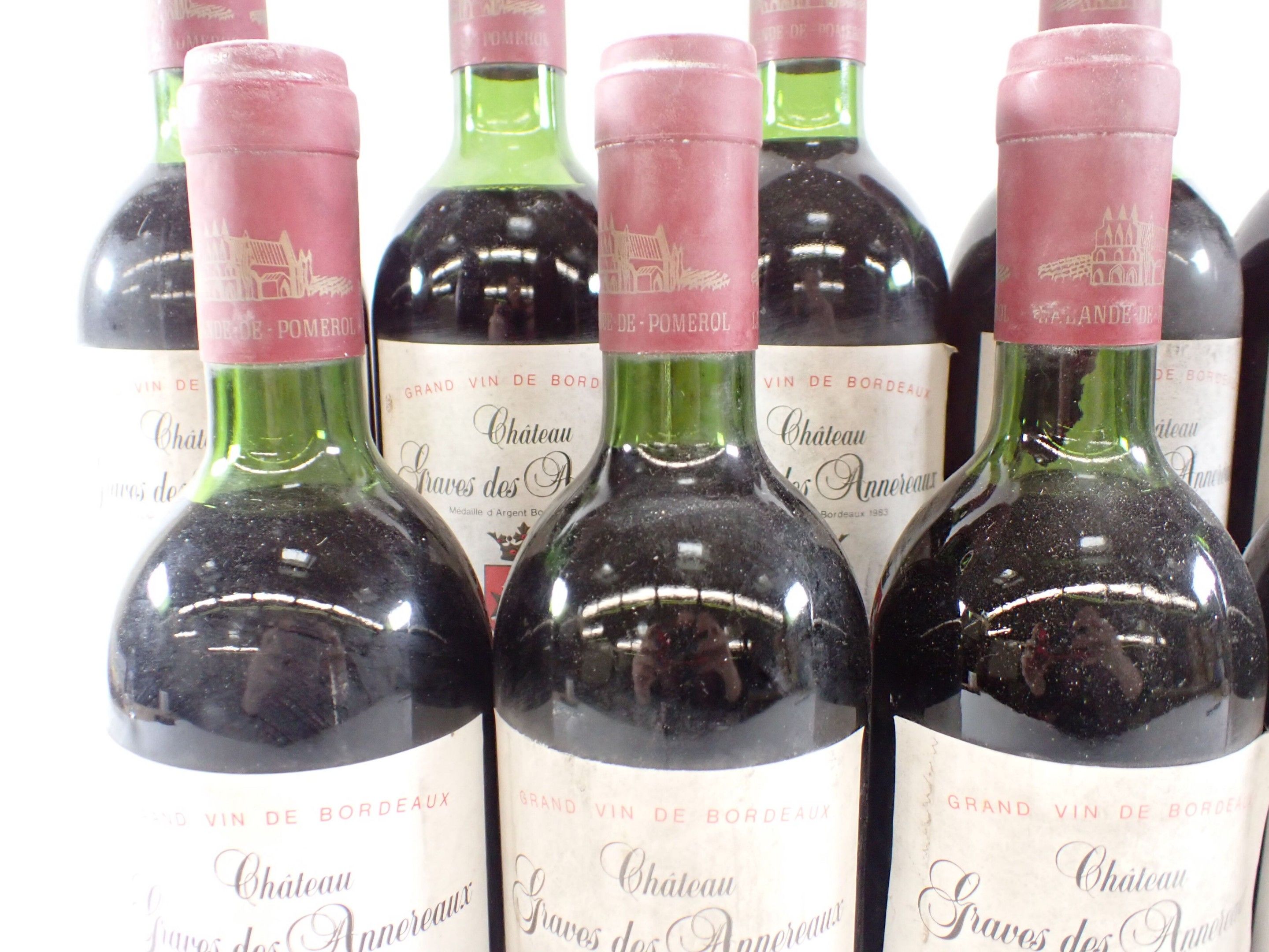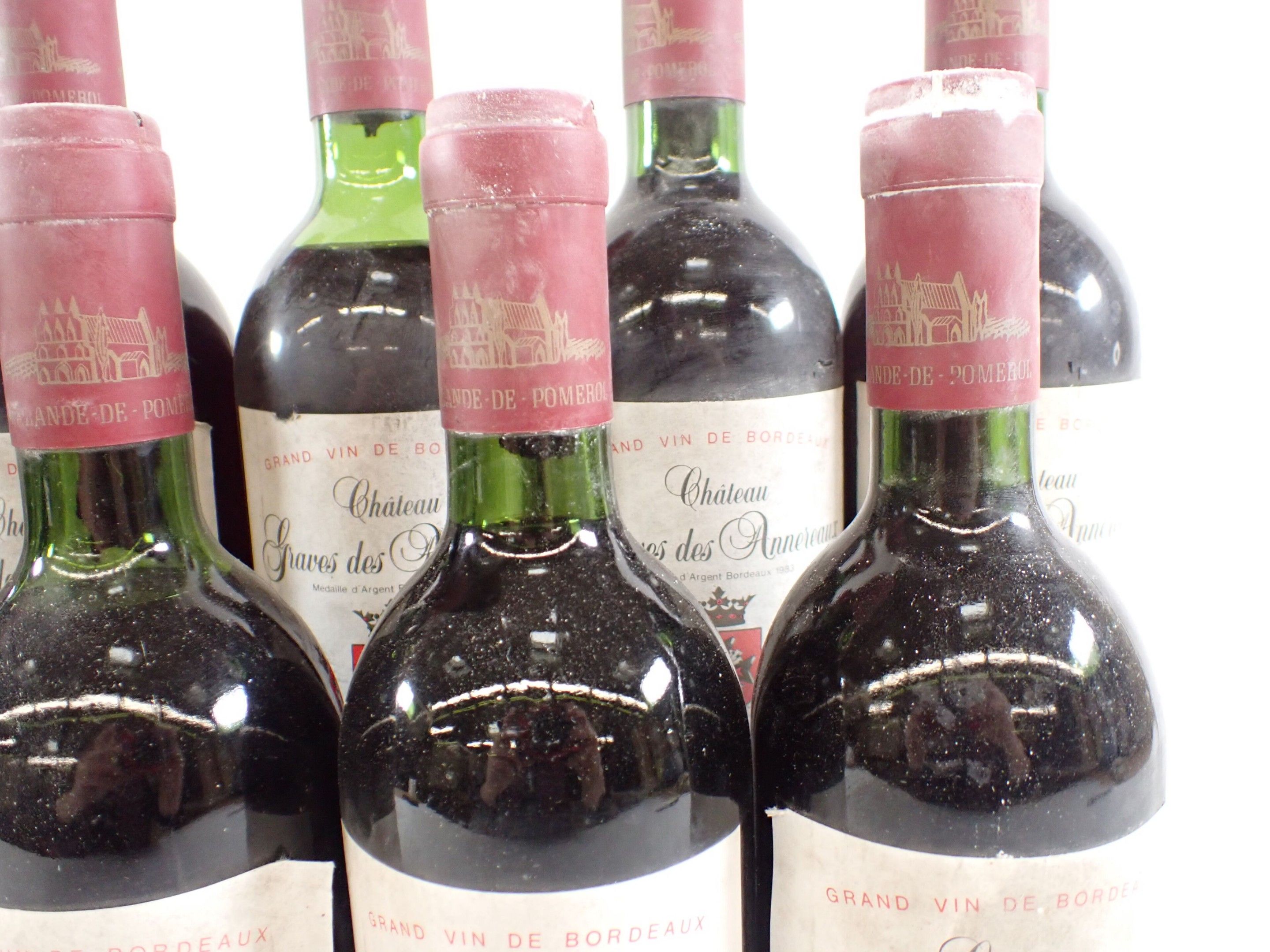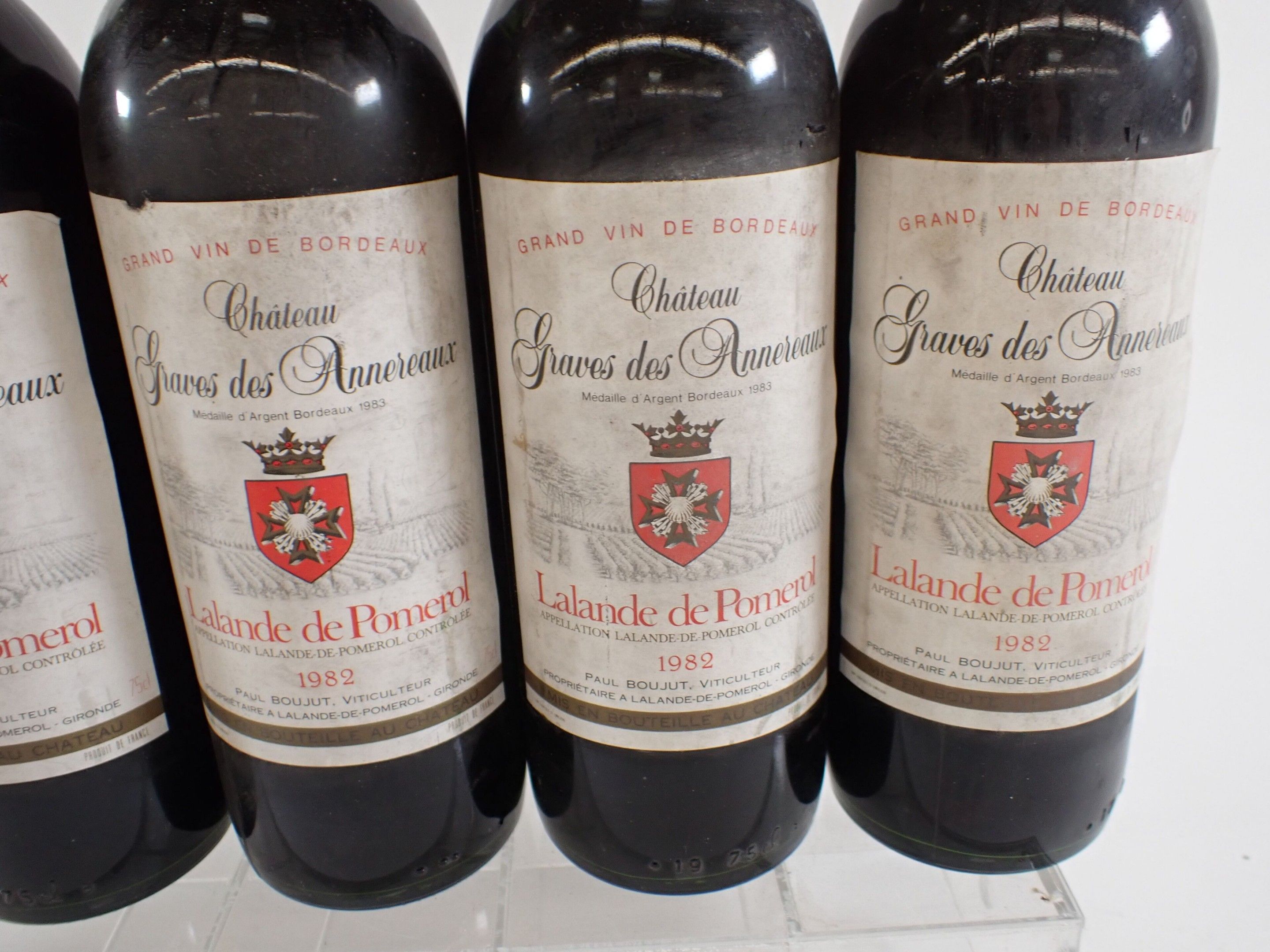 BORDEAUX - 11 bottles, Lalande-de-Pomerol, Château Graves des Annereaux, 1982. 5 BG, 1 TLB, 2 HE (+) and 2 ME (+). Caps slightly dirty to dirty. Slightly dirty to dirty labels with peeling points (one label is partially peeled off), one of which has a small tear.