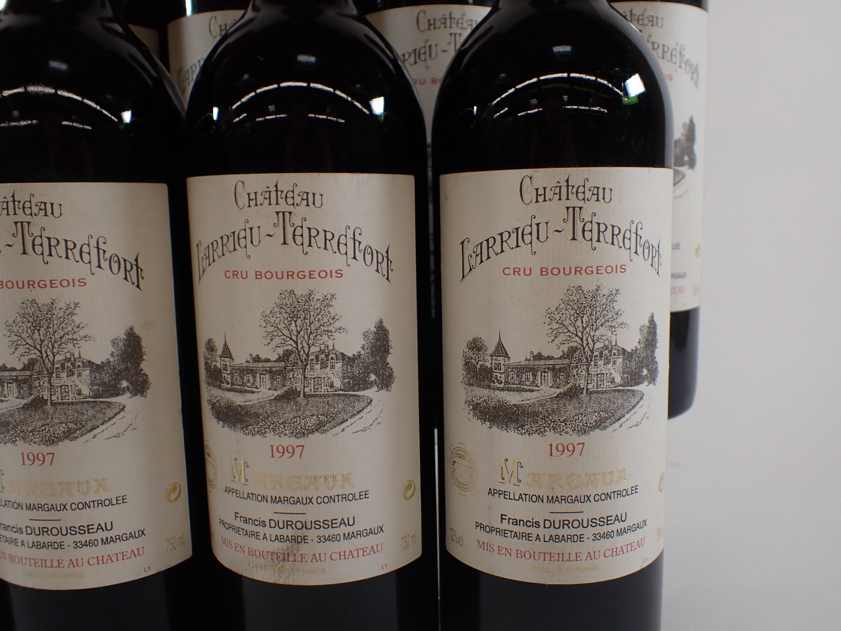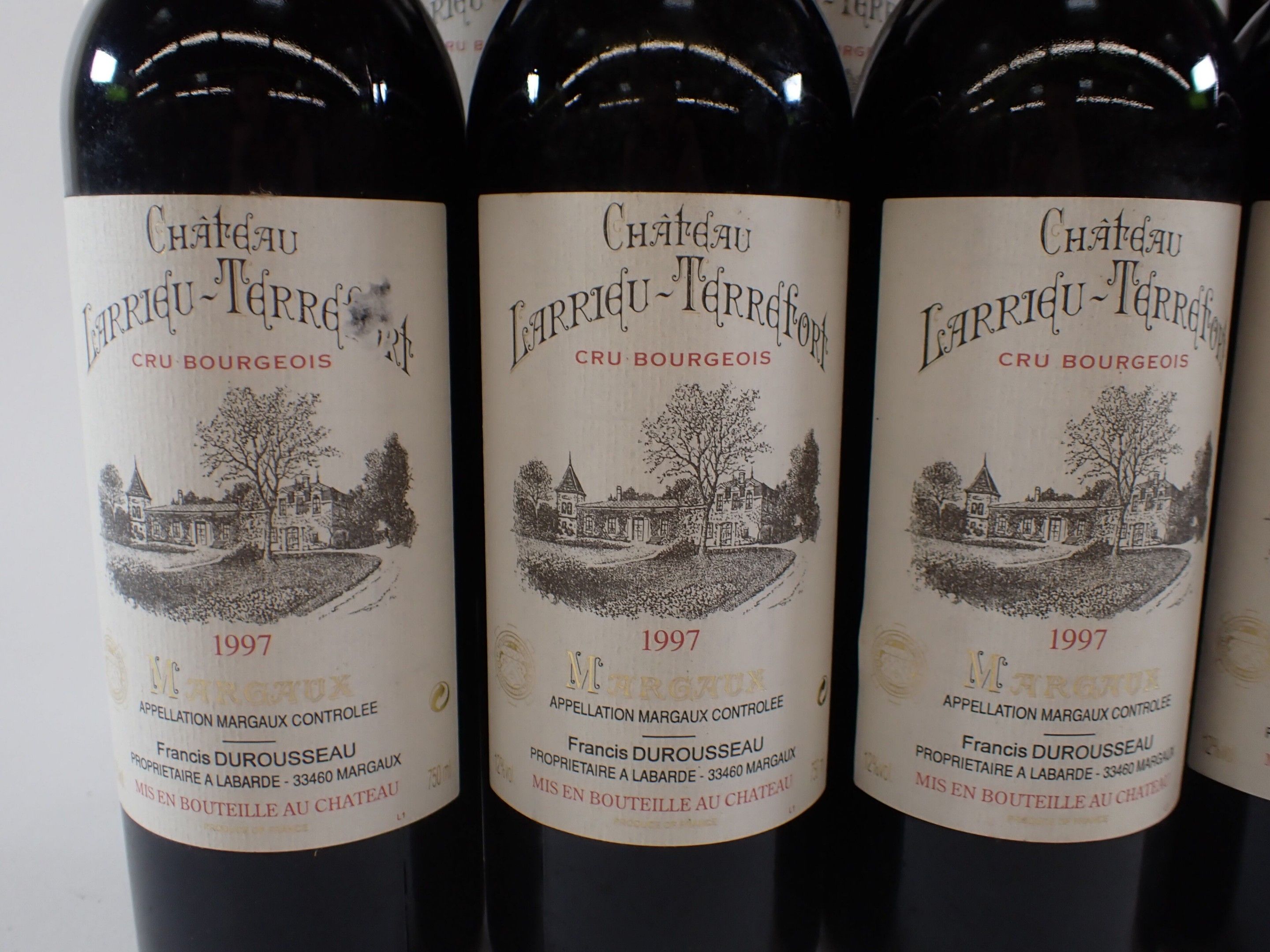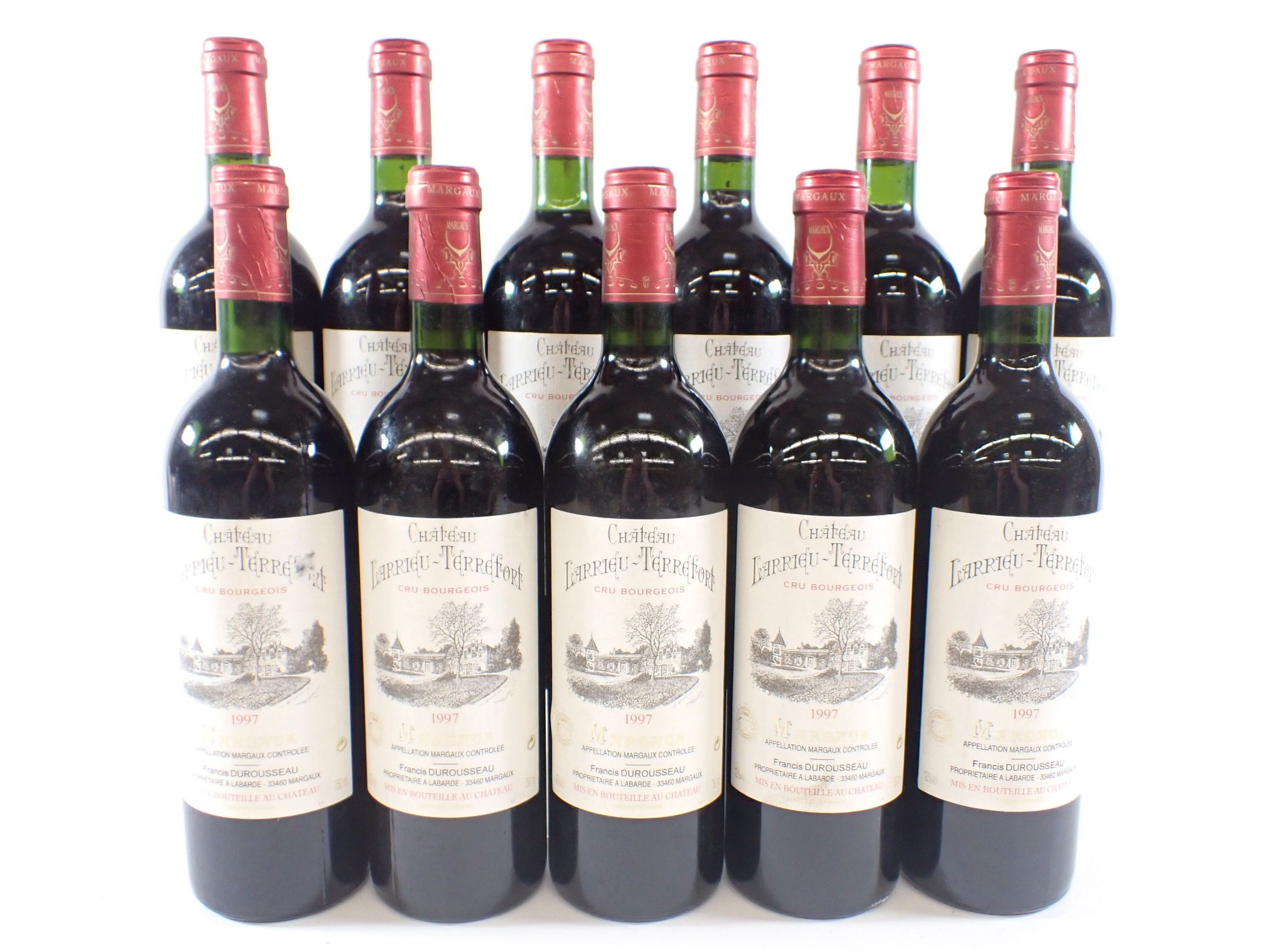 BORDEAUX - 11 bottles, Margaux, Château Larrieu-Terrefort, Cru Bourgeois, 1997. 1 BG. Caps slightly bent. Labels with a few light marks, three of which are also slightly damaged.