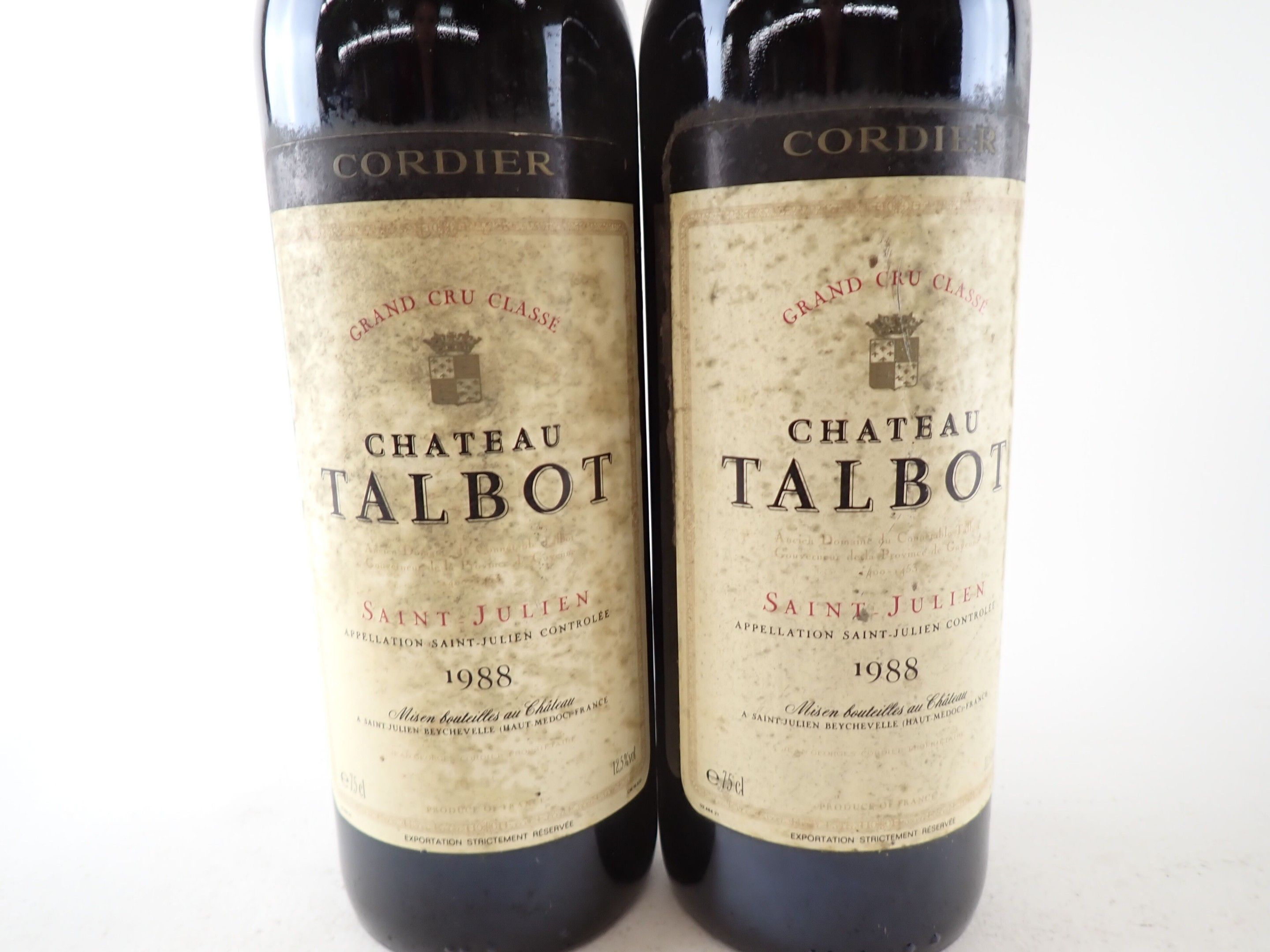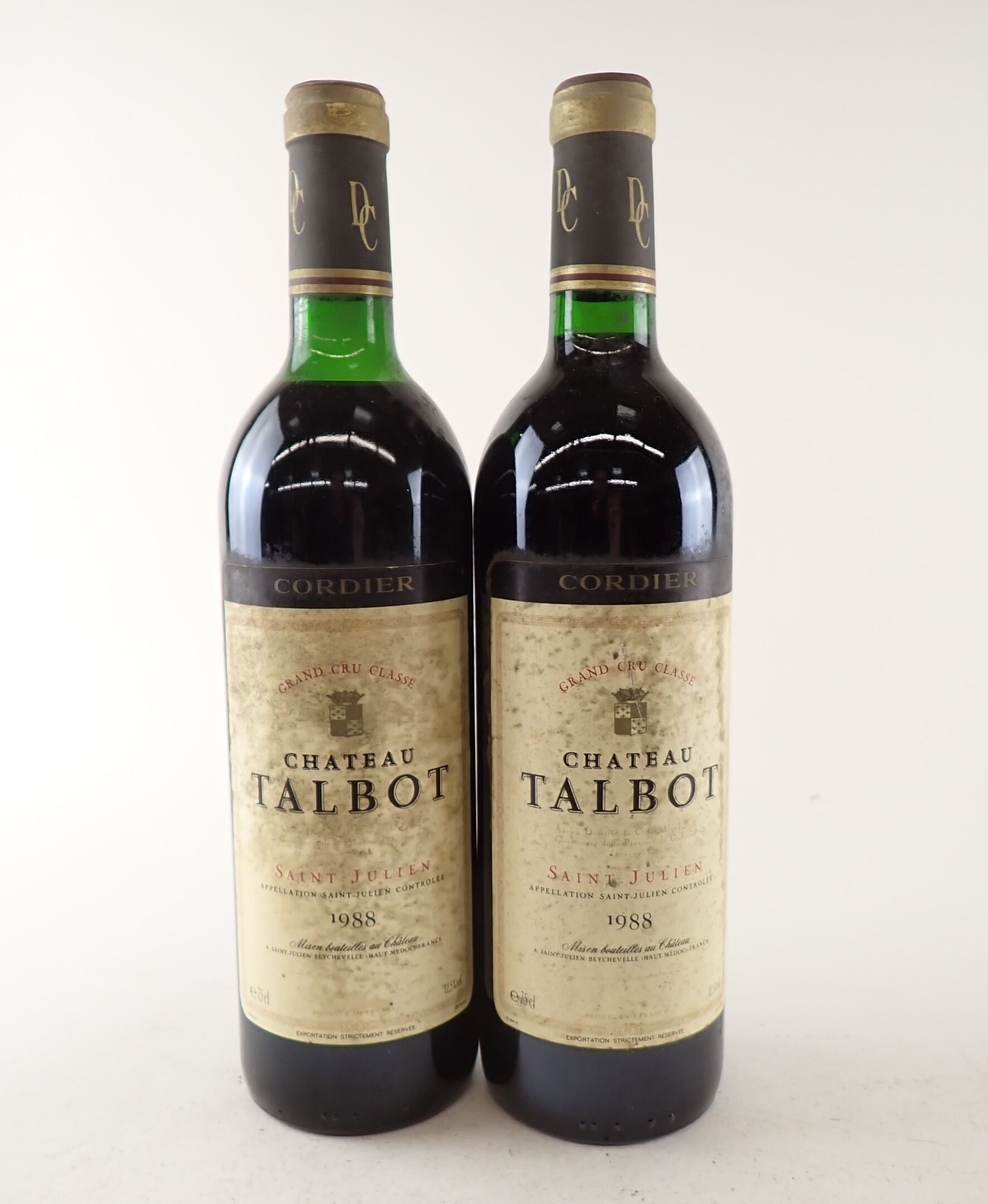 BORDEAUX - 2 bottles, Saint Julien, Château Talbot, 4th Grand Cru Classé, 1988. 1 BG (+) and 1 HE (+). Caps slightly dirty. Dirty labels.